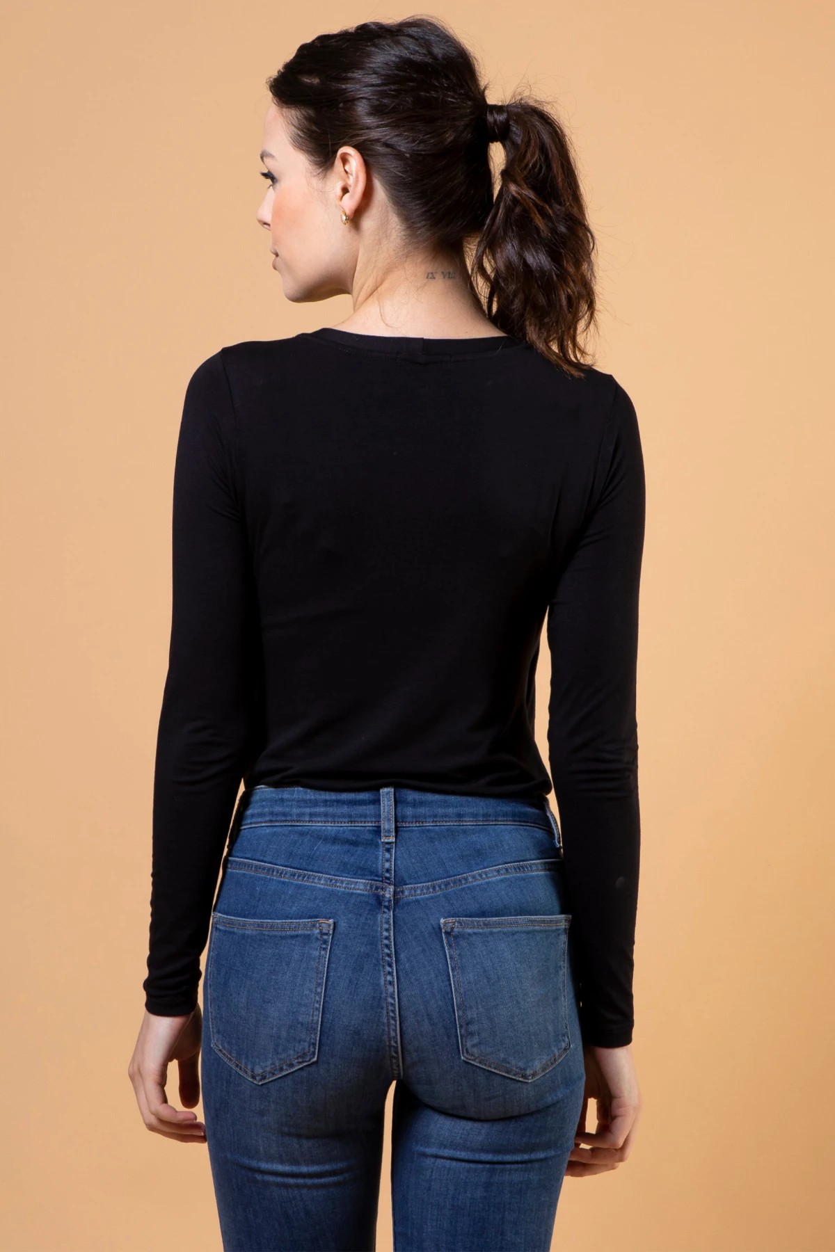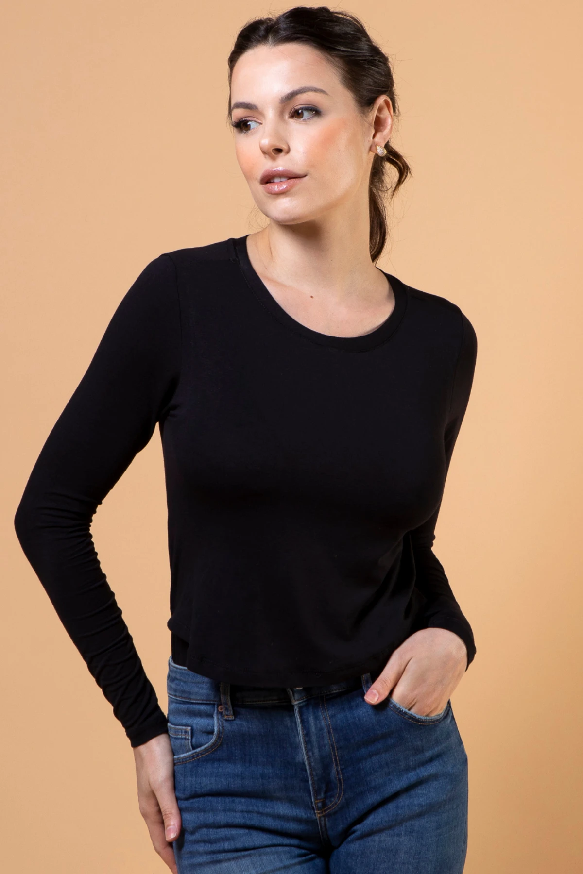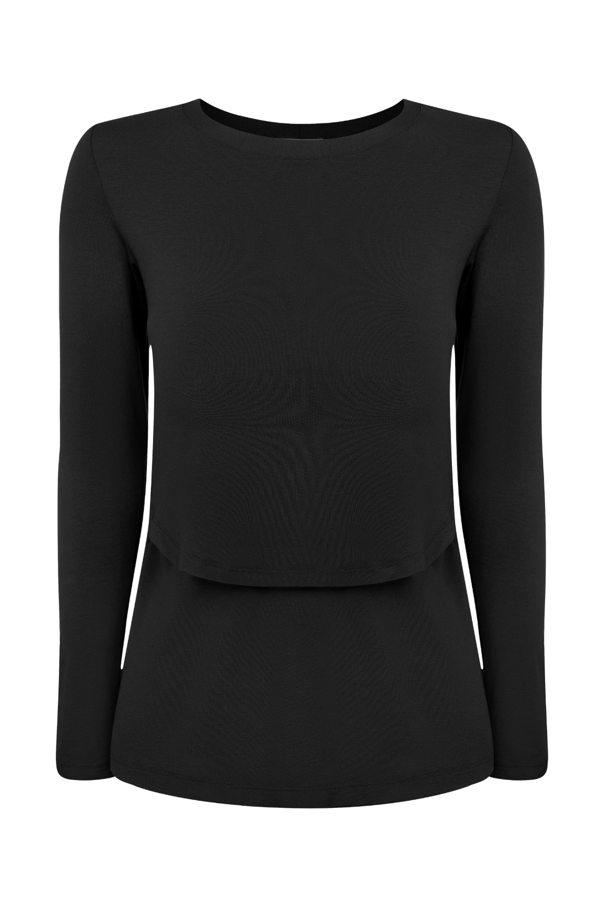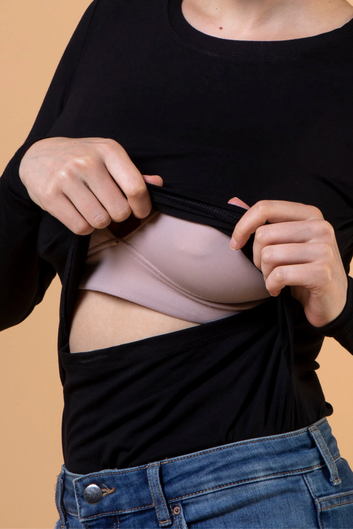A Blusa Prática Manga Longa — Gestante e Amamentação une versatilidade e discrição: duas camadas que permitem usar a peça no comprimento normal ou como cropped, e uma sobreposição em “U” no busto para facilitar a amamentação com privacidade.