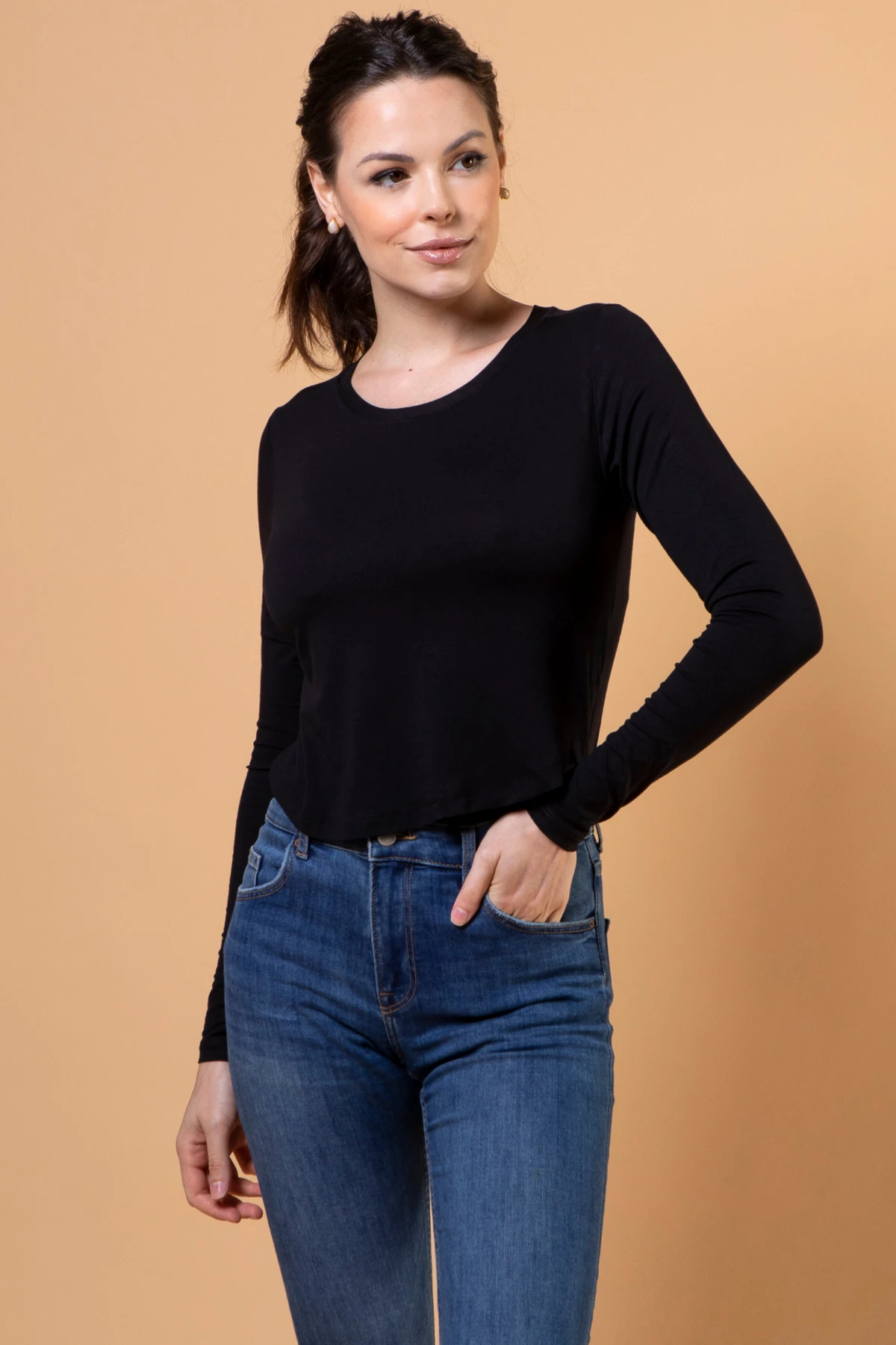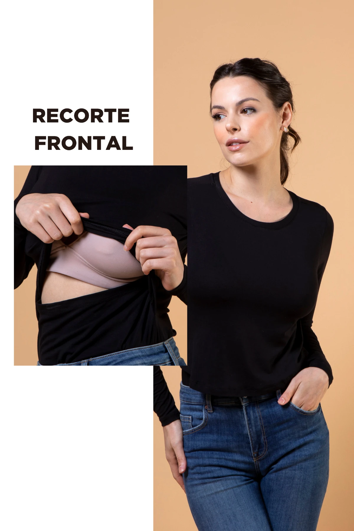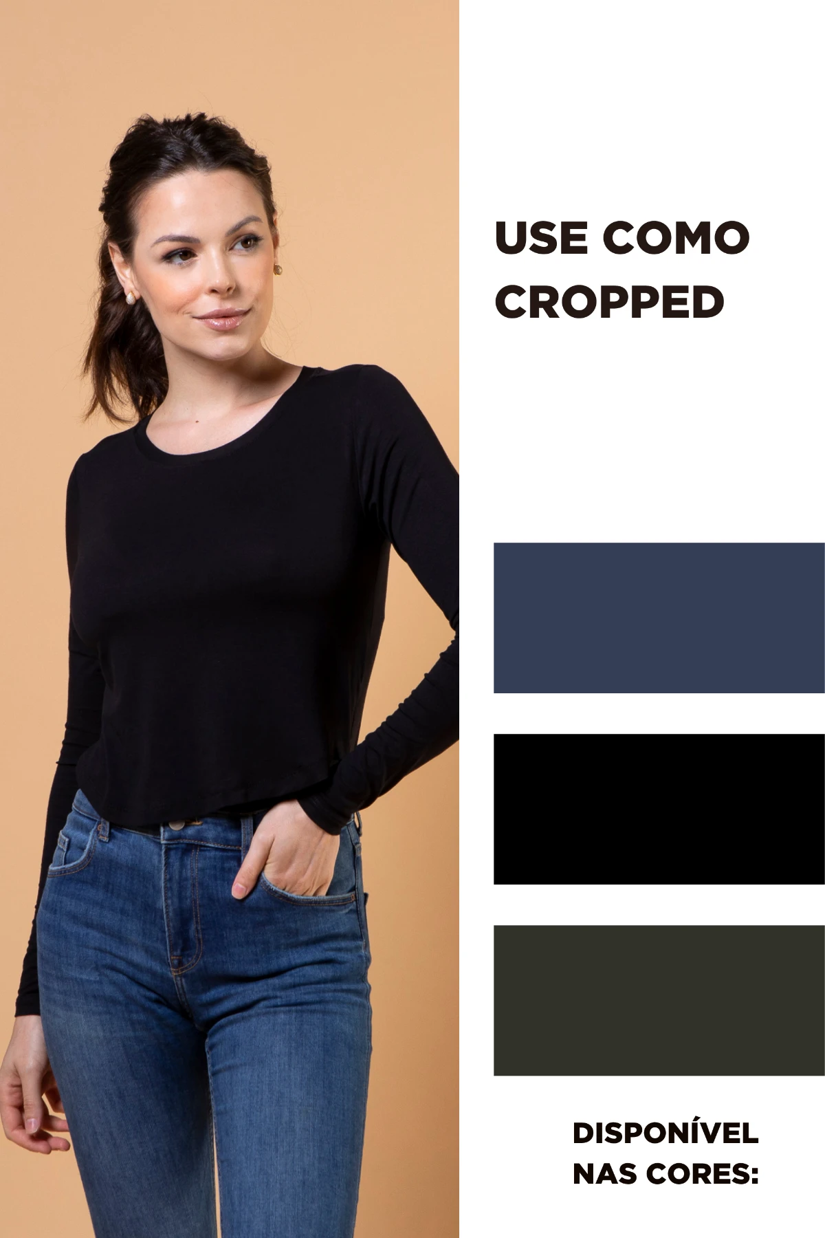 Dessa forma, você tem duas formas de uso (cropped ou comprimento normal) e acesso rápido e reservado para amamentar — tudo sem perder o acabamento e o caimento da peça.
