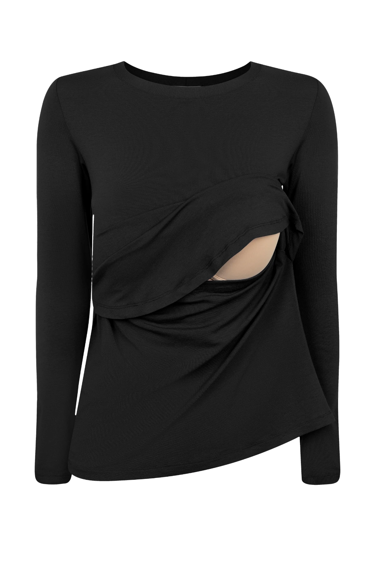 Por isso criamos esta blusa com duas camadas: a camada superior funciona como sobreposição e esconde discretamente uma abertura em “U” no busto.