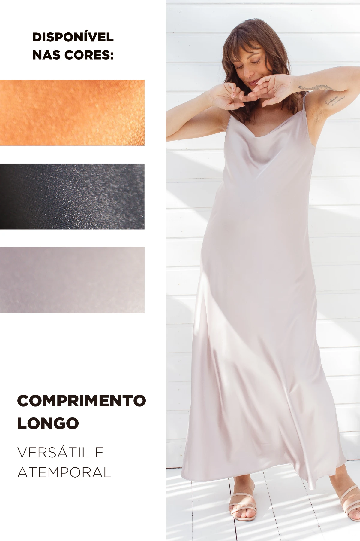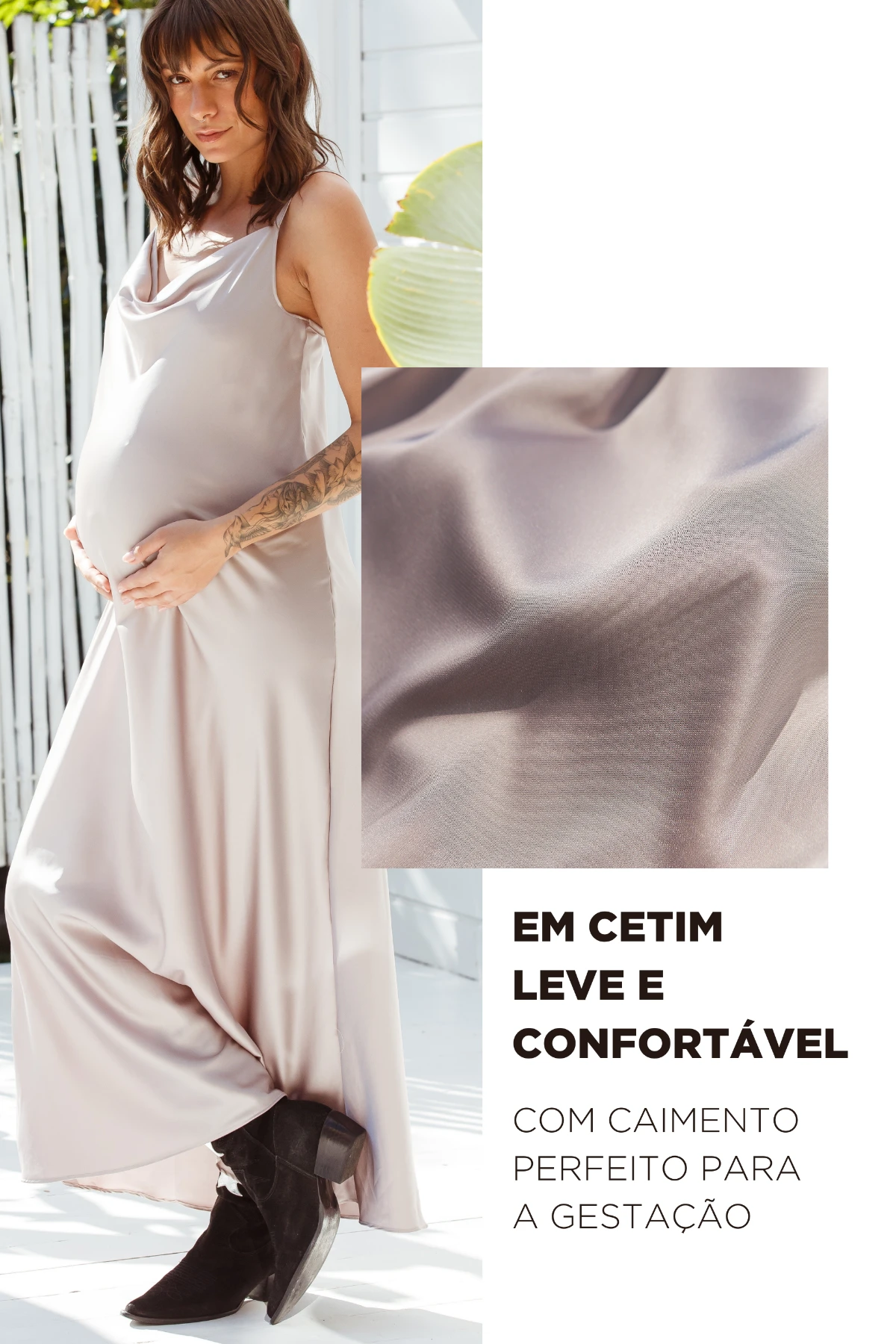 O Vestido Slip Dress é um clássico. Nosso modelo é confeccionado em cetim, com modelagem e caimento ideais para acompanhar sua gestação. Possui decote drapeado, costas reta e alças finas reguláveis para ajustes se necessários. O comprimento é longo. É a combinação perfeita para todas as ocasiões, como ensaio fotográfico e eventos especiais. Para o dia a dia, combine com tênis para deixar a composição mais casual.