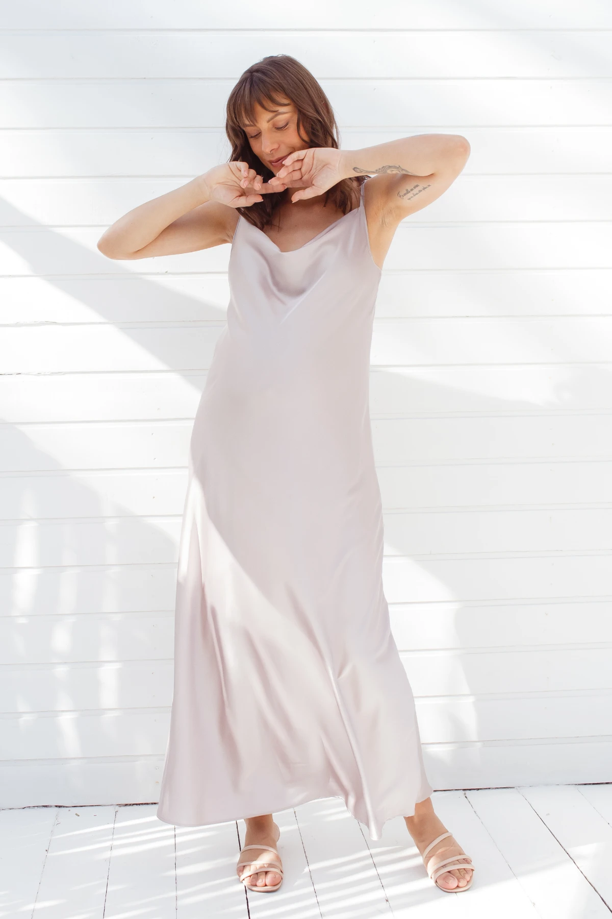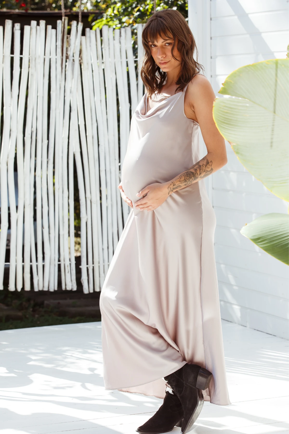 O Vestido Slip Dress é um clássico. Nosso modelo é confeccionado em cetim e tem modelagem e caimento ideais para acompanhar a sua gestação. Possui decote drapeado, costas retas e comprimento longo. É uma peça perfeita para ensaio gestante e os mais diversos eventos.