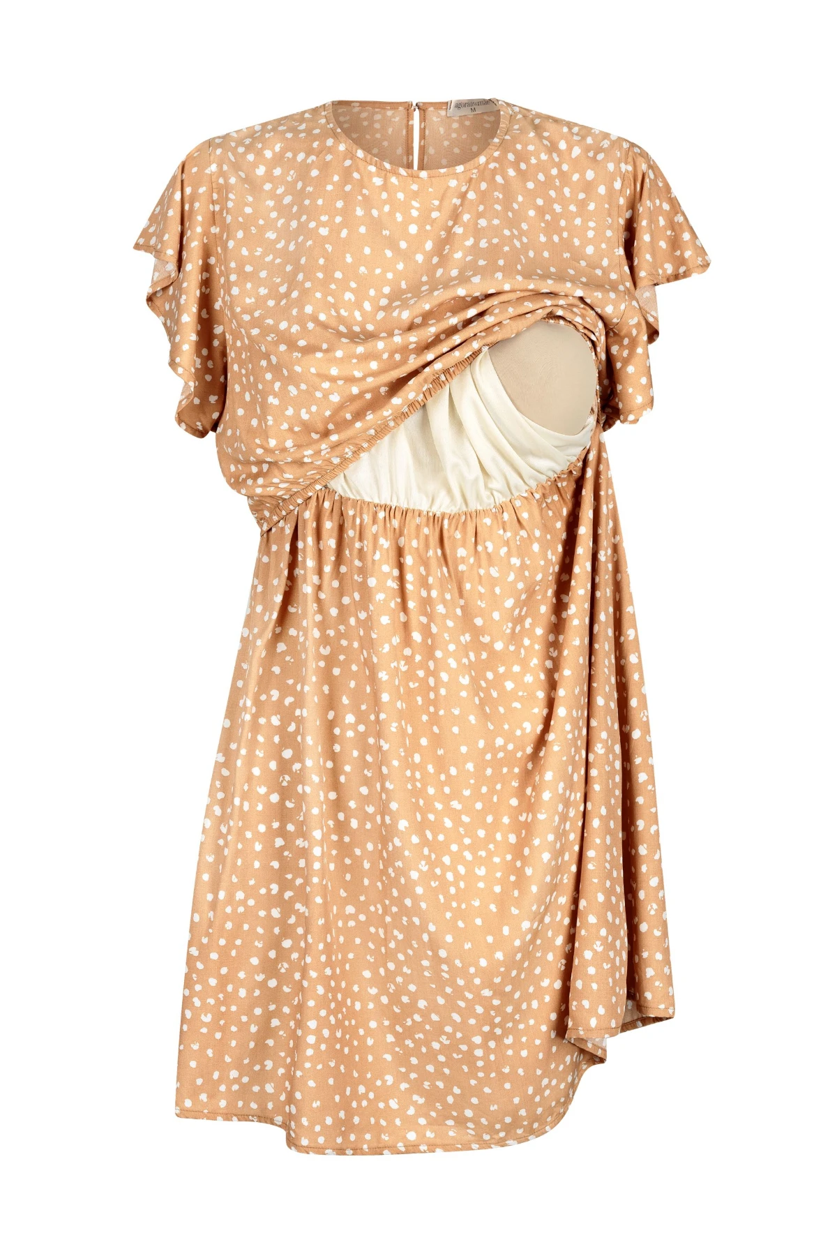 Babados na barra trazem movimento; fechamento com botão nas costas facilita vestir. Versátil para gestação, amamentação e ocasiões diversas.