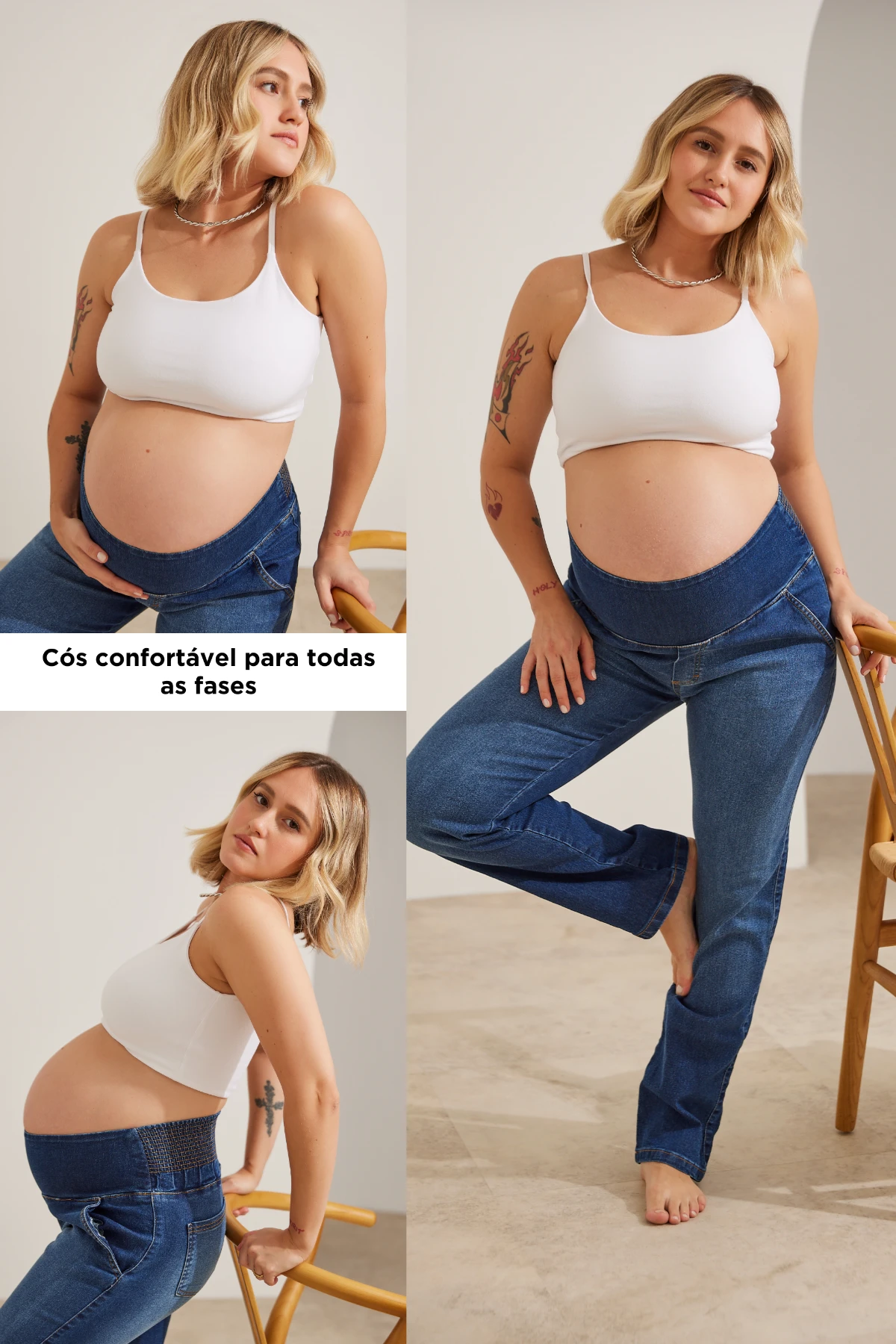 Jeans rígidos que apertam a barriga, perdem o conforto ou deixam de servir logo cedo são uma dor comum na maternidade — tiram a praticidade do dia a dia e limitam combinações de looks.