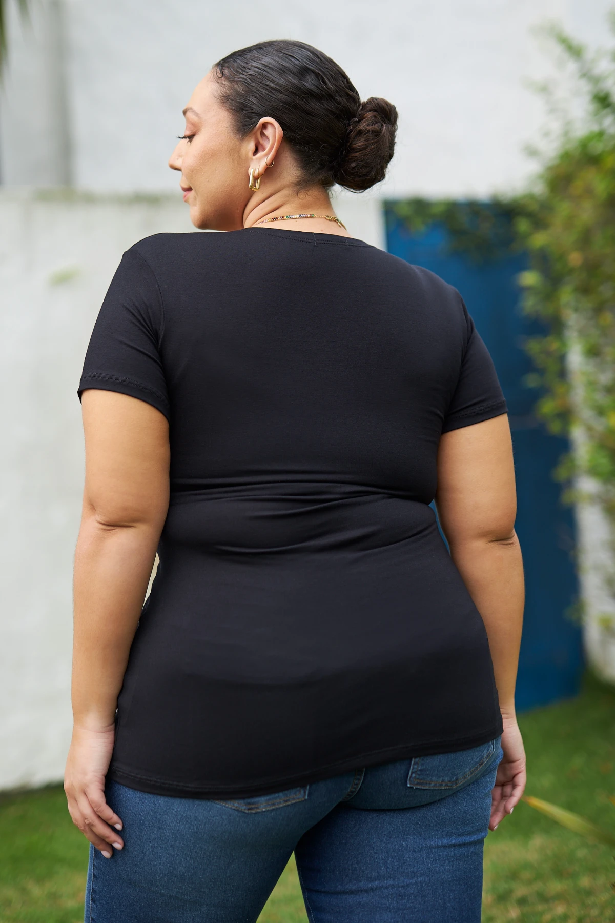 Por isso a Blusa Gestante e Amamentação Manga Curta com Transpasse foi pensada para acompanhar o corpo: o tecido estica conforme a barriga cresce e não fica largo depois, e o decote em V com transpasse facilita a amamentação com discrição.
