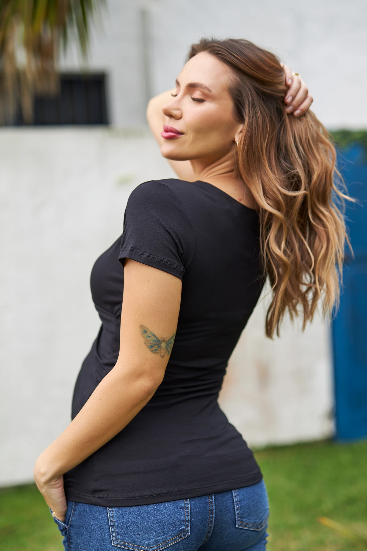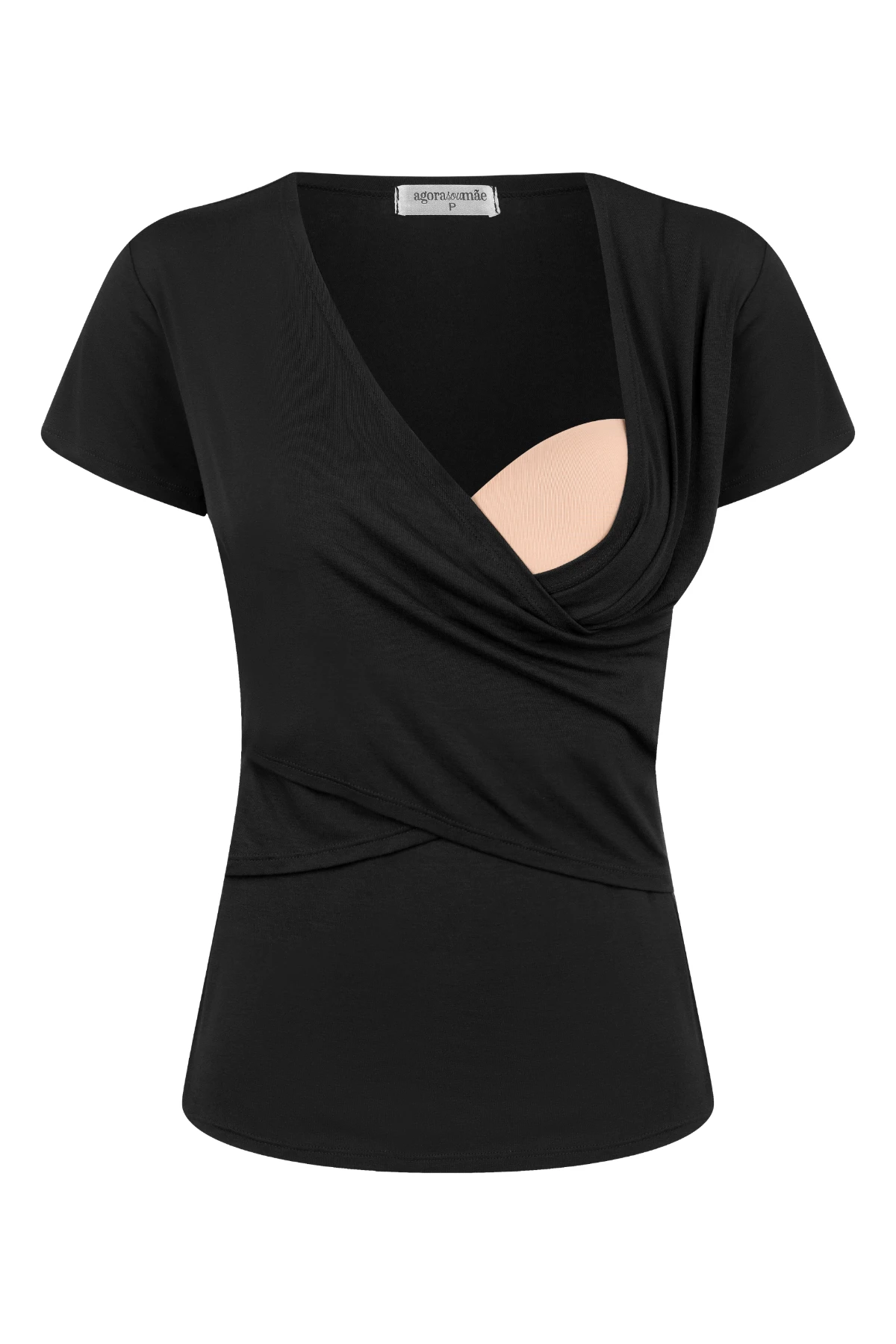 Dessa forma, a blusa une ajuste inteligente e facilidade de uso: o tecido com elasticidade controlada estica onde o corpo precisa e recupera a forma, evitando que a peça fique larga depois do parto. O transpasse em V foi projetado para oferecer acesso rápido e discreto ao seio, sem comprometer o acabamento da peça.
