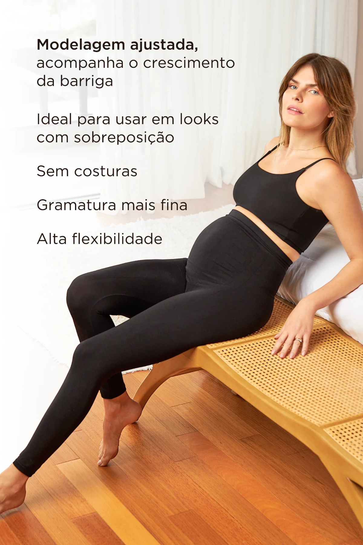 Por isso criamos uma legging que some no corpo: a malha seamless em poliamida, de gramatura mais fina e ultra flexível, entrega ajuste contínuo sem costuras externas que causem atrito. Ela veste como uma segunda pele, acomodando a barriga sem apertos e recuperando a forma com facilidade.