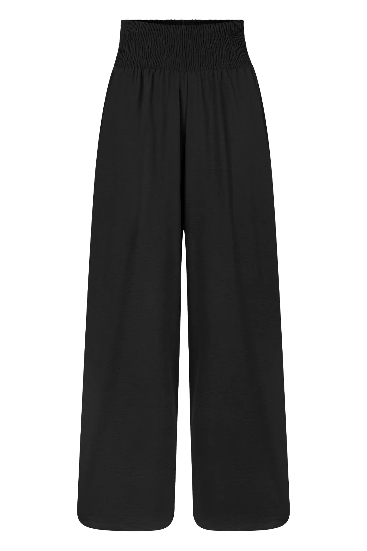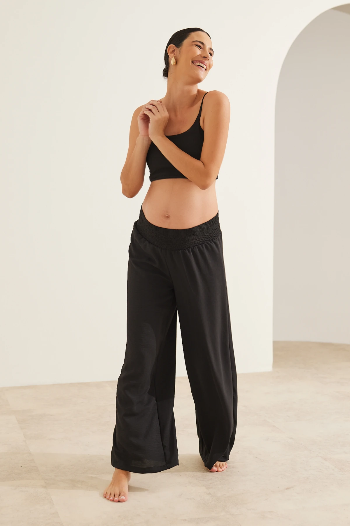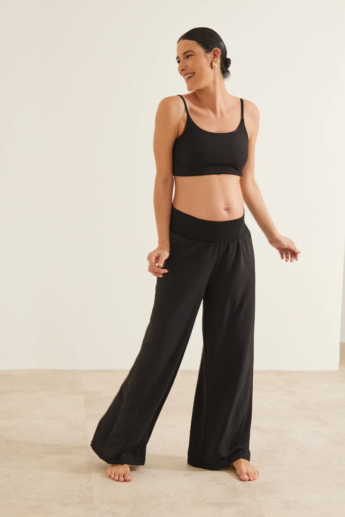 Calça soltinha em tecido leve, com cós em lastex que se ajusta à gestação.