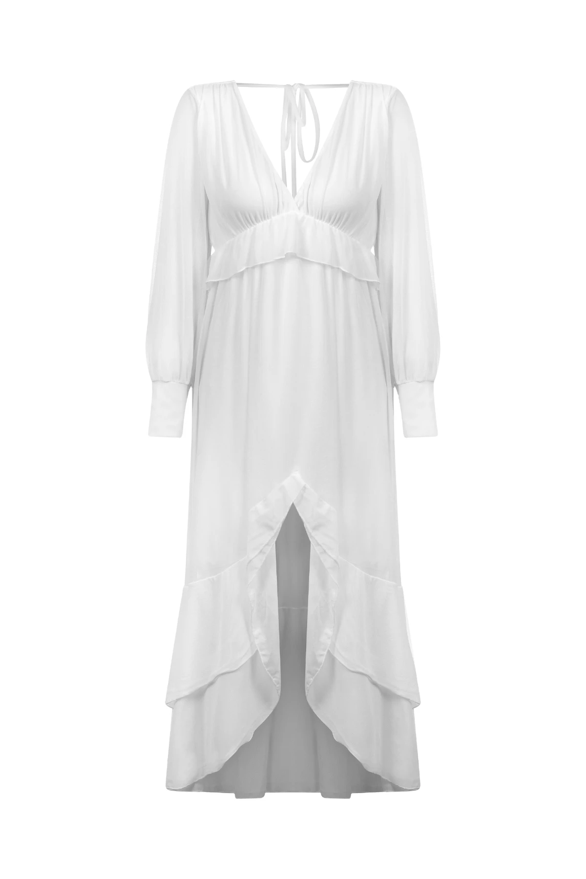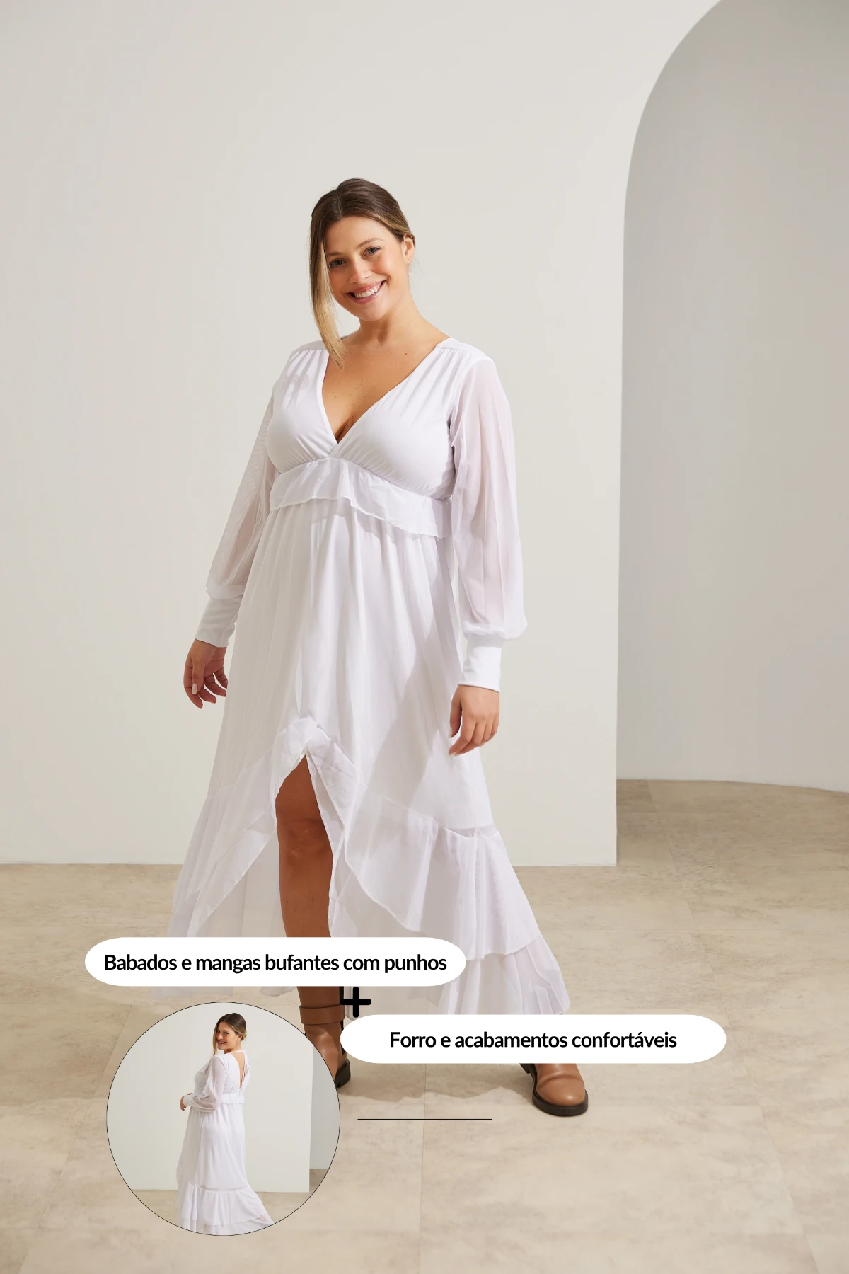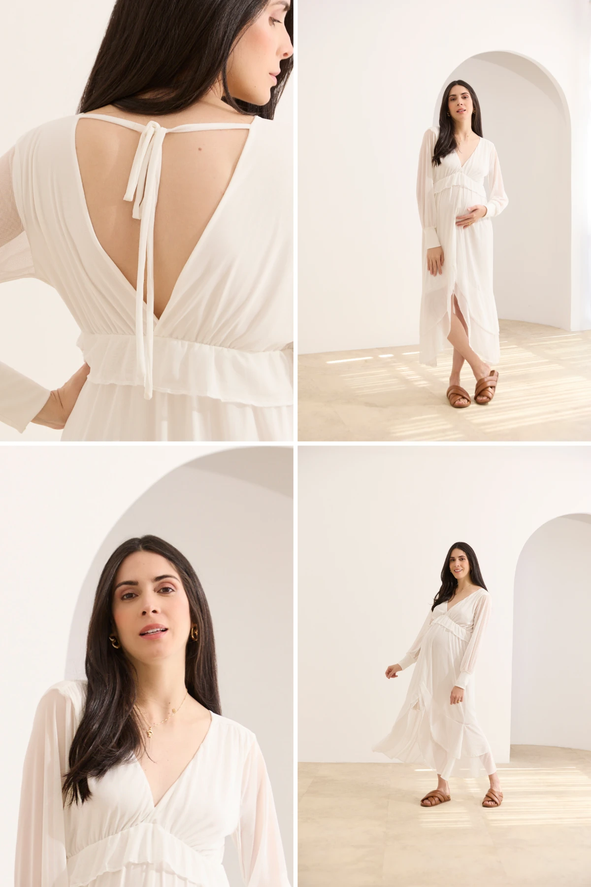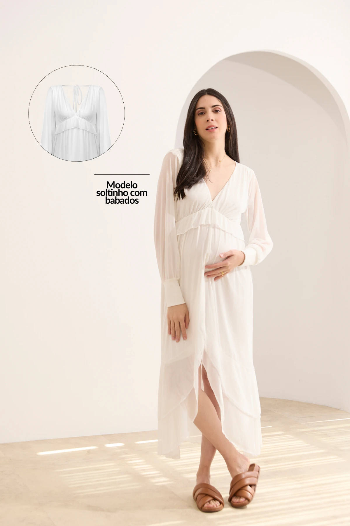 Produzido em tule leve com caimento fluido traz conforto durante todas as fases. Modelagem soltinha que valoriza a barriga sem apertar. Decote em V funcional que permite amamentar com praticidade. Babados e mangas bufantes dão movimento ao vestido. Ideal para todos os momentos.