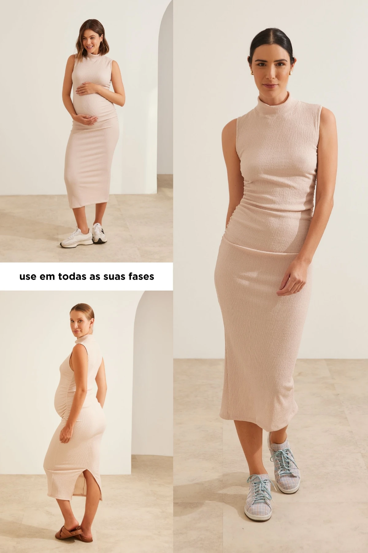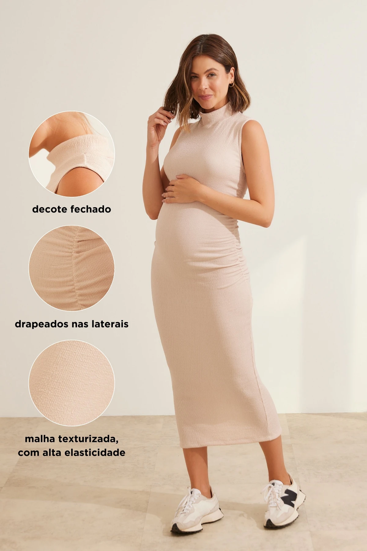 Vestido comprimento midi, sem mangas, com fenda na barra traseira e drapeados nas laterais. A modelagem é ajustada ao corpo e acompanha o crescimento da barriga até o final da gestação.