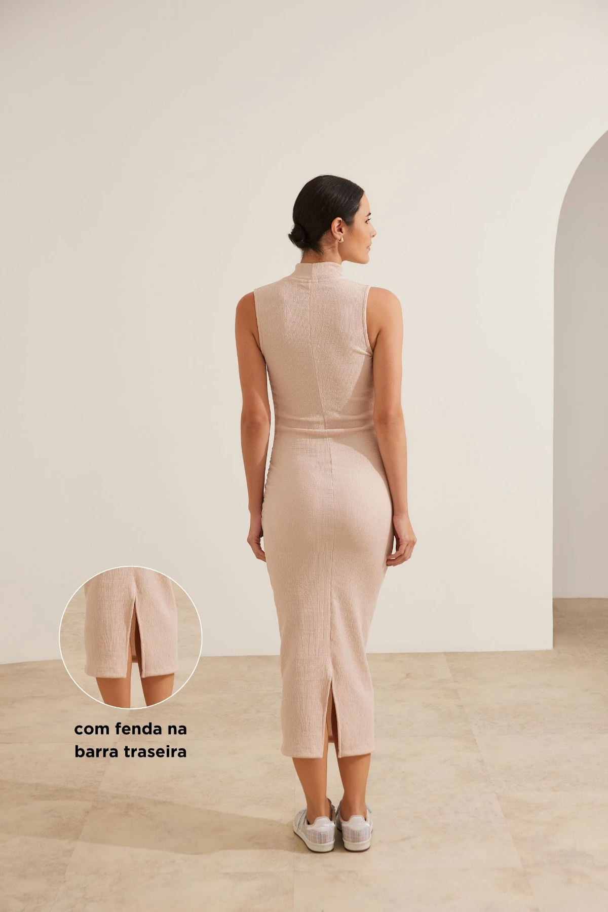 Vestido comprimento midi, sem mangas, com drapeados nas laterais e fenda na barra na parte traseira, que deixa a peça com uma elegância a mais. A modelagem é ajustada ao corpo com elastano, que destaca as curvas de forma sutil e confortável. Foi pensado para ser usado durante toda a gestação.