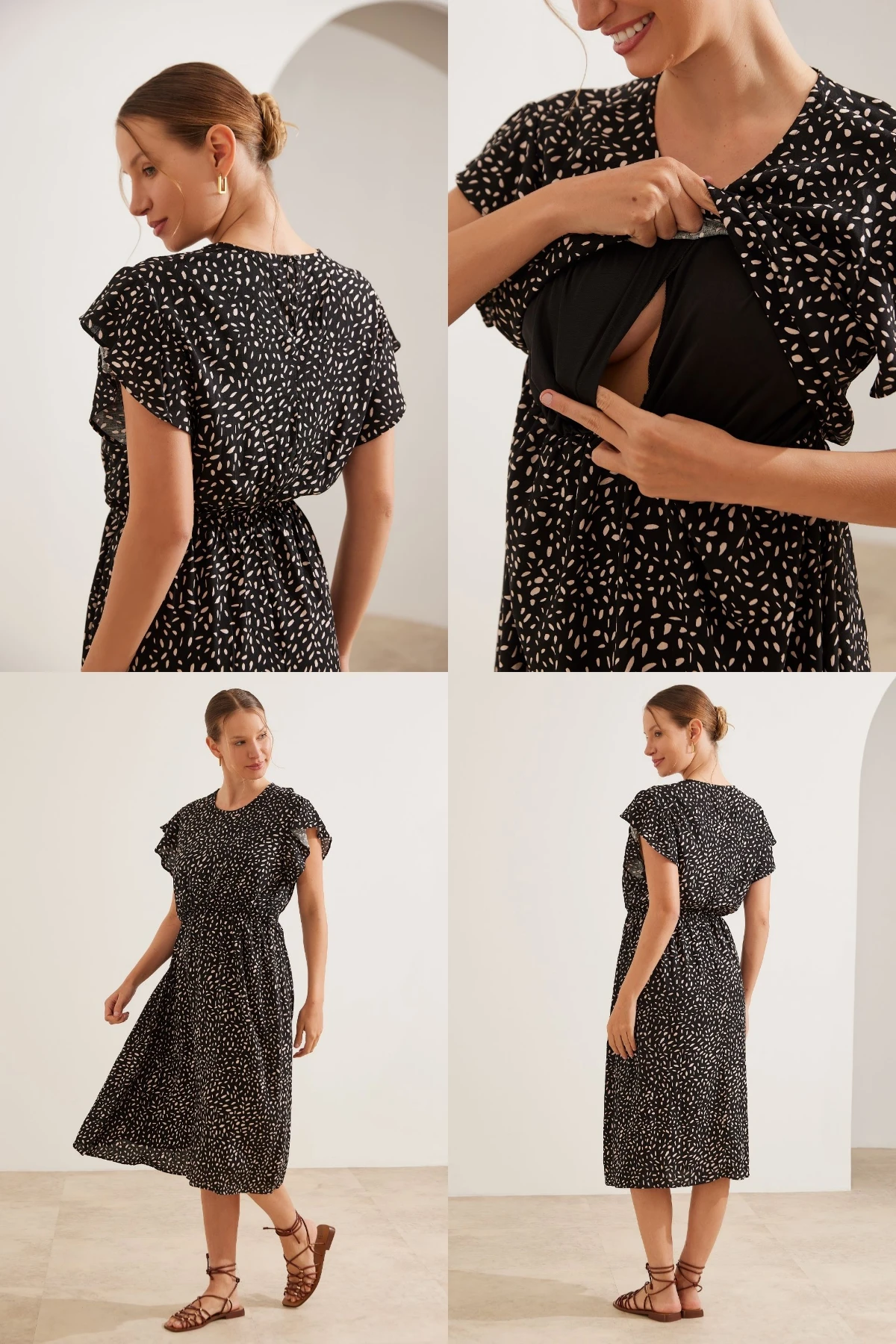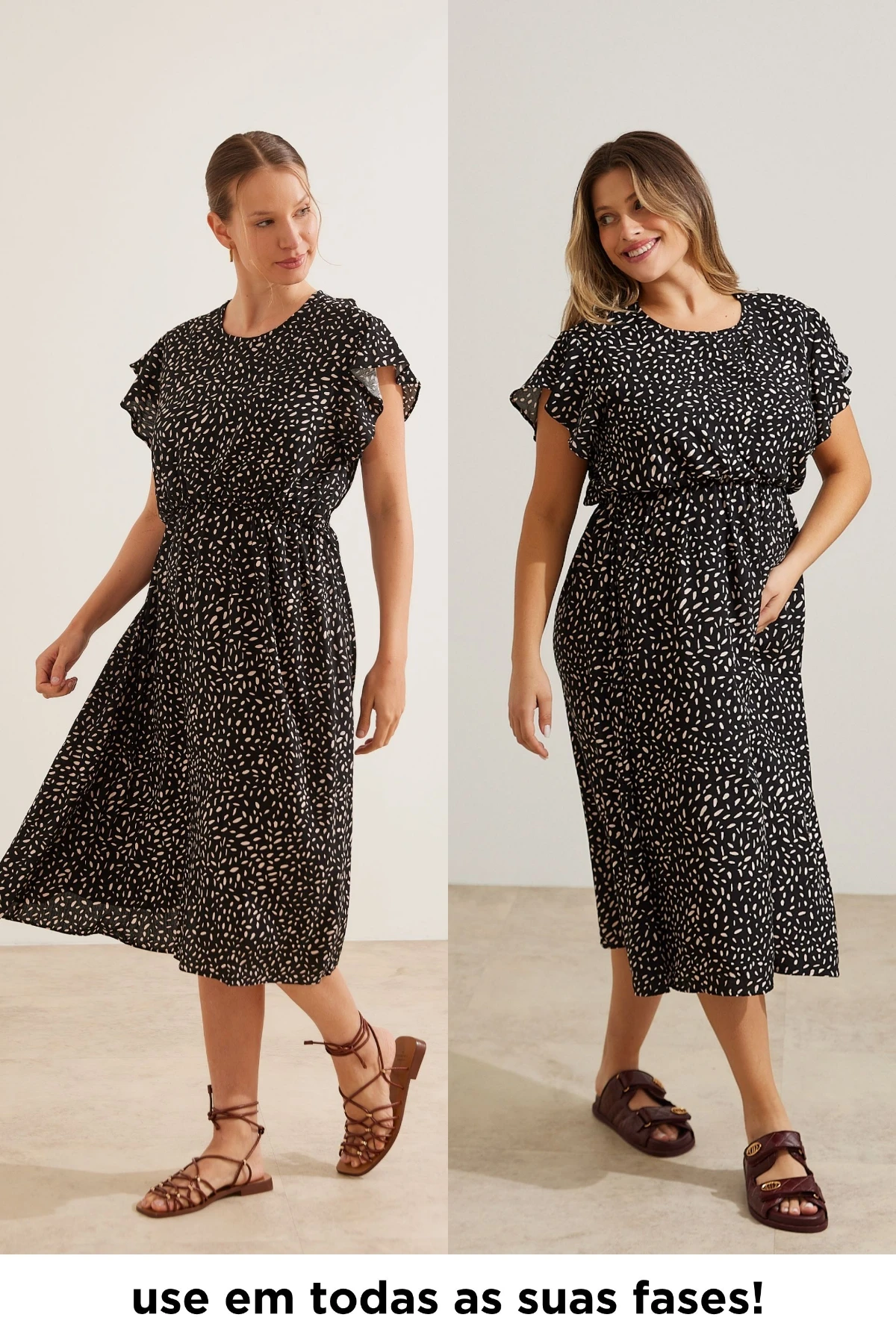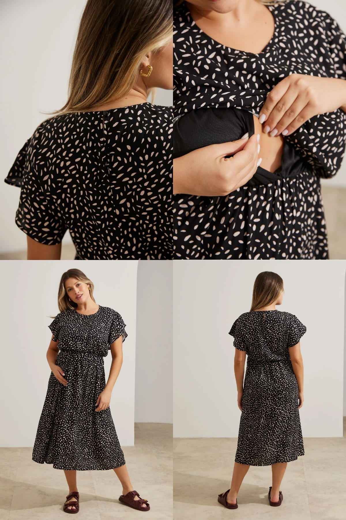 Vestido comprimento midi. Possui sobreposição no busto com elástico e recorte para a amamentação. Sua modelagem é soltinha, acompanhando o crescimento da barriga. O tecido tem um toque macio e confortável. A manga curta é formada por babados. A peça é uma escolha elegante e versátil para diversas ocasiões e fases da maternidade.