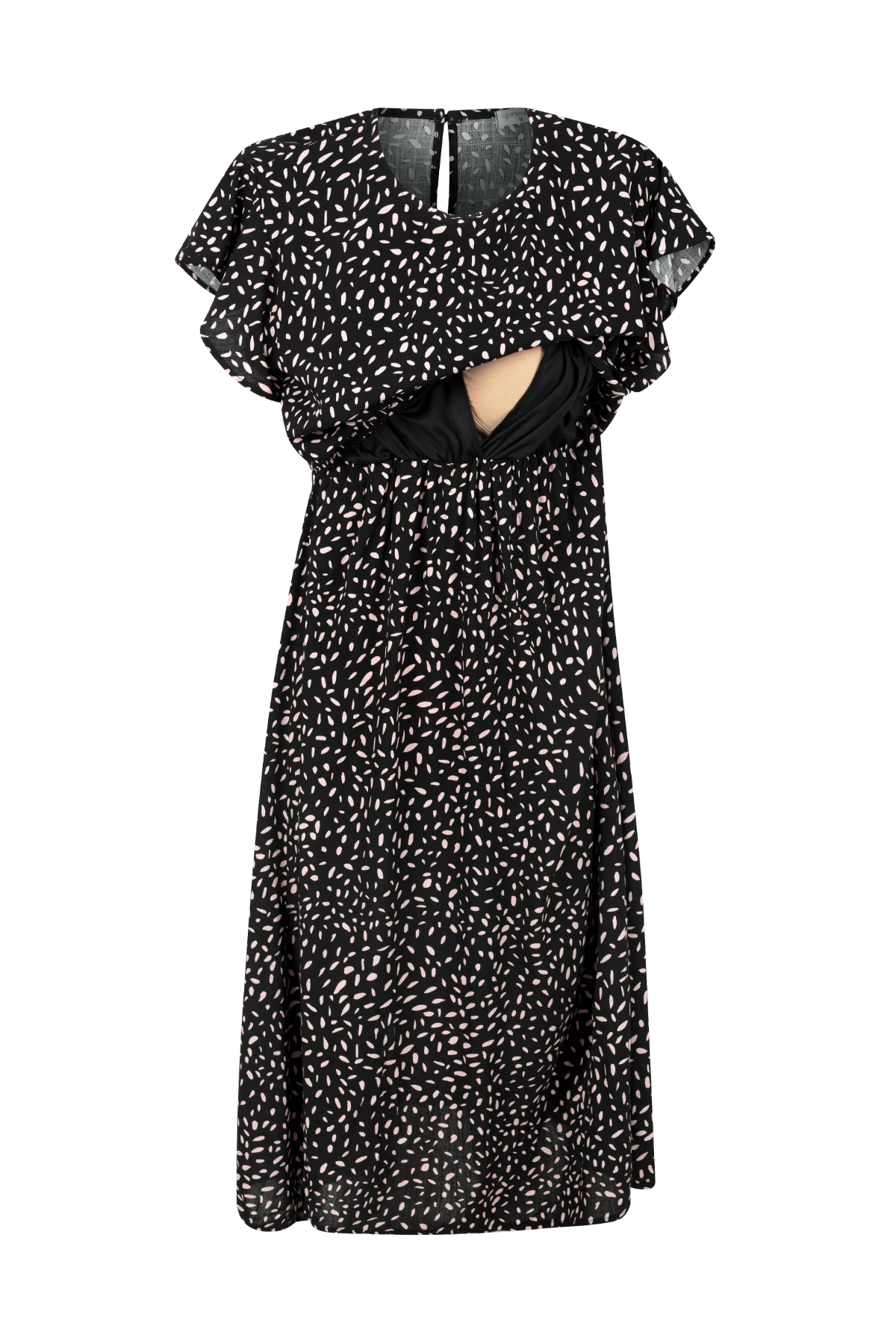 Vestido em tecido plano de viscose com uma delicada estampa. Possui toque macio e confortável e modelagem soltinha que acompanha o crescimento da barriga durante a gestação. A sobreposição no busto possui recorte especialmente desenvolvido para facilitar a amamentação, oferecendo praticidade e estilo para as mamães. Além disso, a presença de elástico abaixo do busto garante uma segurança adicional nesse momento. A manga é curta e bem soltinha. O vestido possui comprimento midi e decote nas costas com um botão para fechamento. É uma escolha elegante e versátil para diversas ocasiões e fases da maternidade!