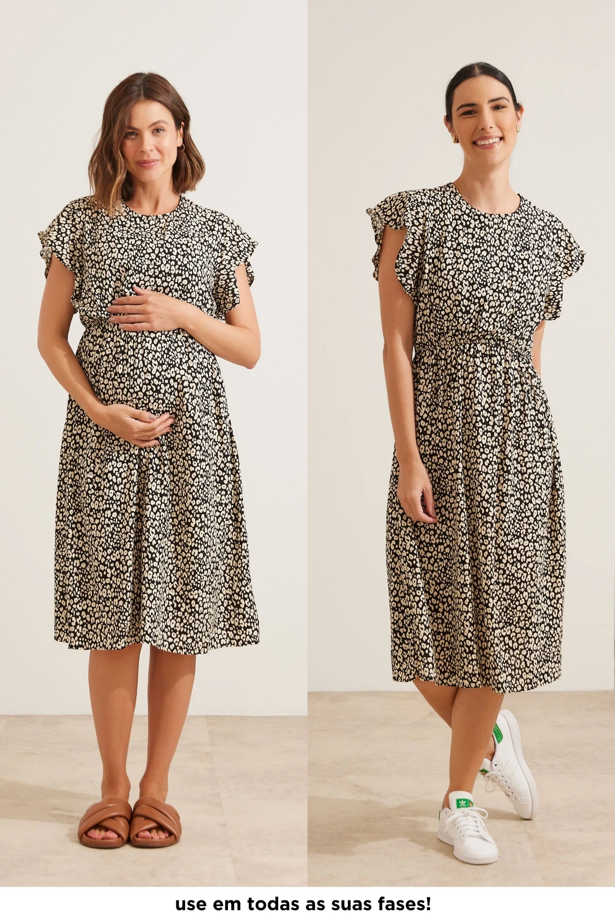Vestido comprimento midi. Possui sobreposição no busto com elástico e recorte para a amamentação. Sua modelagem é soltinha, acompanhando o crescimento da barriga. O tecido tem um toque macio e confortável. A manga curta é formada por babados. A peça é uma escolha elegante e versátil para diversas ocasiões e fases da maternidade.