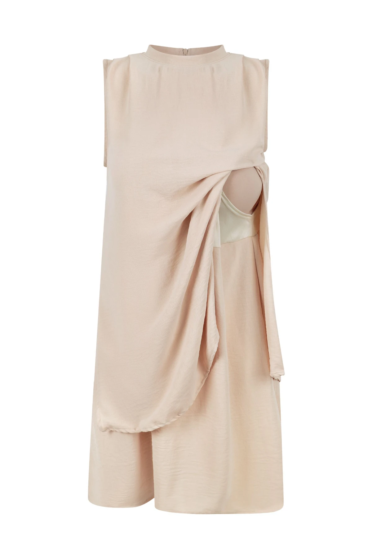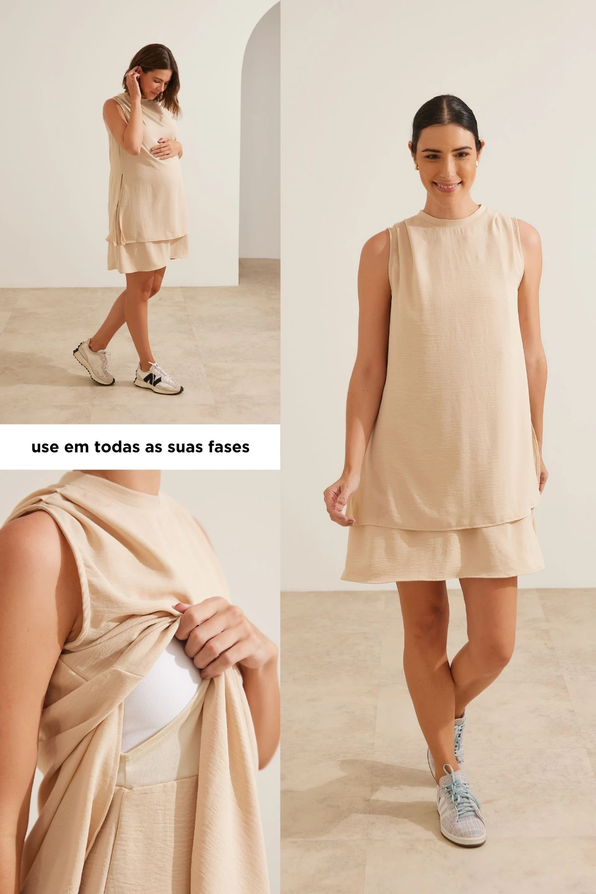 Vestido curto com sobreposição que permite uma amametação prática e fácil. Seu decote é fechado com zíper nas costas. Modelagem regata com drapeados nos ombro e ajustada para acompanhar o crescimento da barriga durante toda a gestação. O caimento é leve e fluído, perfeito para usar em todas as fases da maternidade.