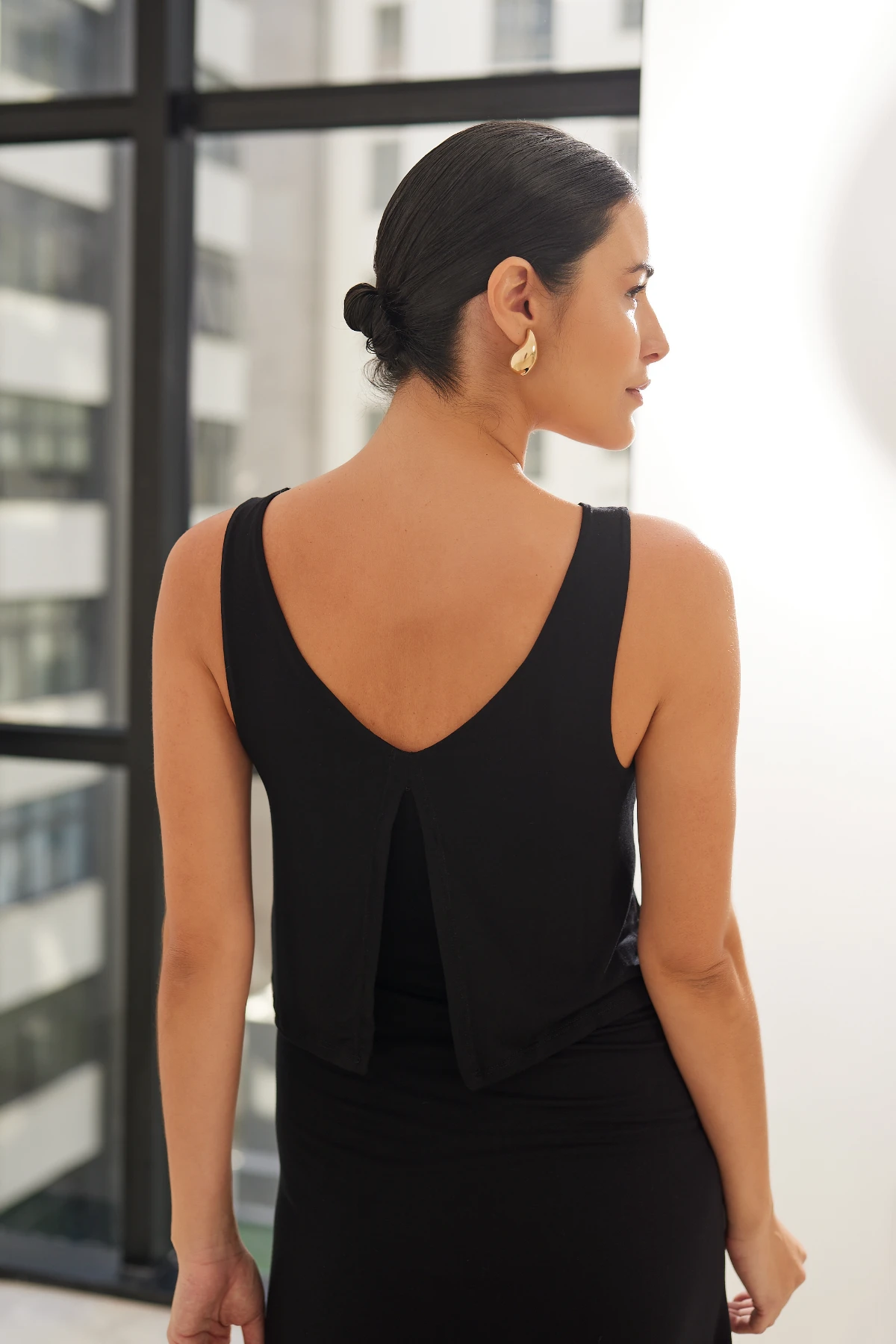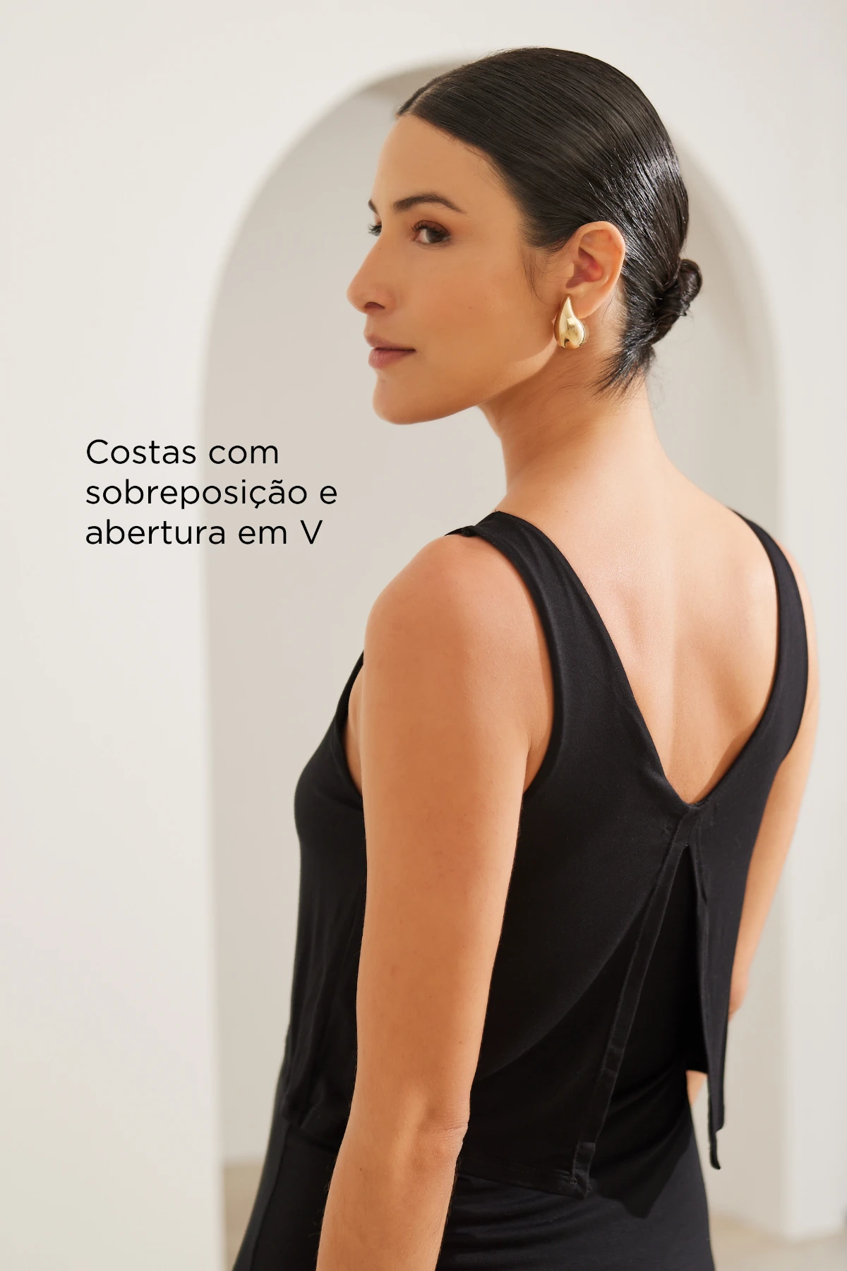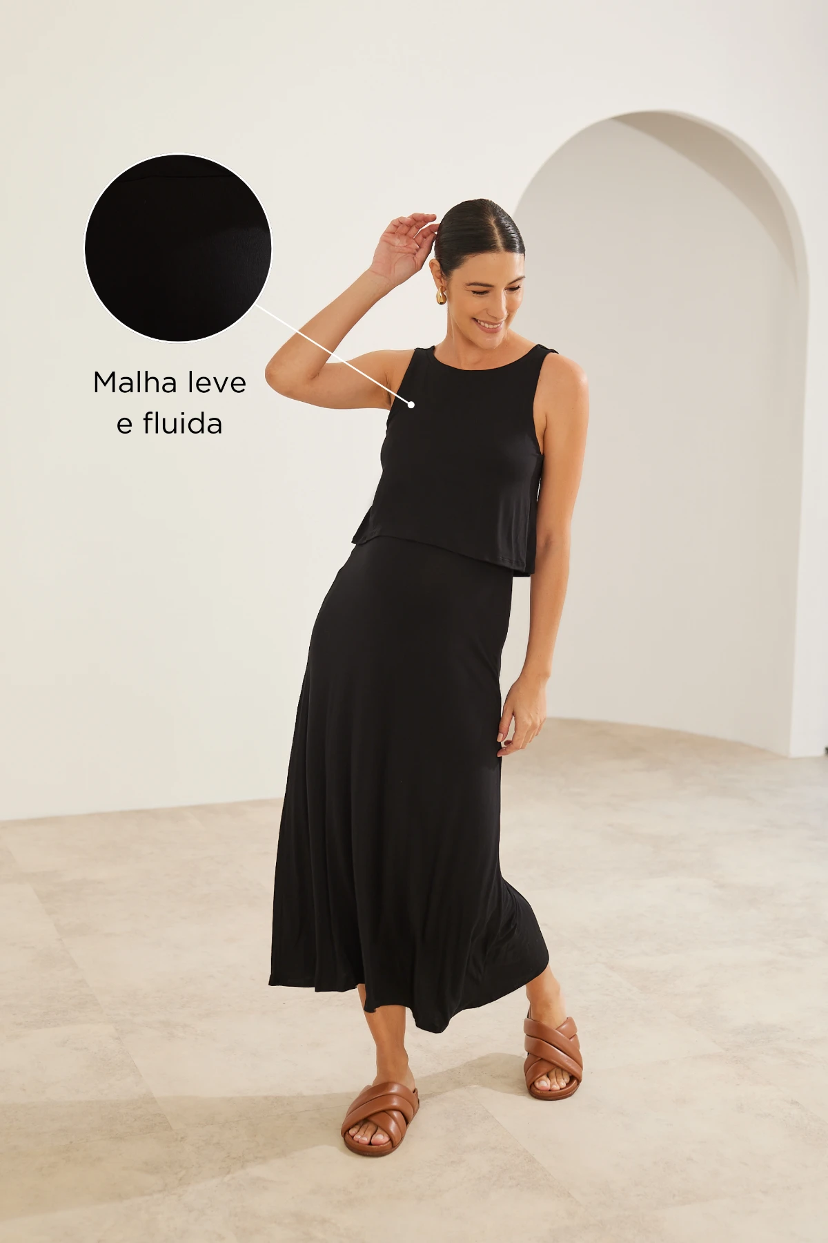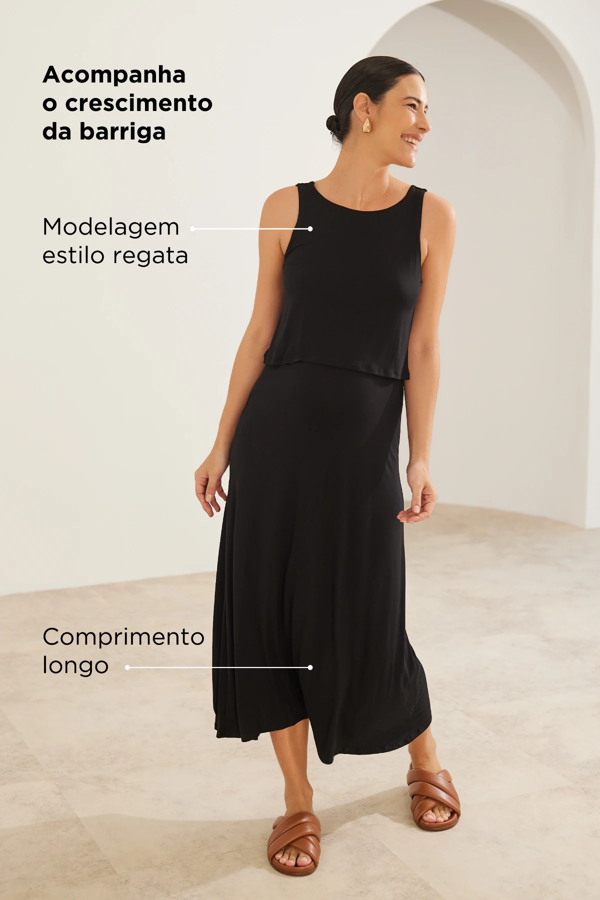 Modelagem: Regata, comprimento longo — valoriza sem apertar.