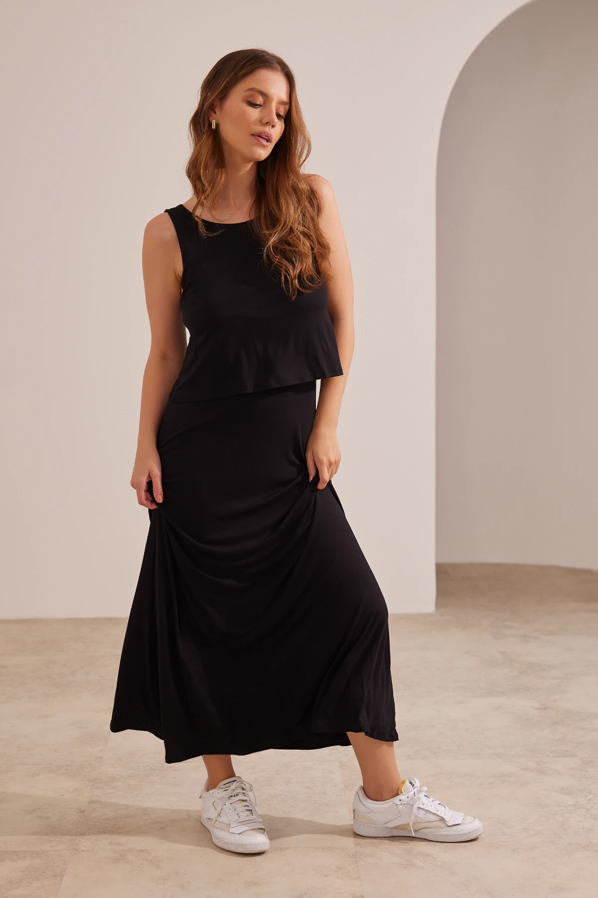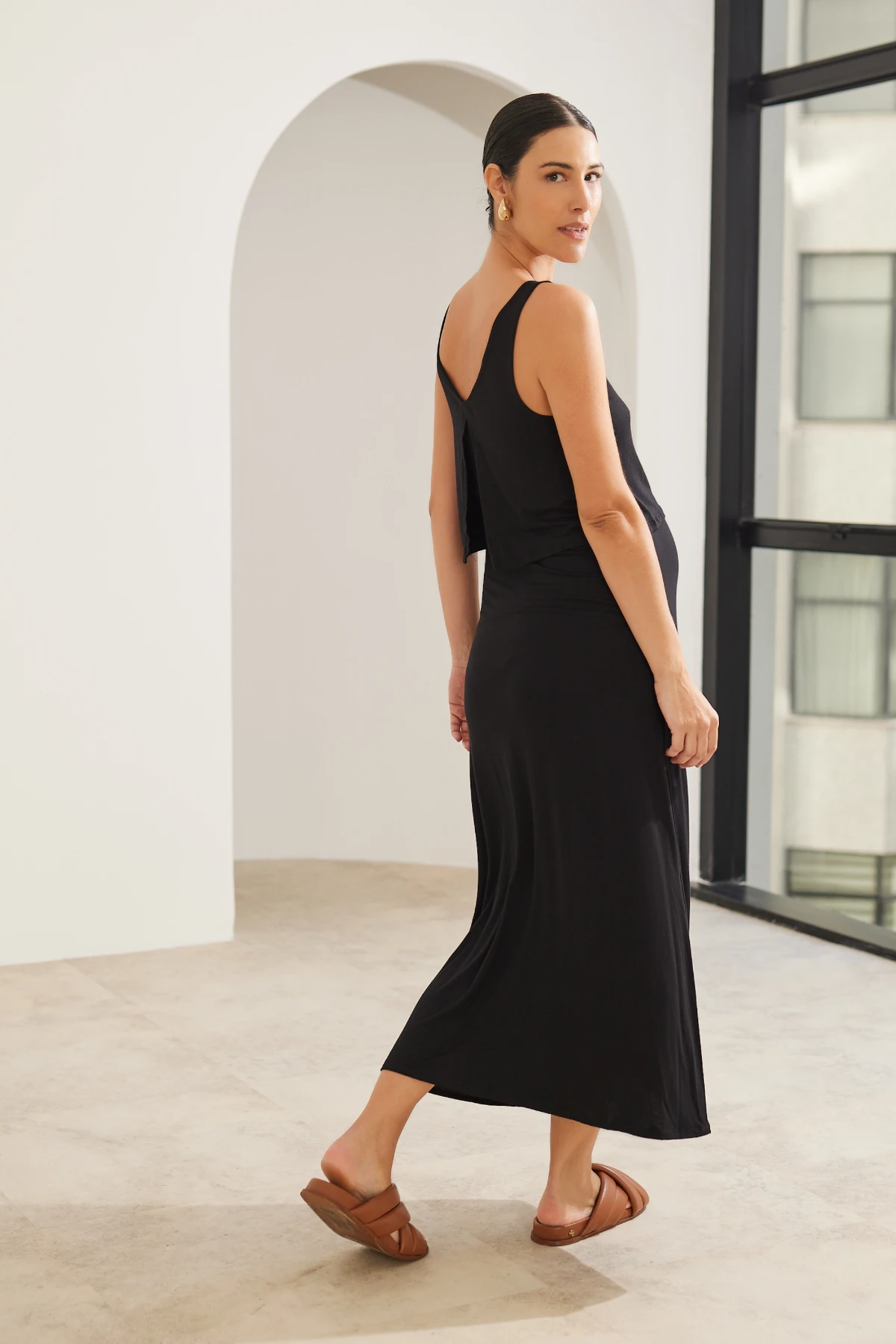 Vestido longo em malha macia, pensado para oferecer caimento fluido e conforto prolongado. A modelagem regata cria um perfil minimalista que ganha leveza com o comprimento longo, sem apertar a silhueta.
