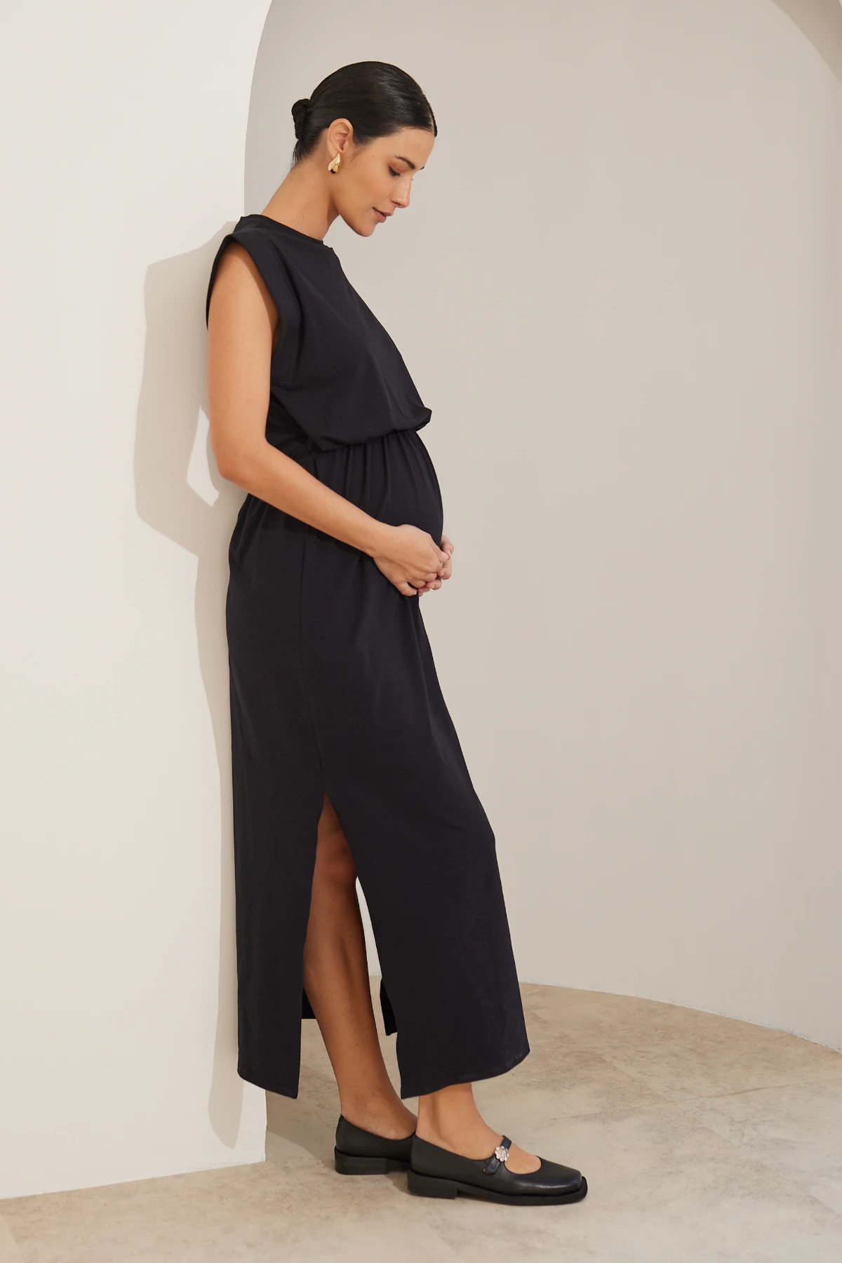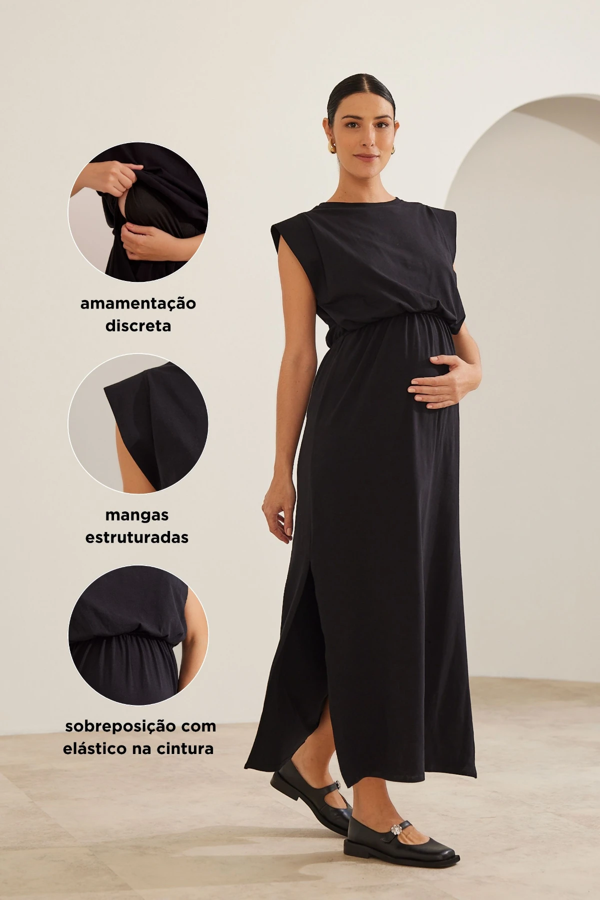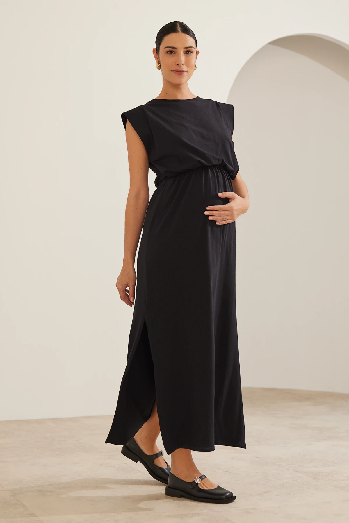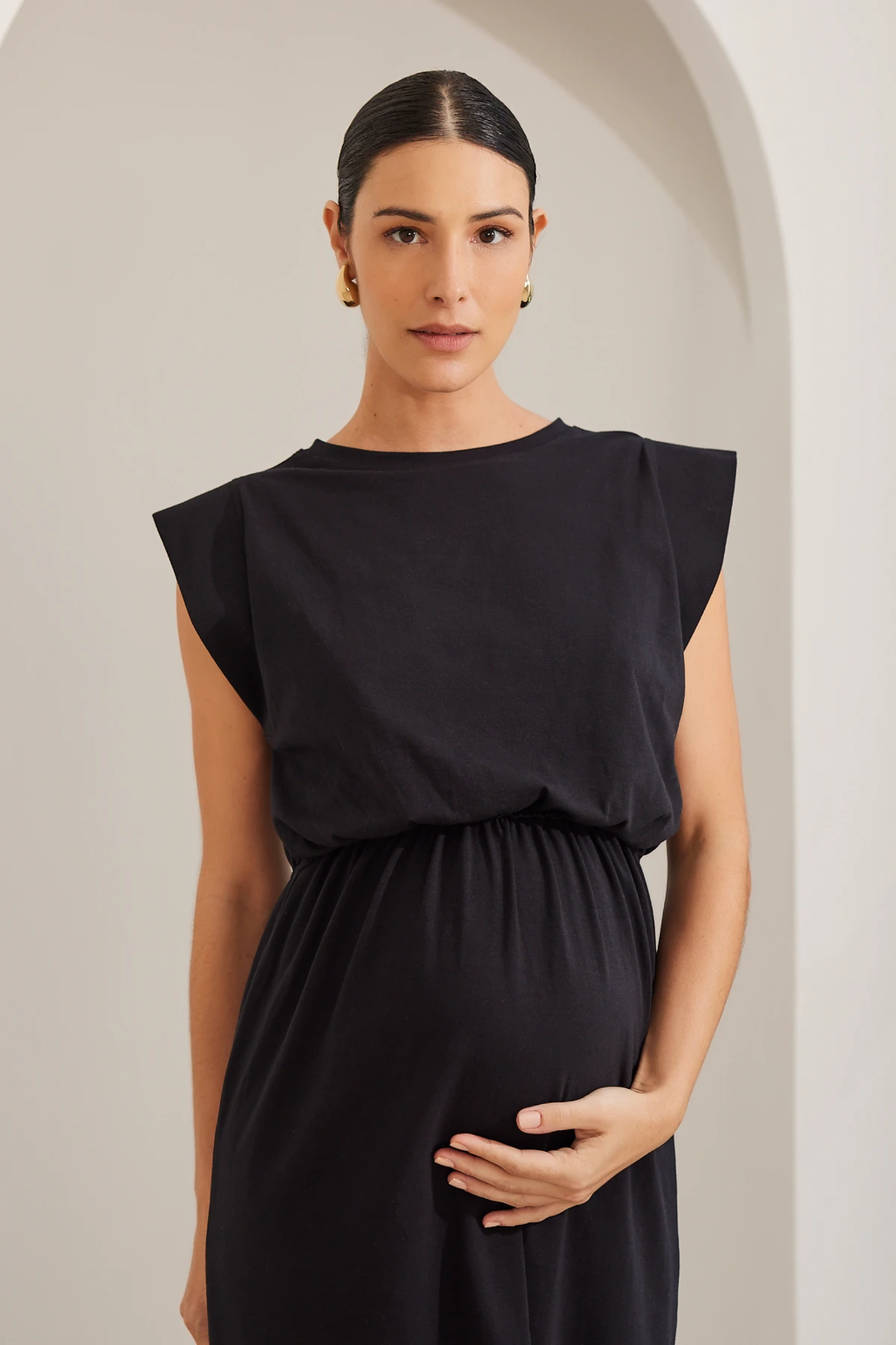 Por isso o vestido combina simplicidade e função: a malha de algodão premium oferece toque macio e opacidade, enquanto a modelagem ampla garante espaço para a barriga sem alargar o tecido.