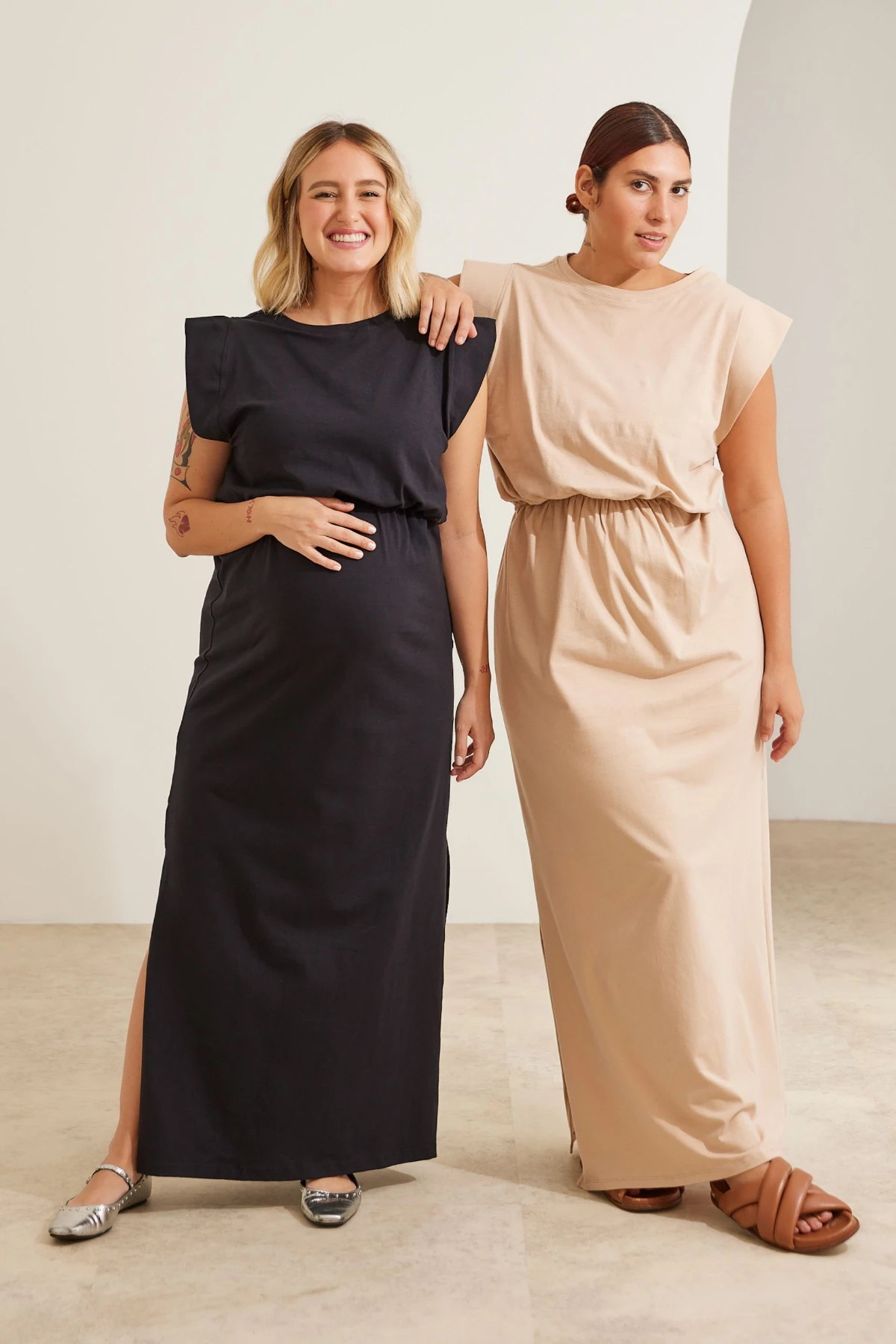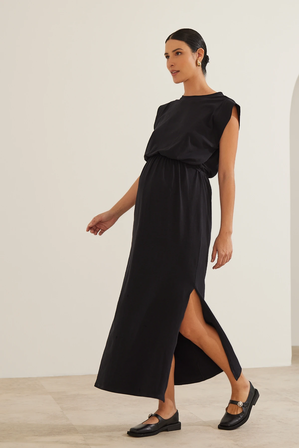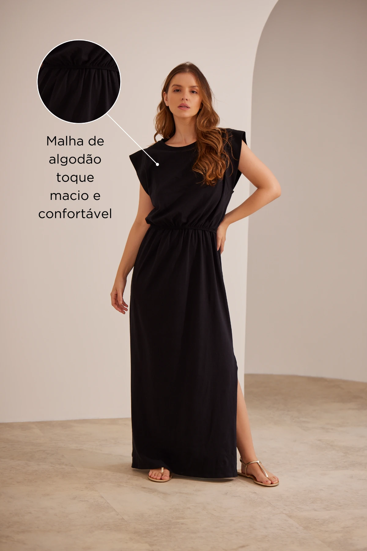 Por isso o vestido combina simplicidade e função: a malha de algodão premium oferece toque macio e opacidade, enquanto a modelagem ampla garante espaço para a barriga sem alargar o tecido.
