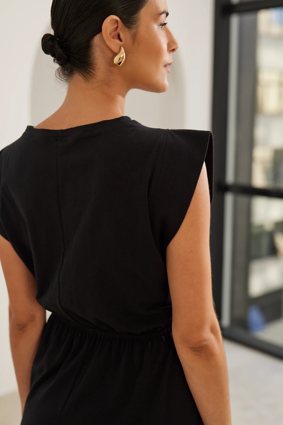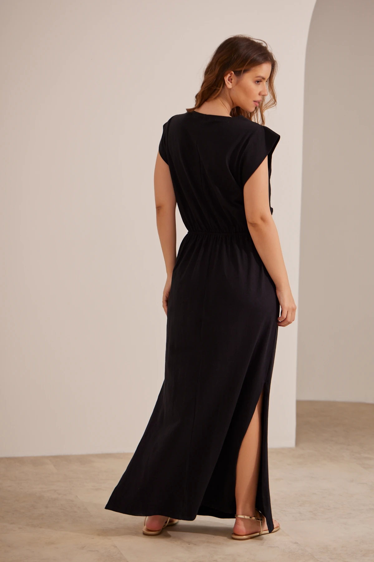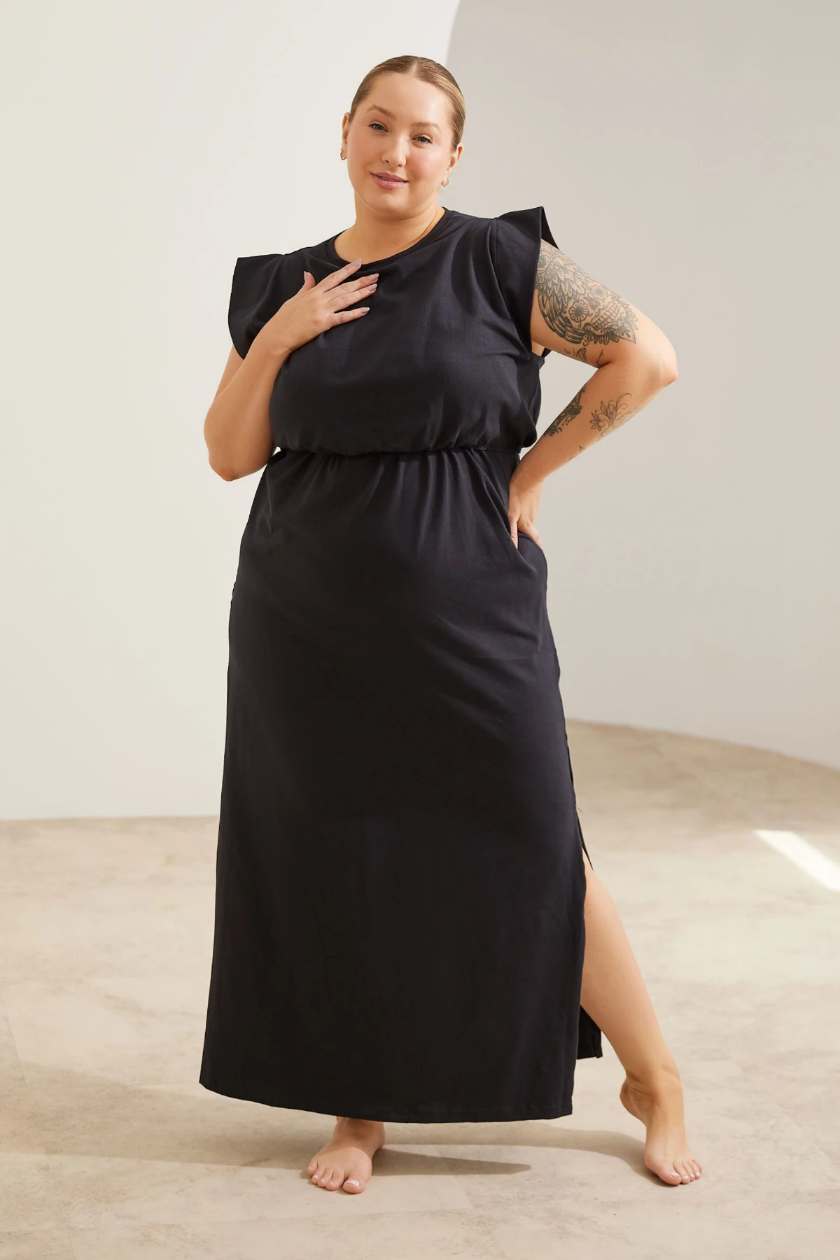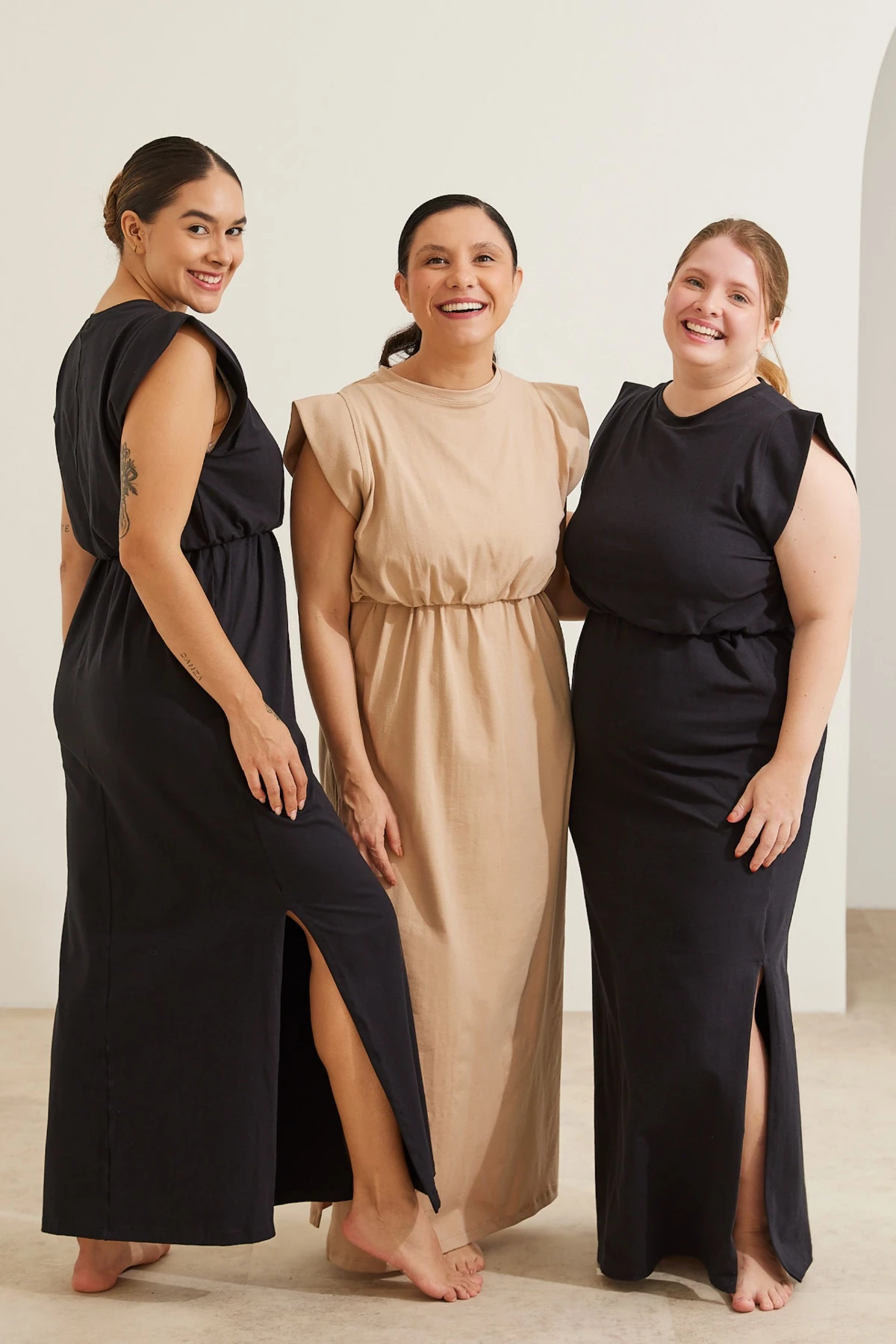 Por isso o vestido combina simplicidade e função: a malha de algodão premium oferece toque macio e opacidade, enquanto a modelagem ampla garante espaço para a barriga sem alargar o tecido.