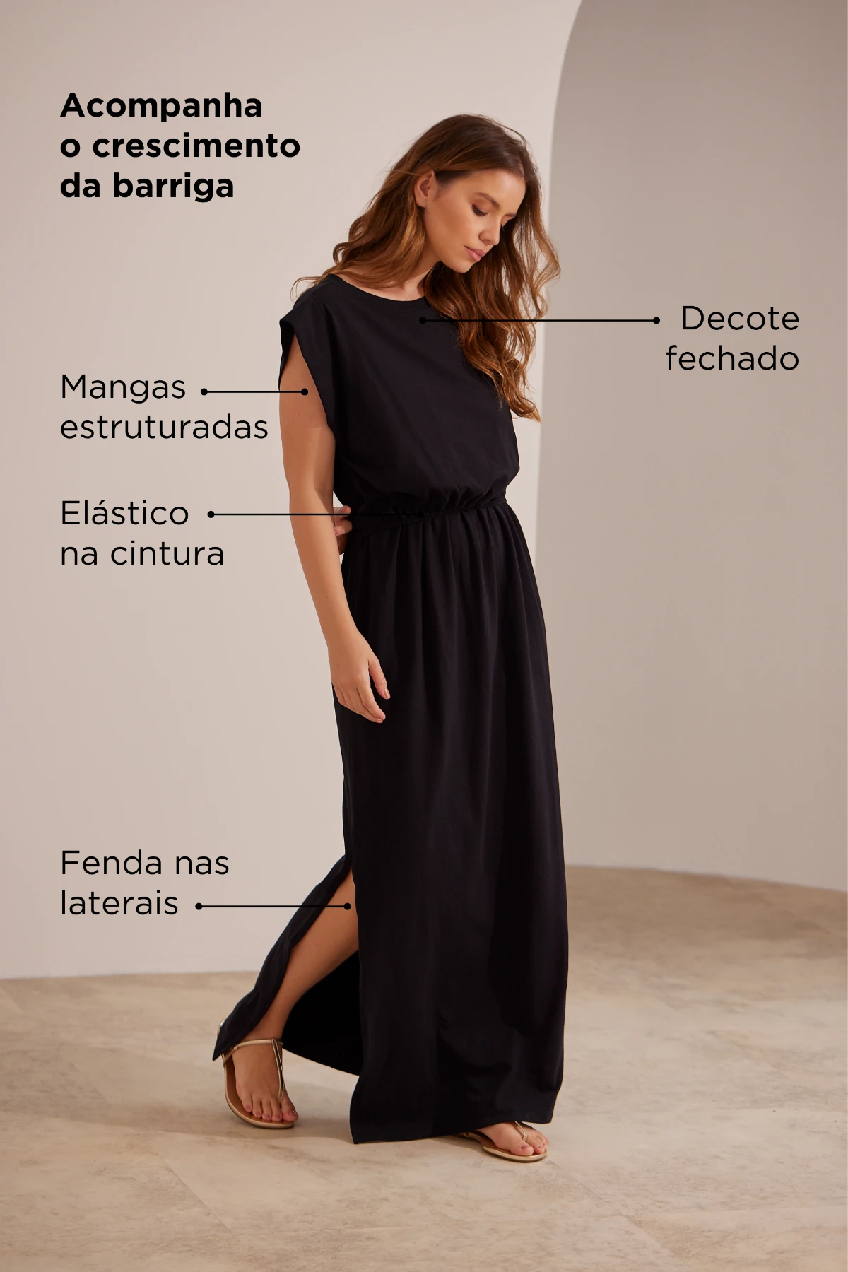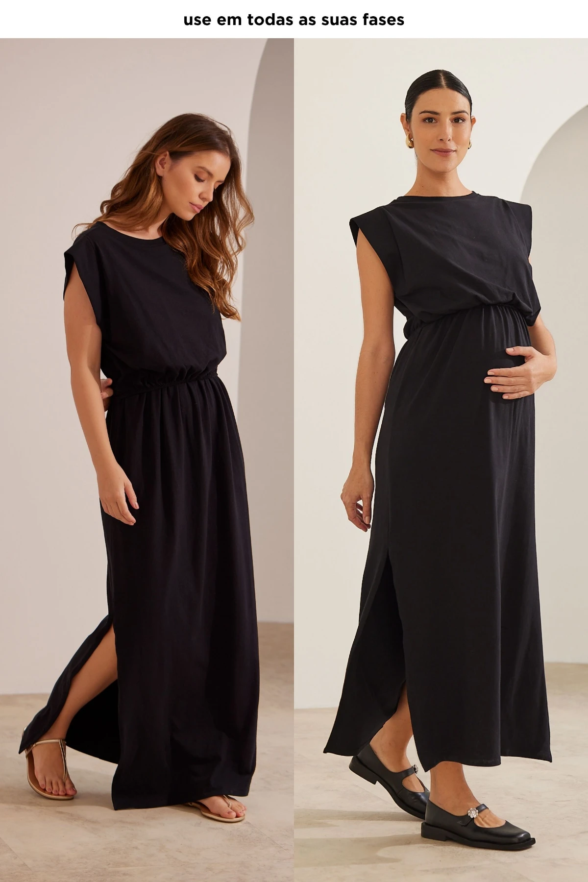 Acompanha a gestação: corte amplo que acomoda o crescimento da barriga sem apertar.