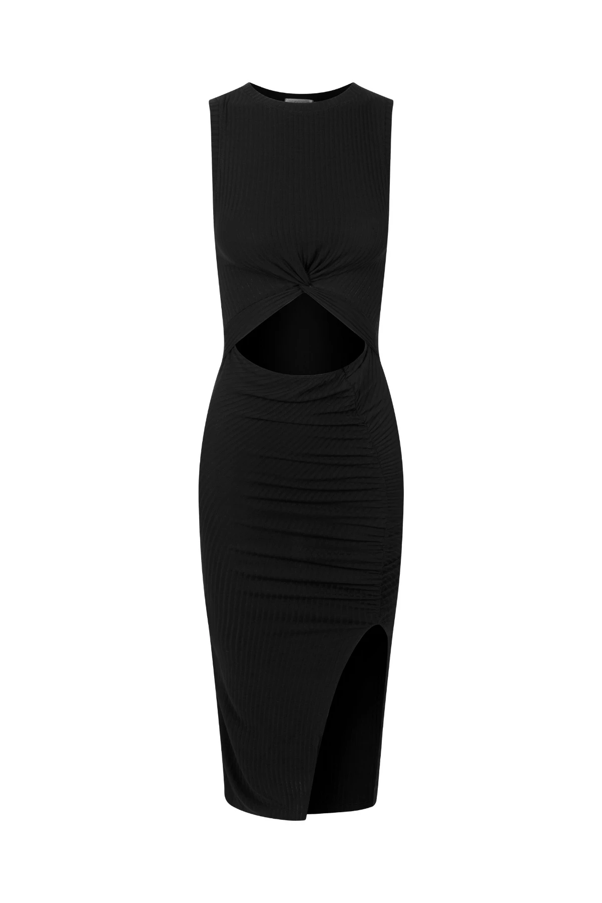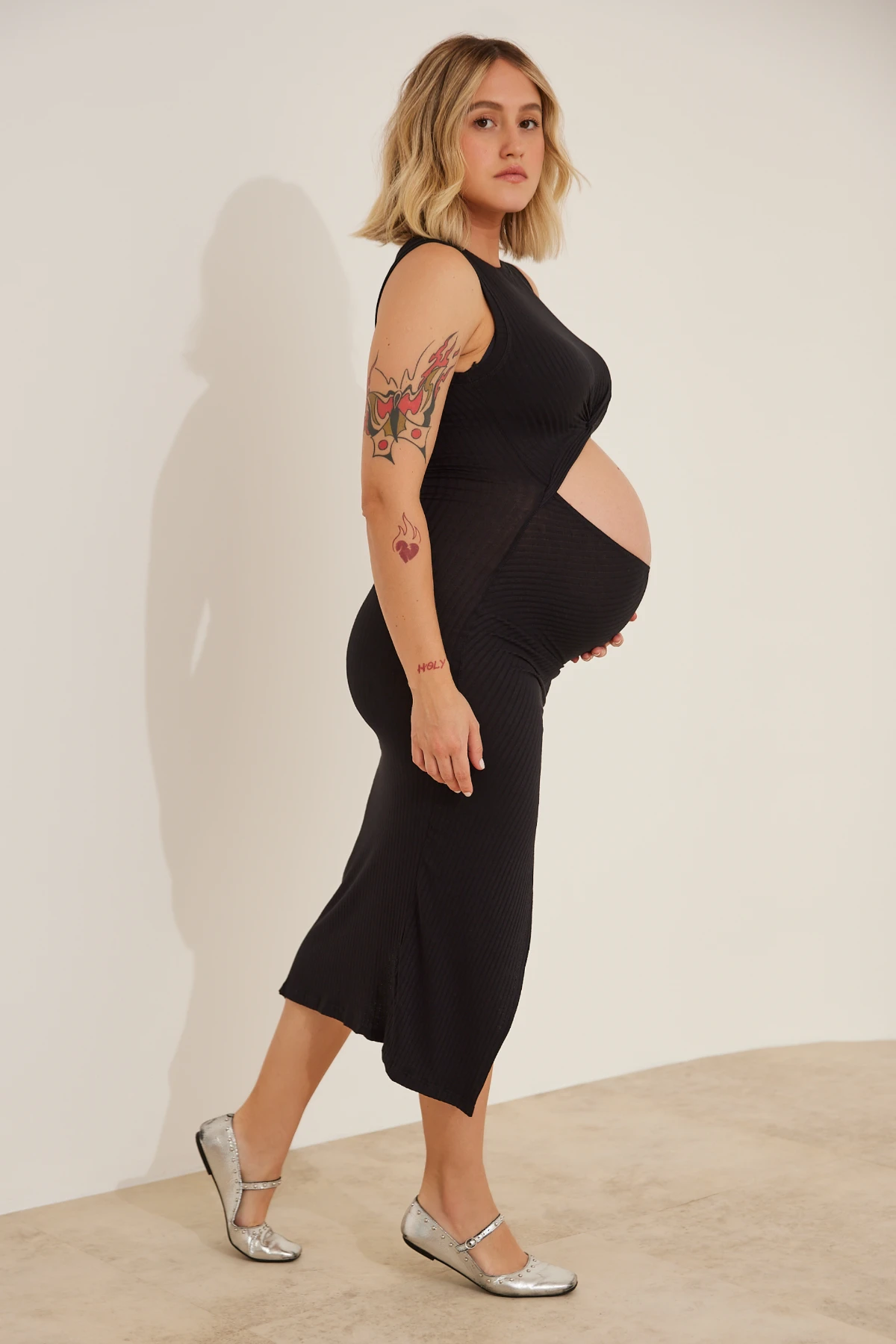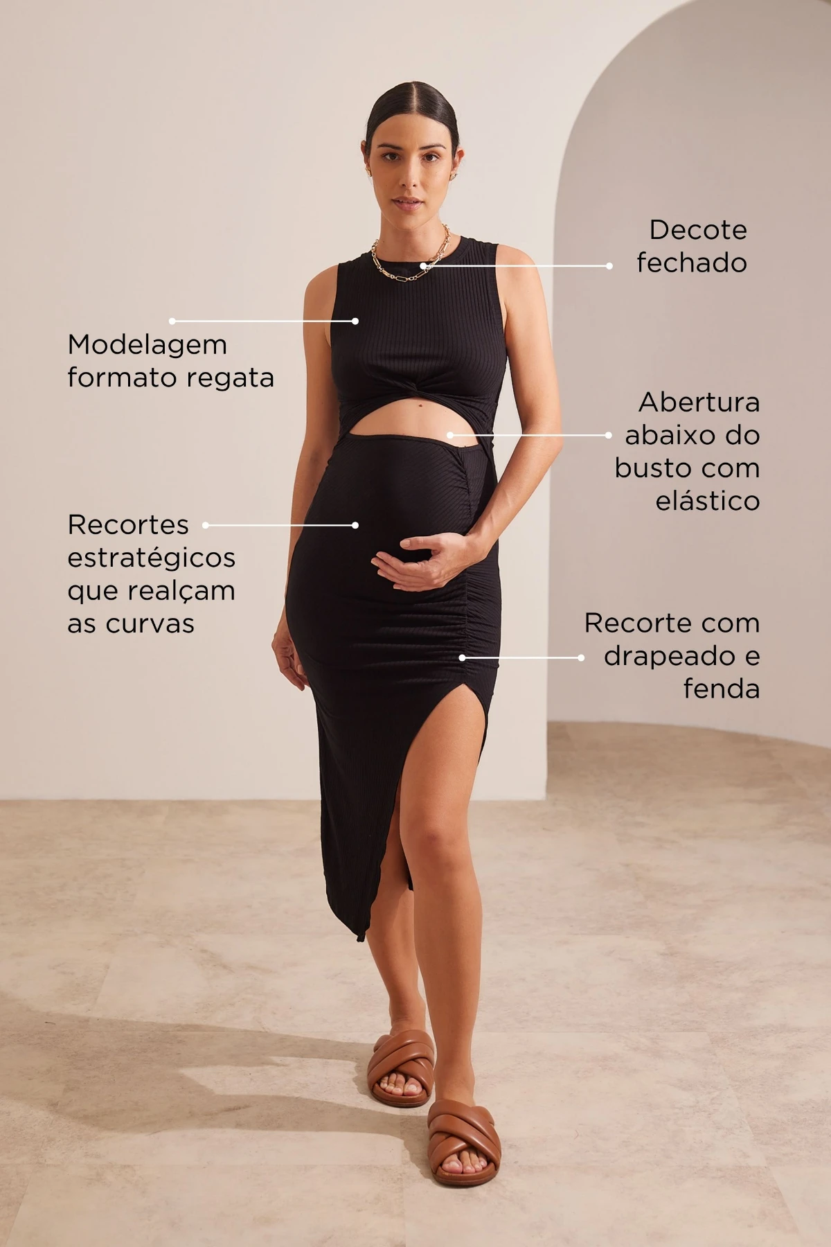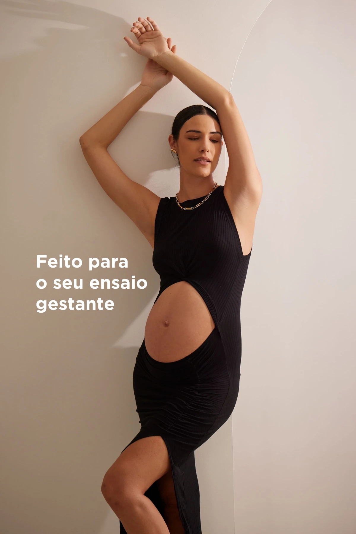 Vestido regata em malha canelada de viscose com elastano. Possui recorte abaixo do busto para deixar a barriga em evidência, trazendo a proposta de um look icônico para ensaio gestante. Possui recorte drapeado e fenda.