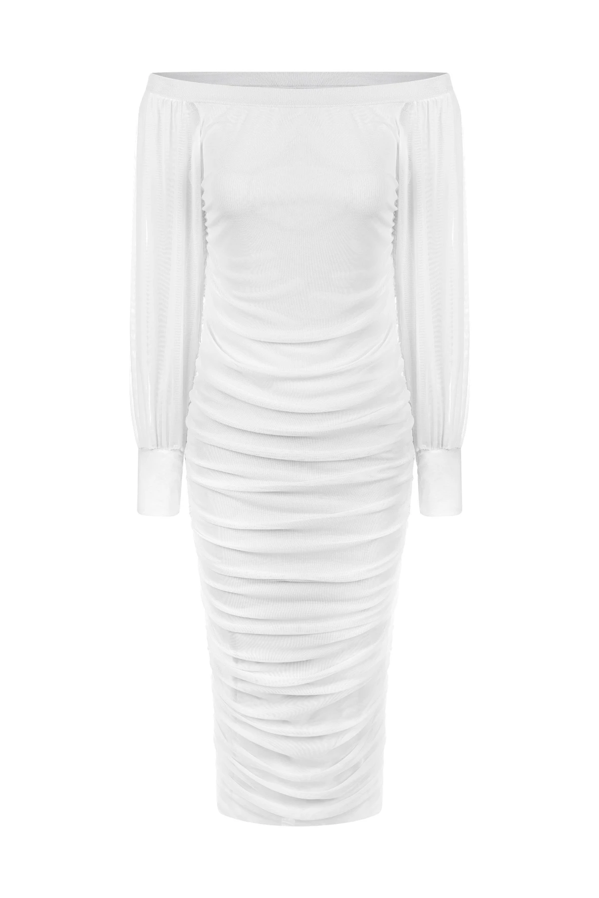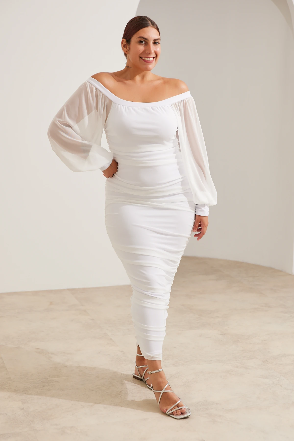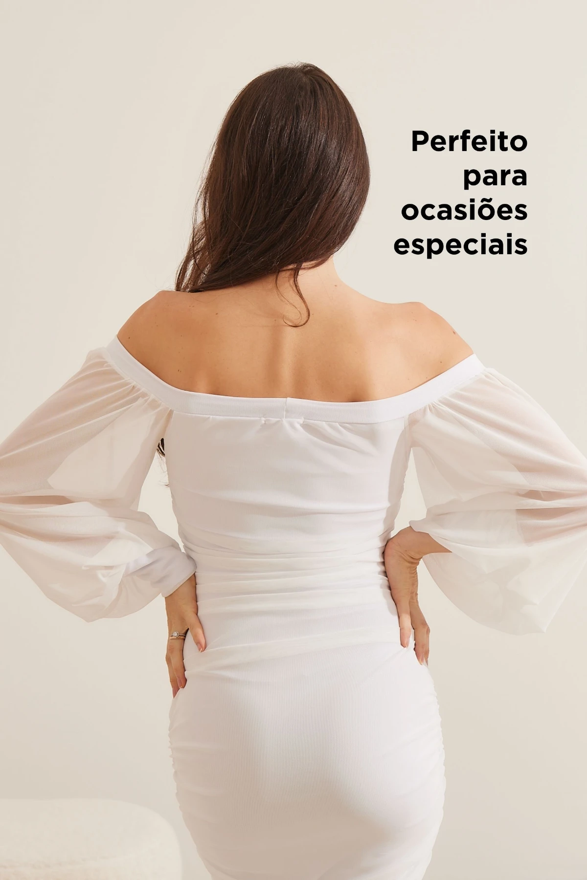 Vestido midi feito em tule e forro de poliamida no corpo inteiro. Possui elástico, drapeados nas laterais e decote ombro a ombro. Tem manga longa ampla com transparência e punhos forrados. É uma opção ideal para as ocasiões especiais que a maternidade proporciona.