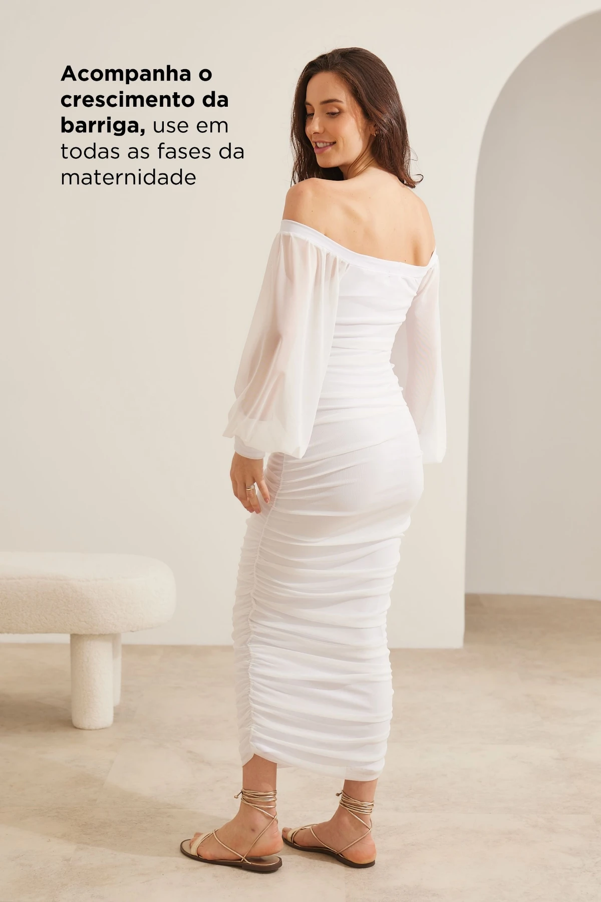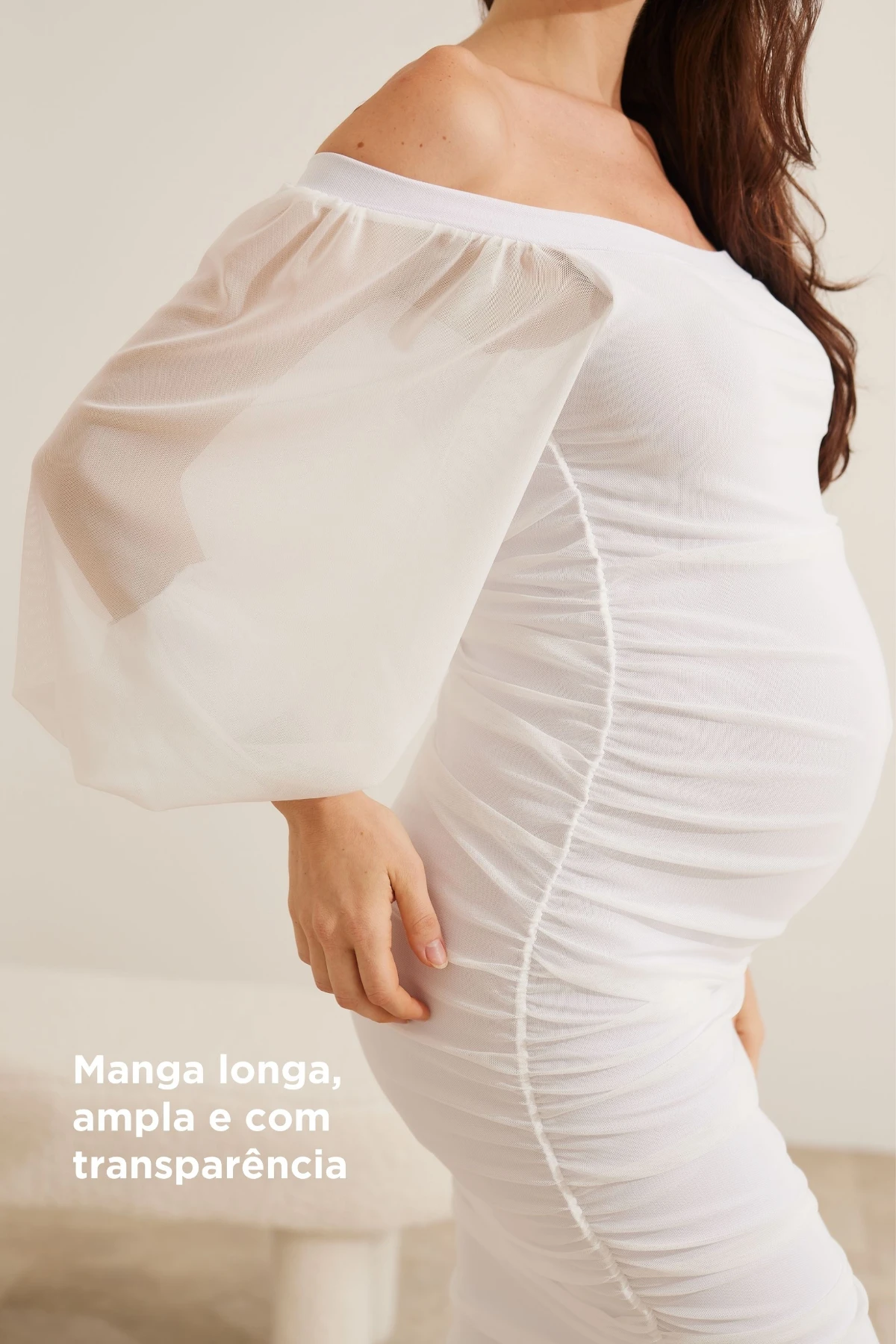 Vestido midi feito em tule e forro de poliamida no corpo inteiro. Possui elástico, drapeados nas laterais e decote ombro a ombro. Tem manga longa ampla com transparência e punhos forrados. A modelagem é ajustada para acompanhar o crescimento da barriga. É uma opção ideal para as ocasiões especiais que a maternidade proporciona.