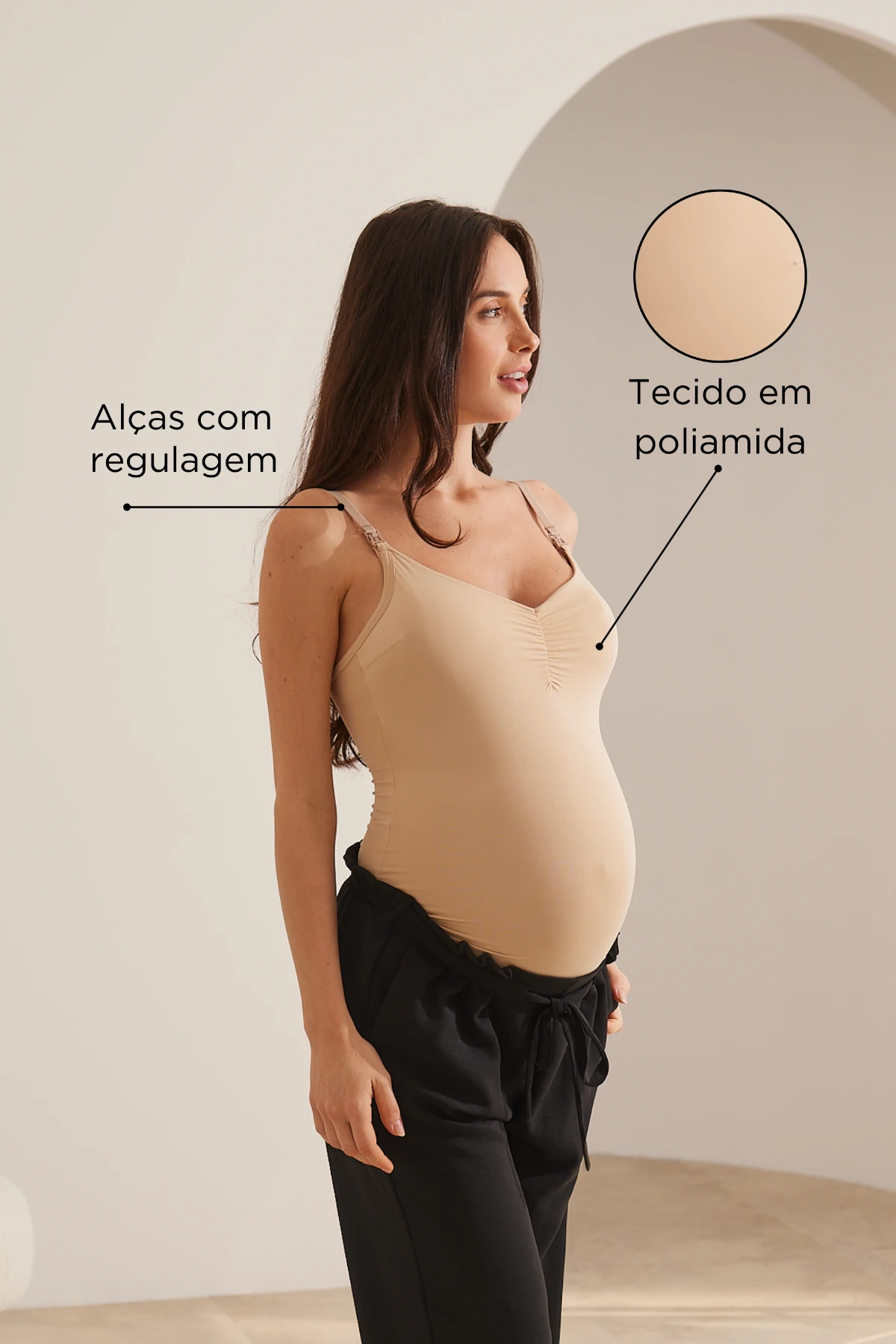 Confeccionada em poliamida macia, possui busto duplo com elástico interno e fecho click para uma amamentação fácil e segura.