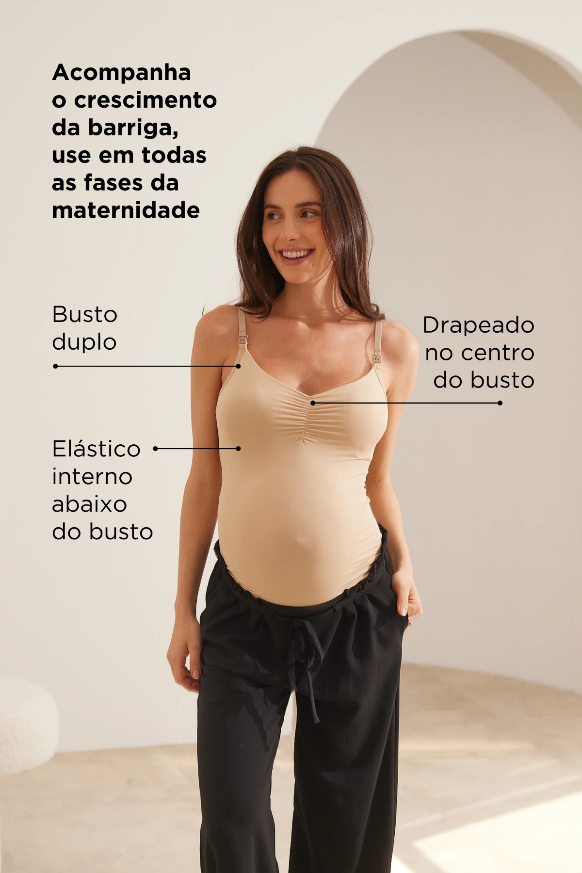 Busto duplo com elástico interno: sustentação leve e confortável.