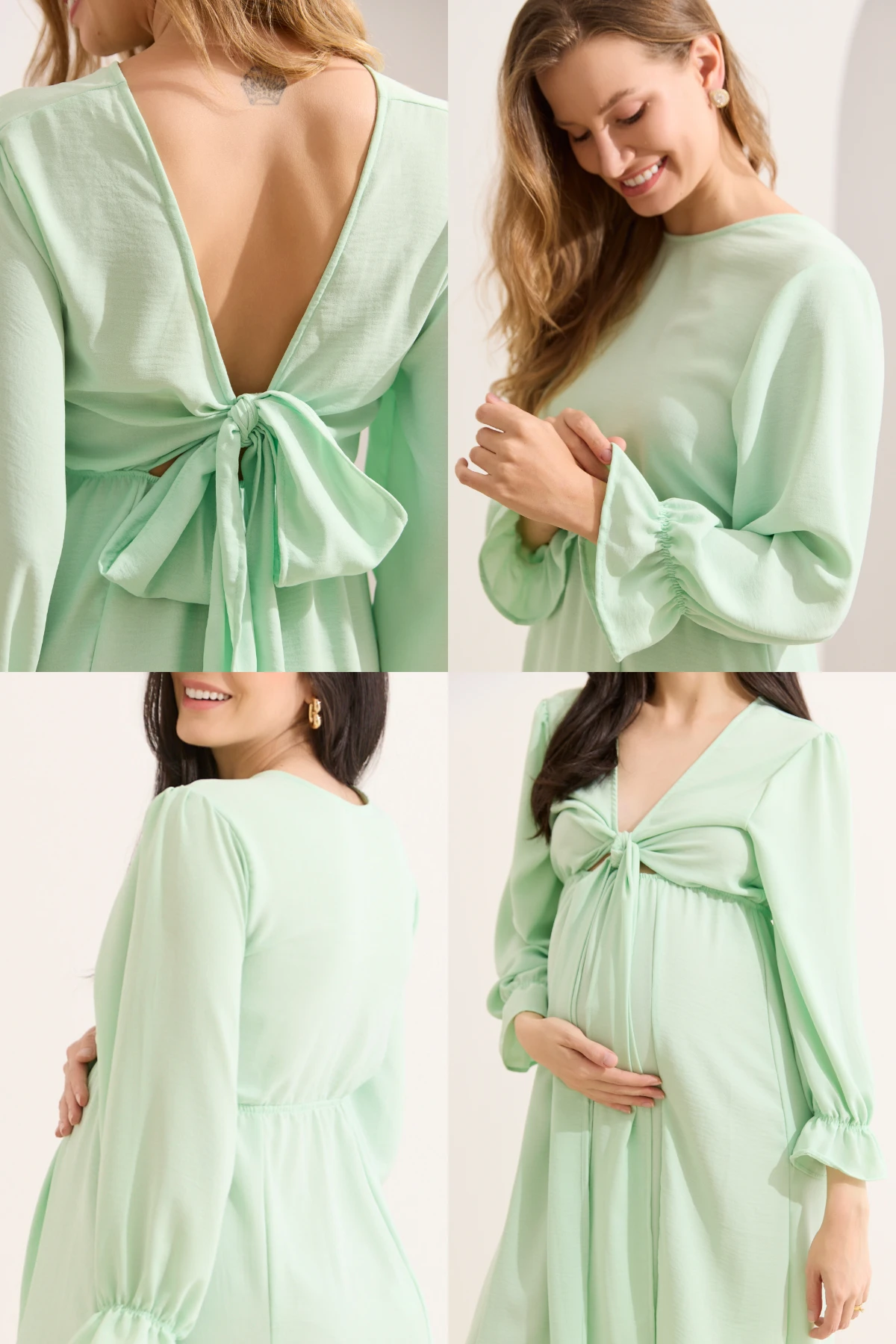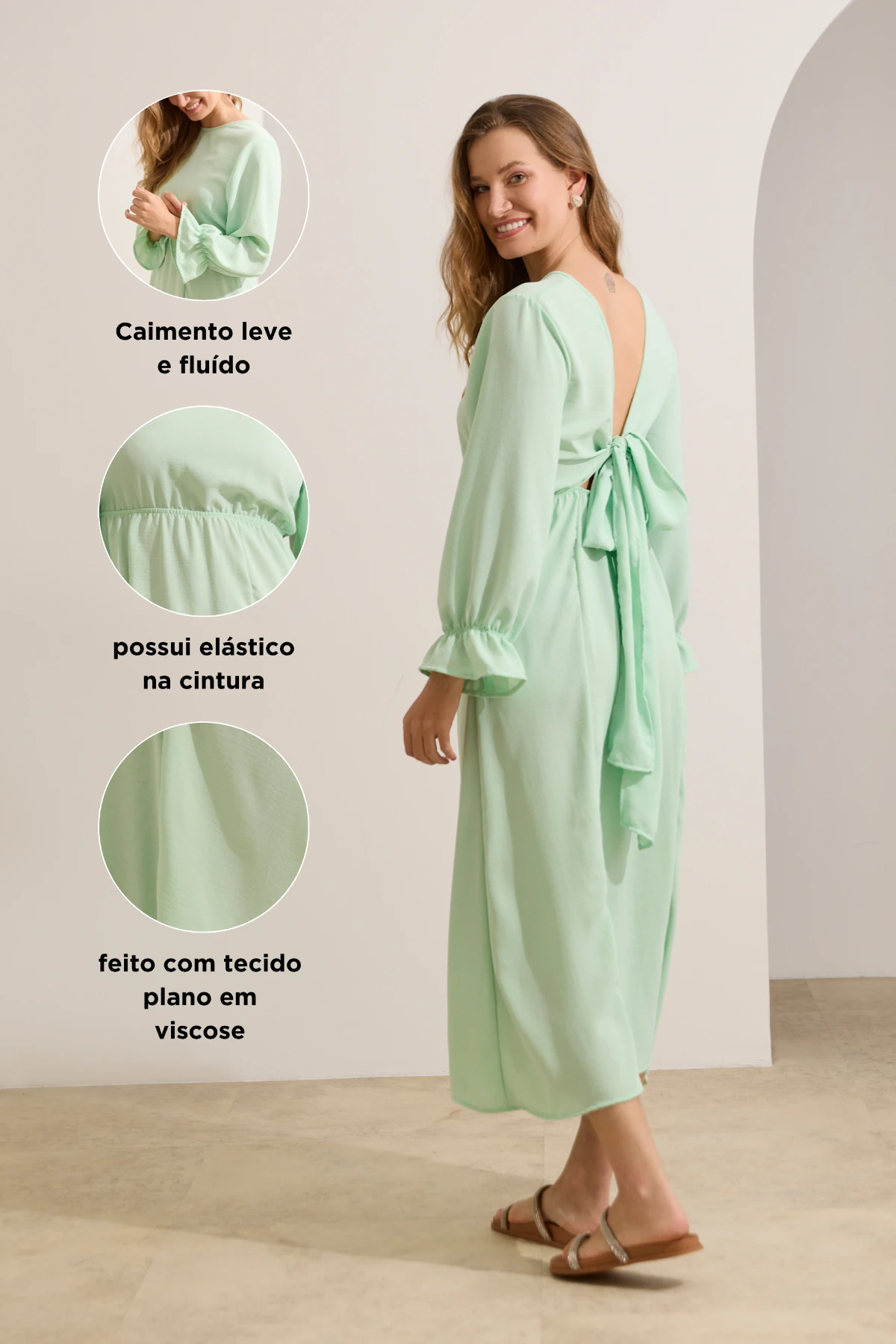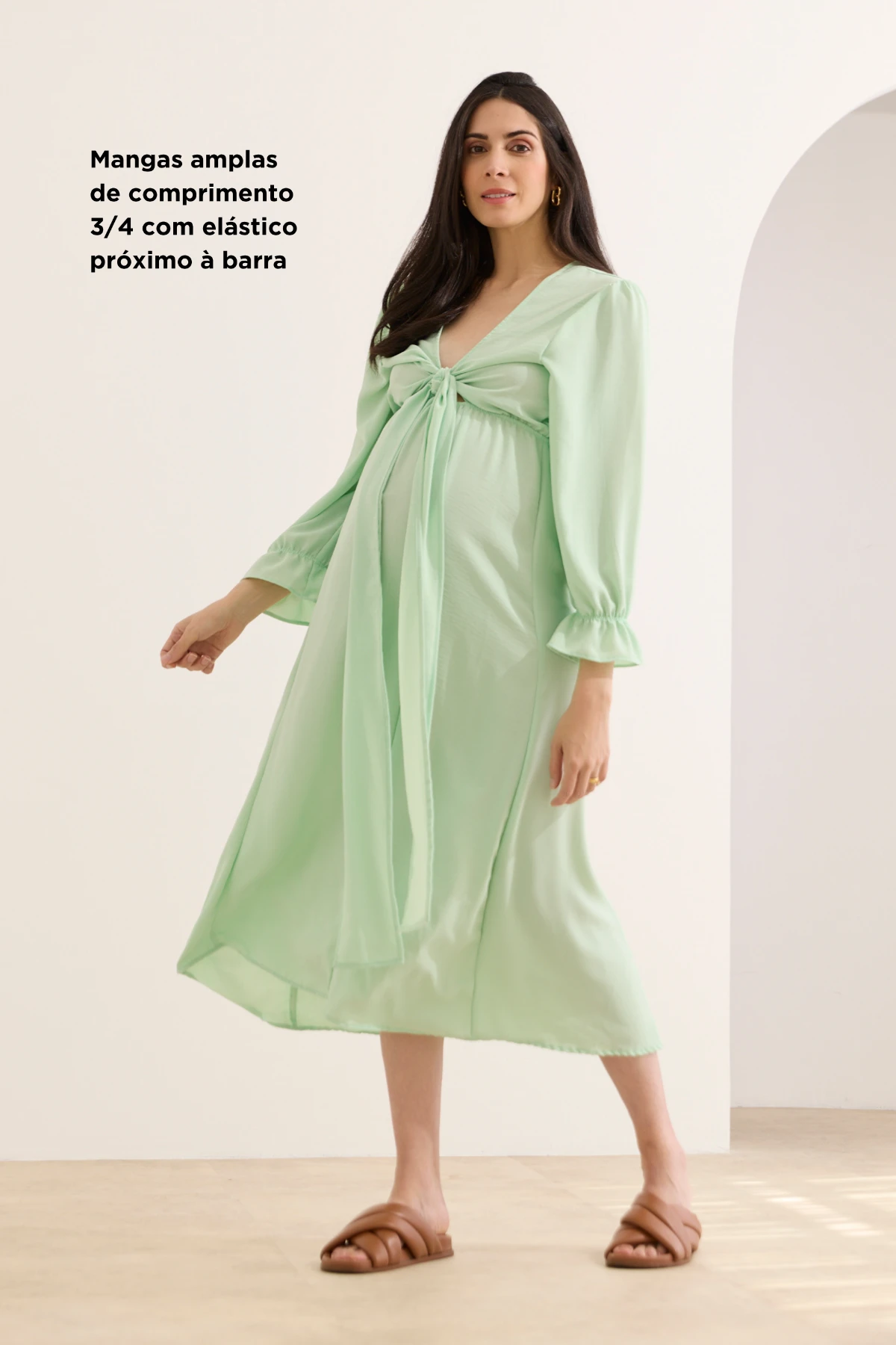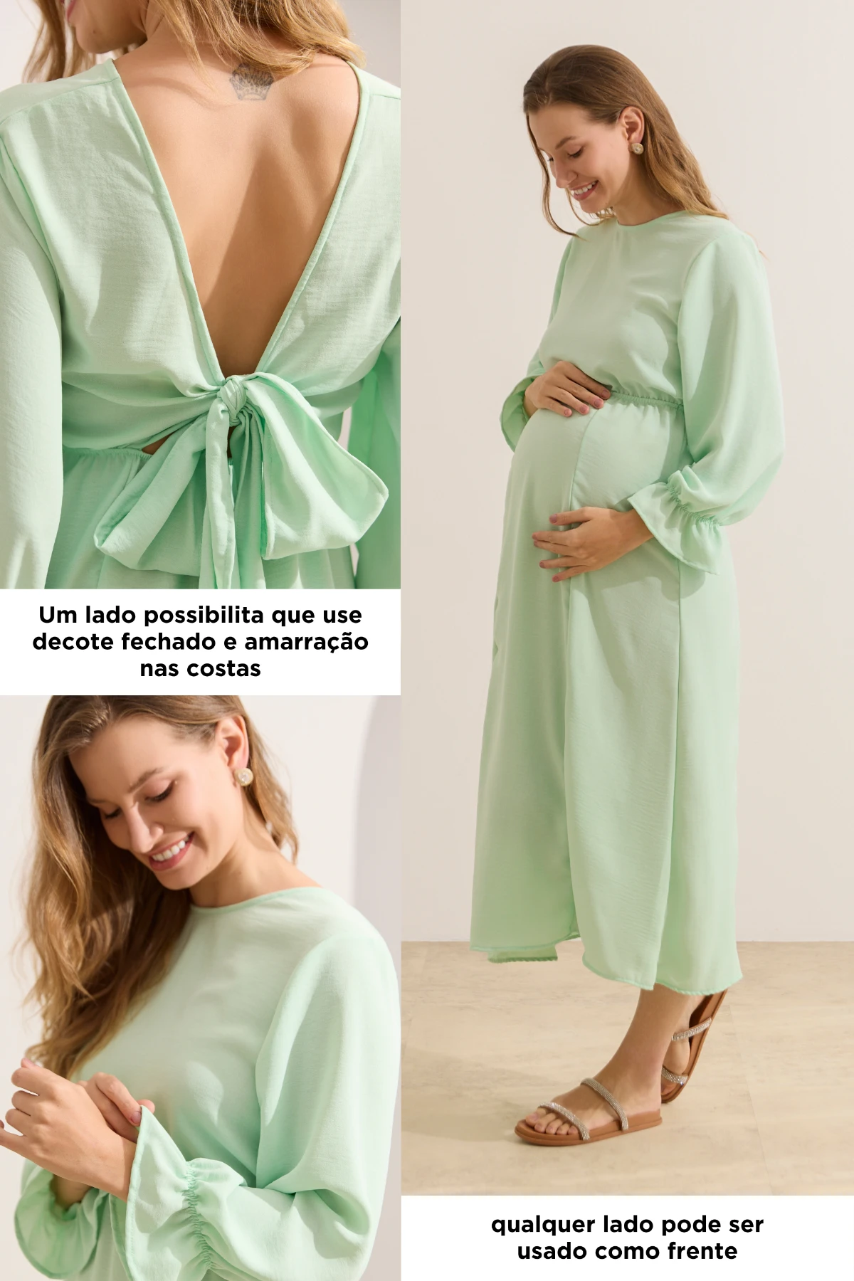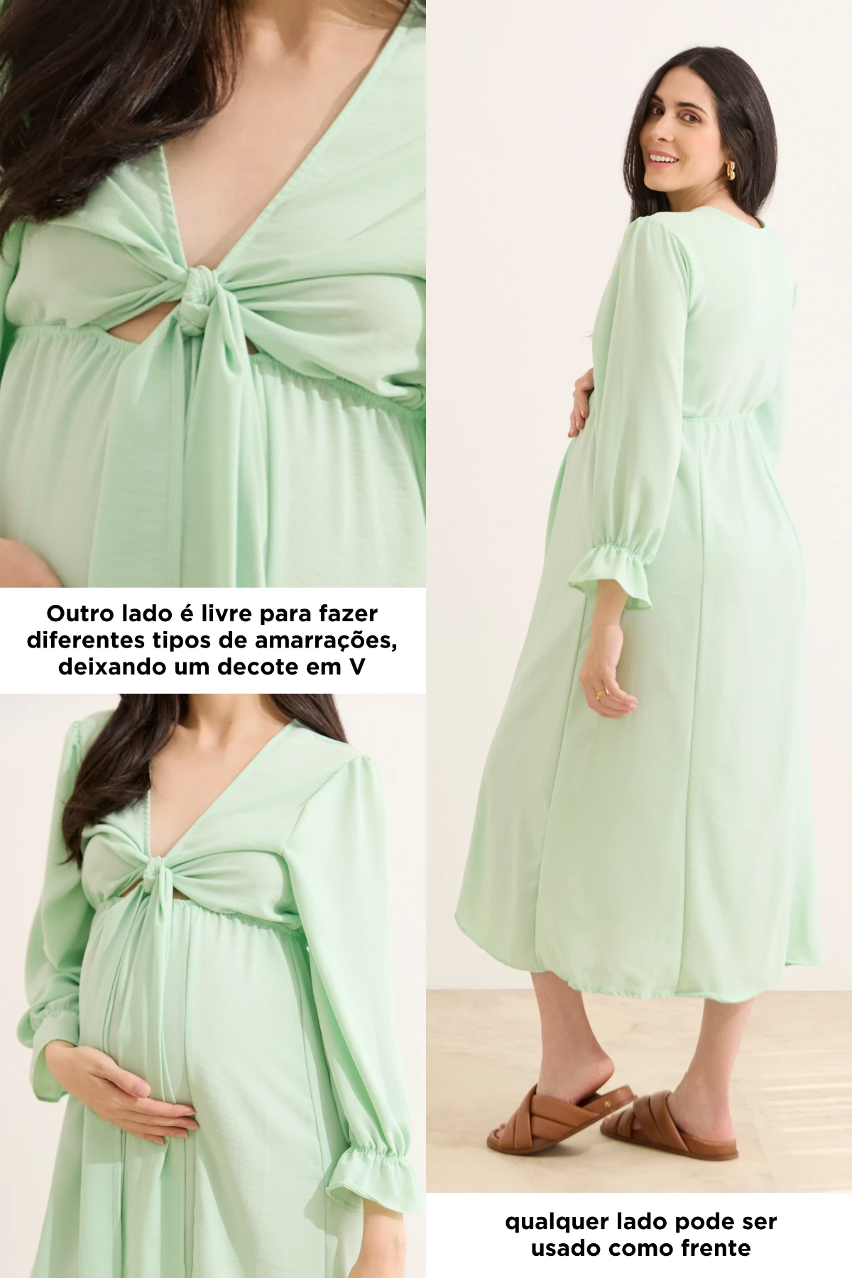 Vestido confeccionado em tecido plano e de comprimento longo com caimento leve e fluído, pensado para ser uma opção confortável de usar não somente durante a gestação, mas também para proporcionar momentos práticos na fase da amamentação. O vestido é super versátil, pois pode ser usado com qualquer lado para frente. Um lado é livre para fazer diferentes tipos de amarrações, deixando um decote em V; e o outro possibilita um decote fechado e discreto. As mangas são amplas no comprimento ideal de 3/4, com elástico próximo à barra. O vestido possui elástico na circunferência da cintura, que fornece flexibilidade e um ajuste adequado ao corpo.