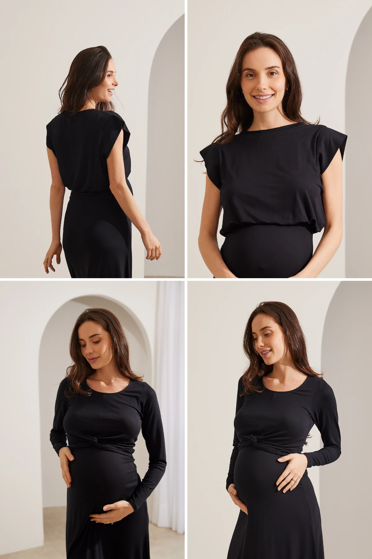 Vestido regata + vestido manga curta + vestido manga longa + 2 blusas! Tudo isso com somente 3 peças! O Trio Multilooks é composto por peças versáteis que podem ser usadas juntas ou separadas, na gestação ou na amamentação, no verão ou no inverno.