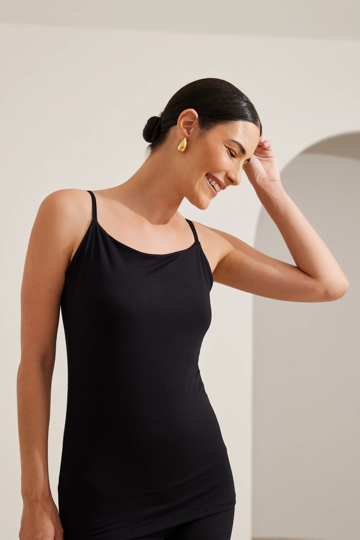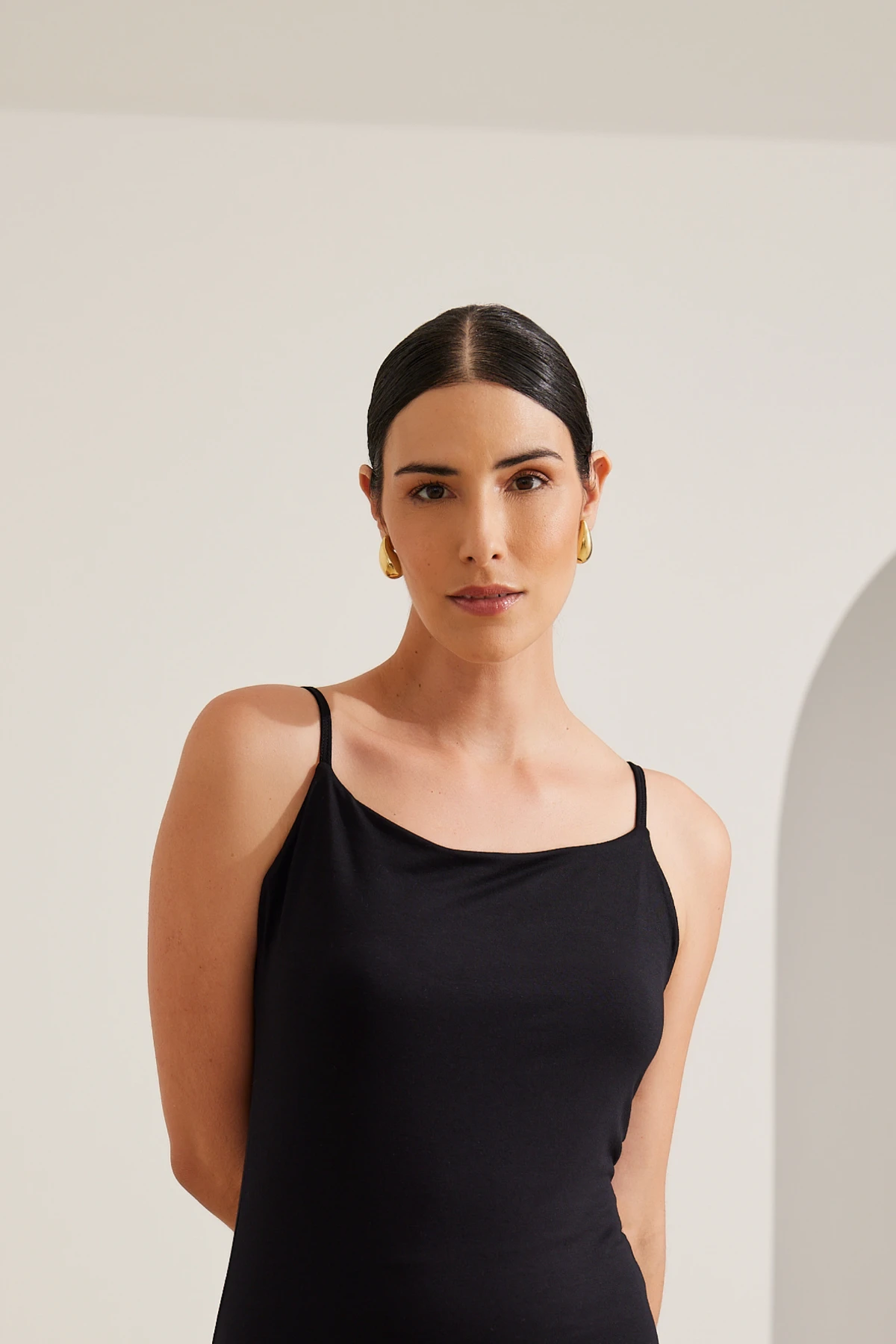Busto duplo com elástico interno: sustentação suave, ideal para usar sem sutiã.