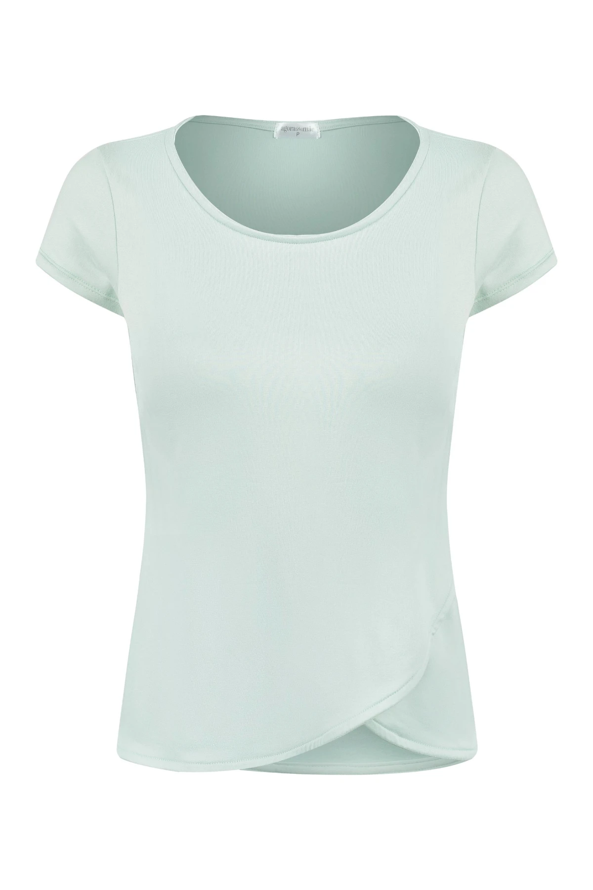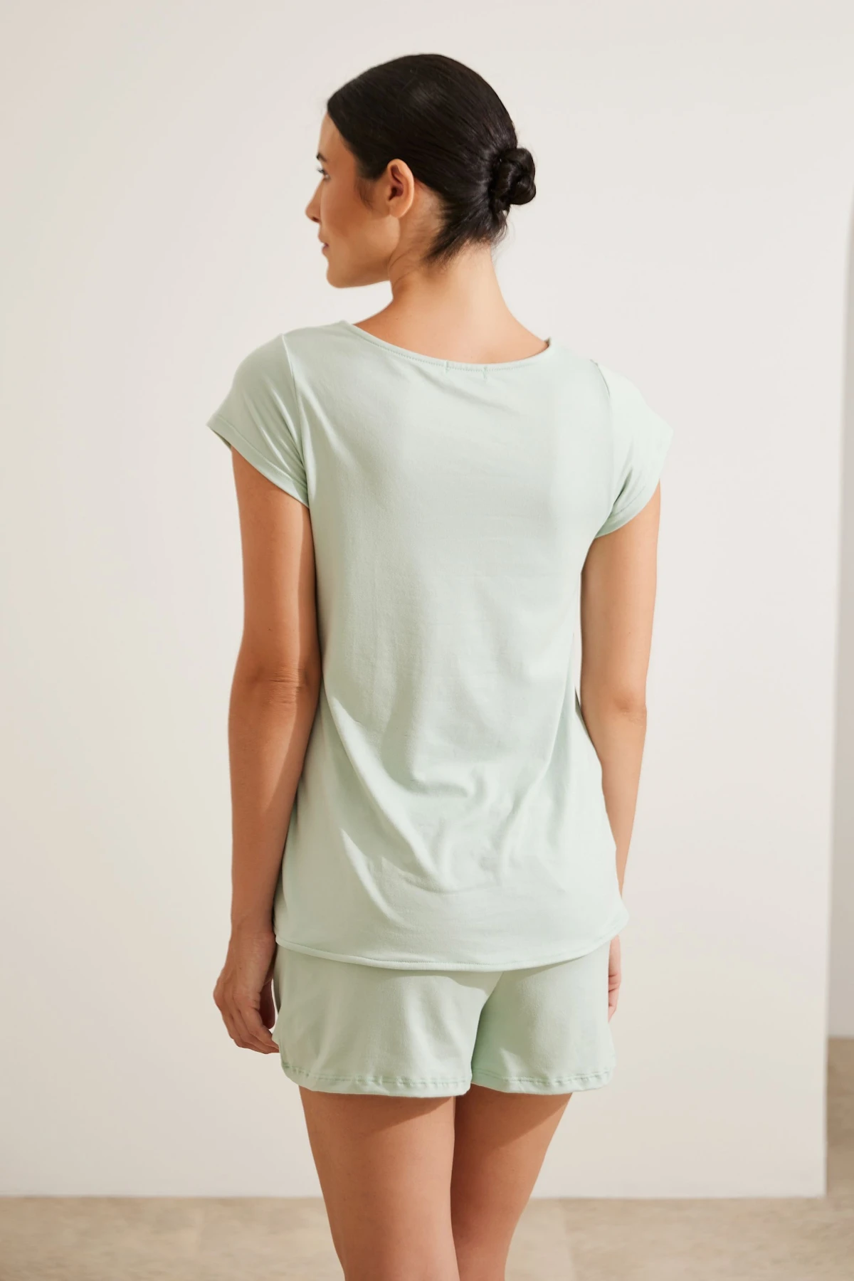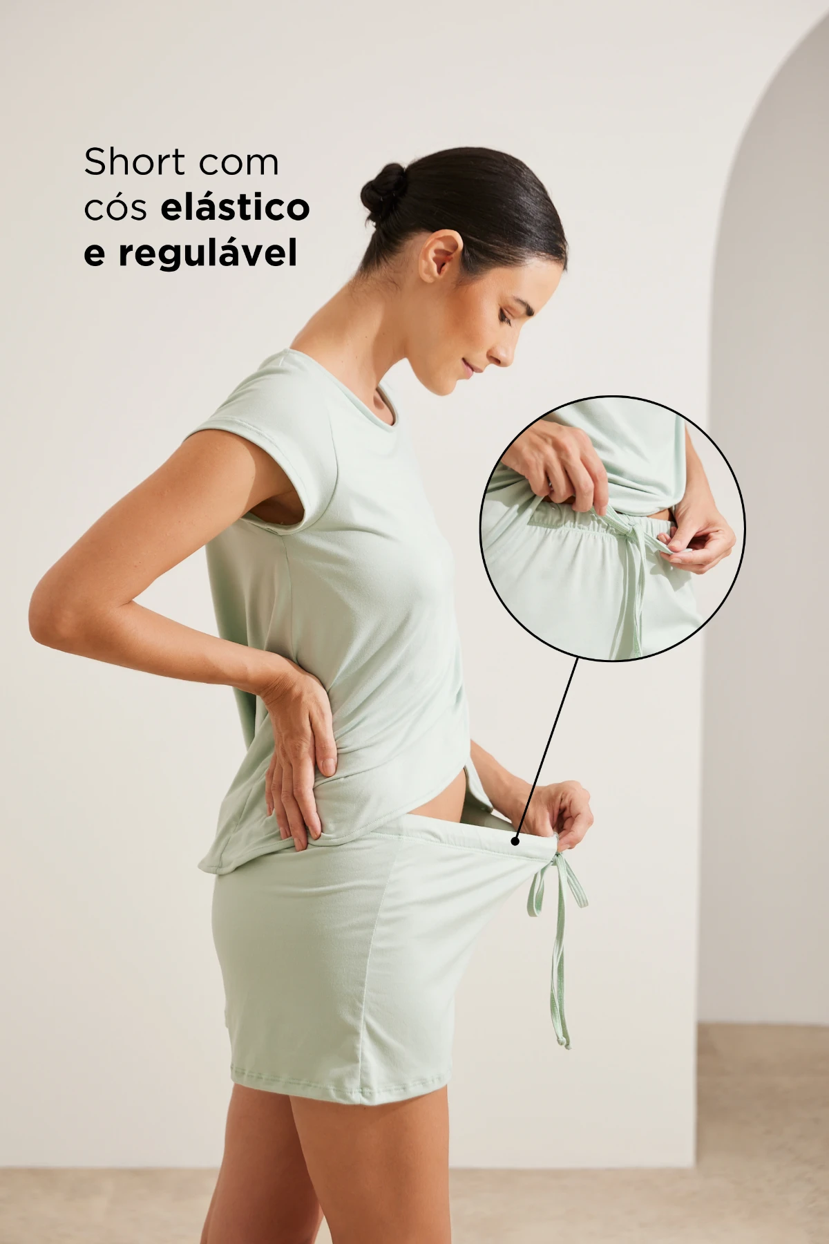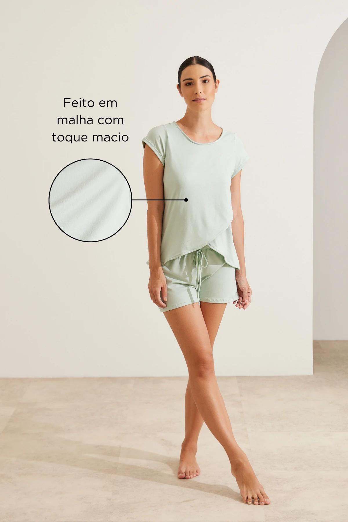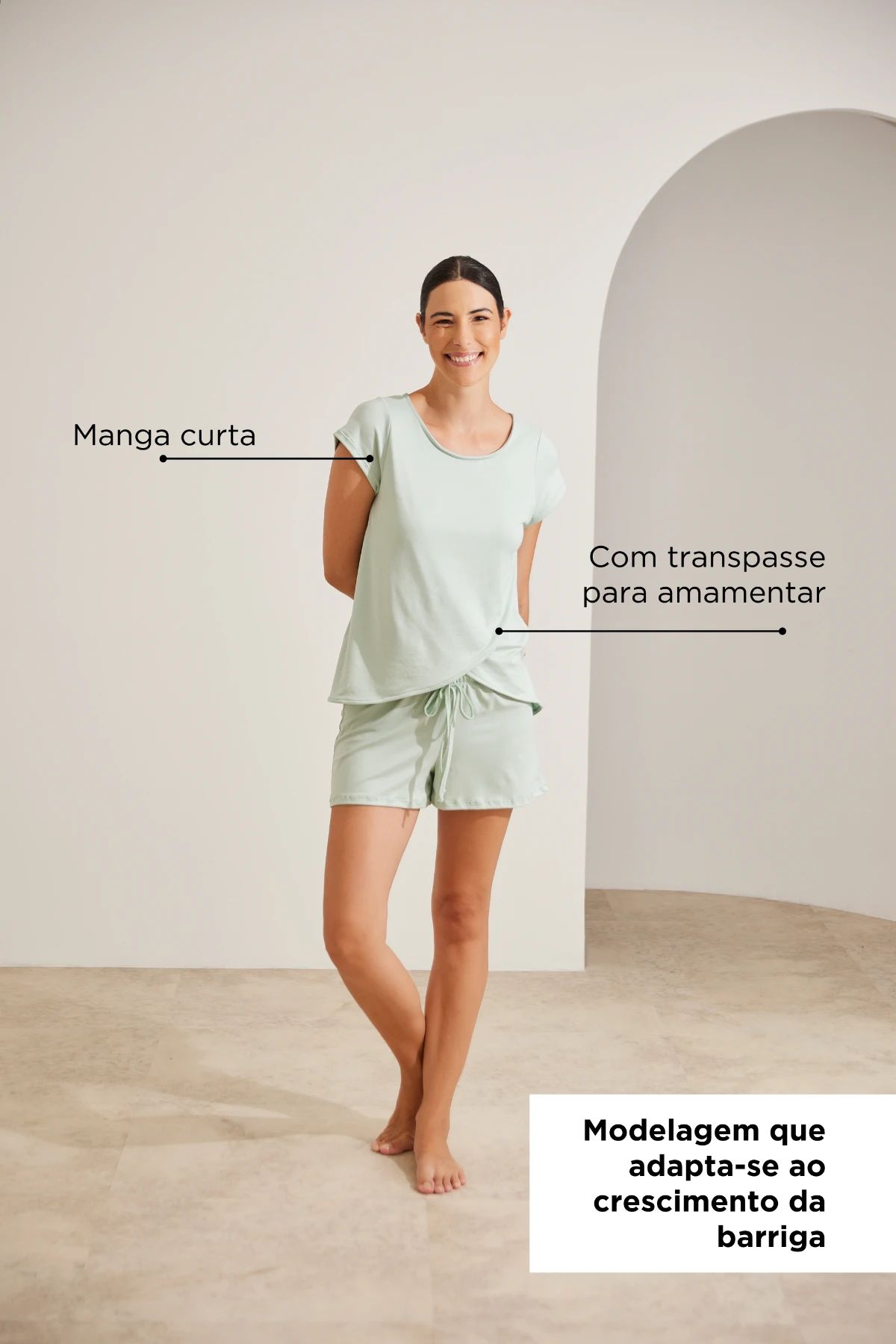 Pijama em malha suave com toque de nuvem. Composto por camiseta manga curta com recorte transpassado para amamentação e shorts com elástico e cordão na cintura para ajuste que acompanha o crescimento da barriga.