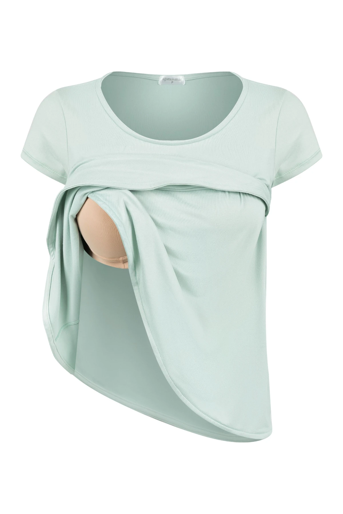 Pijama feito em malha com toque extremamente suave à pele, transmitindo a sensação de tocar em nuvens. Conjunto composto por camiseta manga curta com recorte transpassado na frente para amamentação e shorts com elástico e cordão na cintura, permitindo um ajuste confortável. Ambos são feitos com malha e modelagem estruturada que adapta-se ao crescimento da barriga durante toda a gestação.