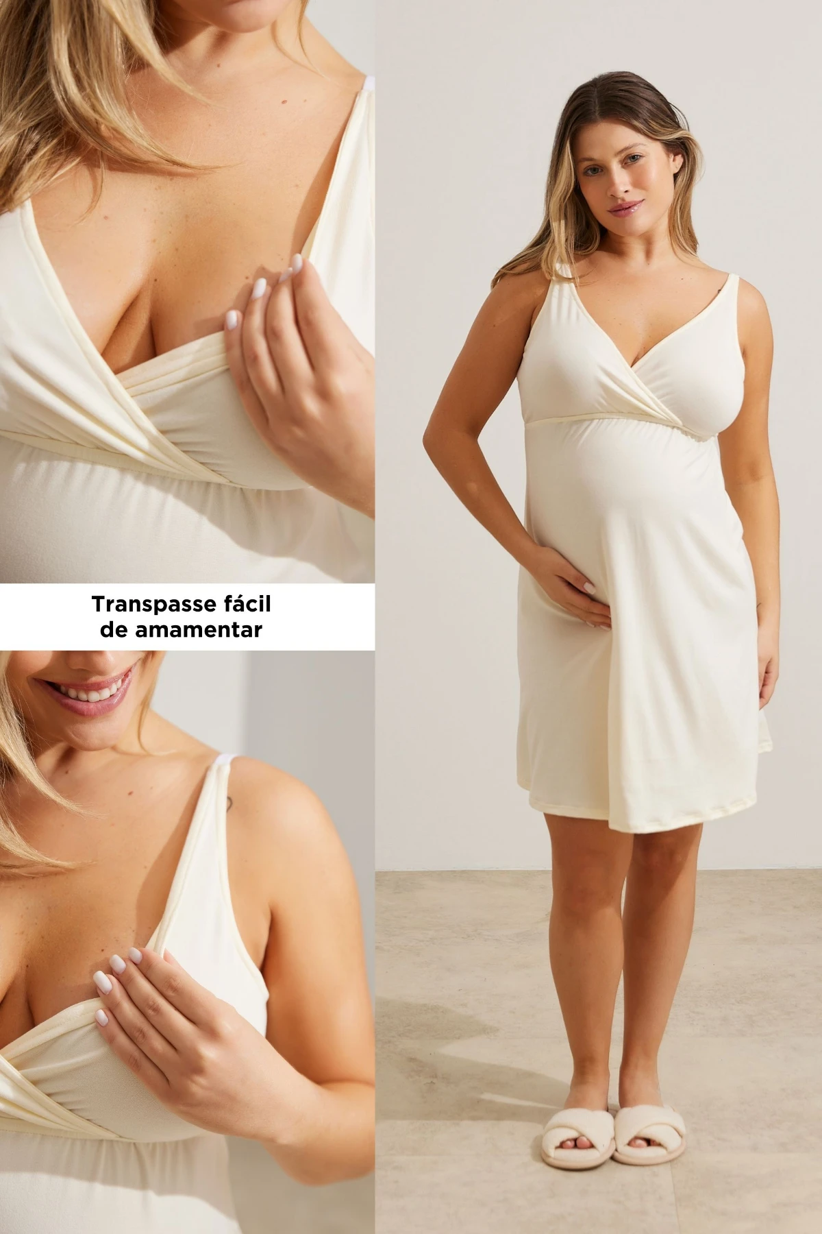 Camisola em malha suave com toque de nuvem. Decote transpassado, para facilitar a amamentação. Tem elástico abaixo do busto, o que garante a sustentação. Modelagem evasê. Acompanha o crescimento da barriga e possui comprimento curto até os joelhos.