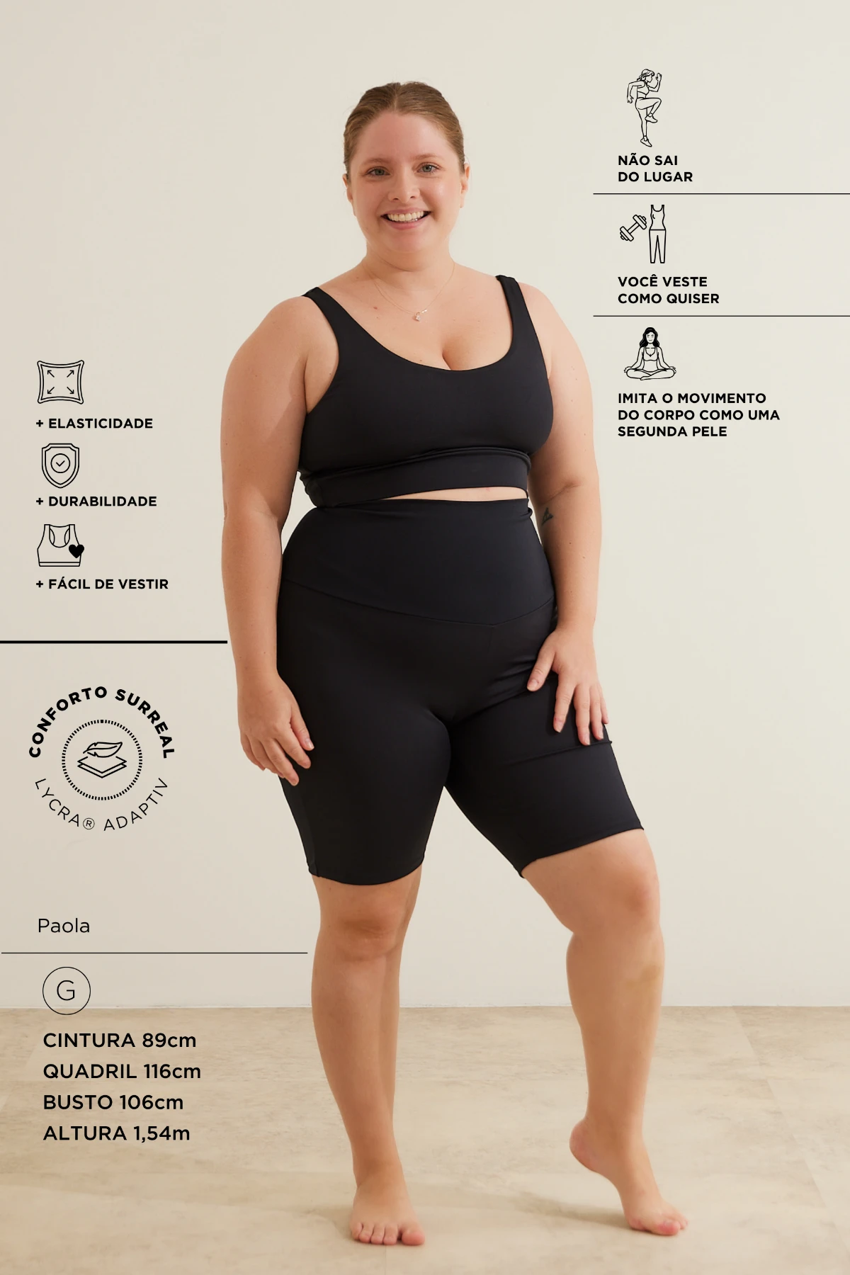 Tecnologia: LYCRA® ADAPTIV — ajuste flexível e recuperação do shape.