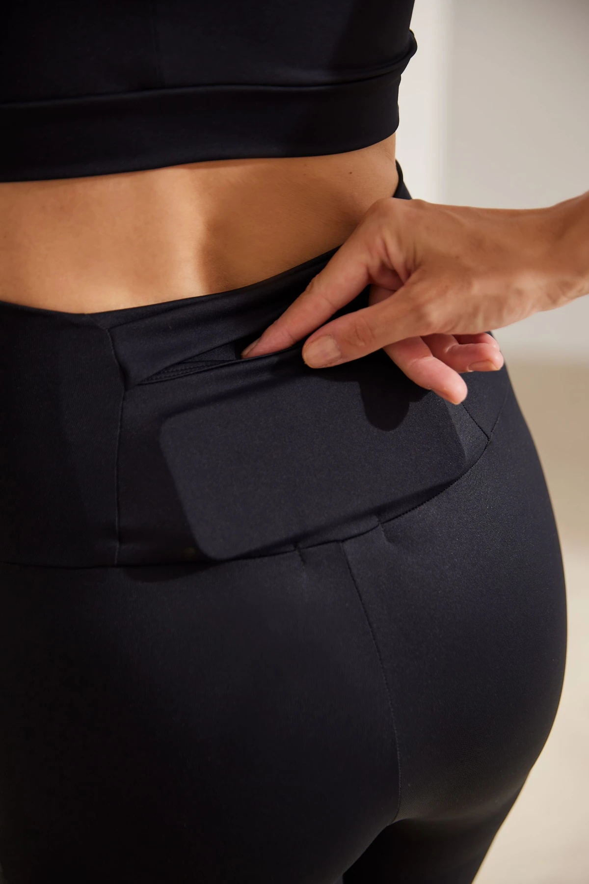 Funcionalidade: Bolso oculto no cós traseiro para celular.