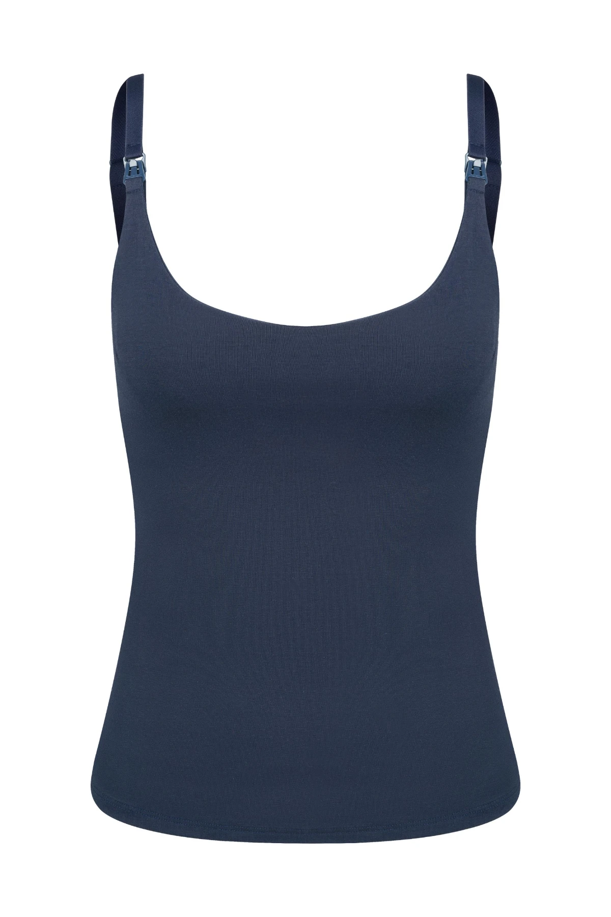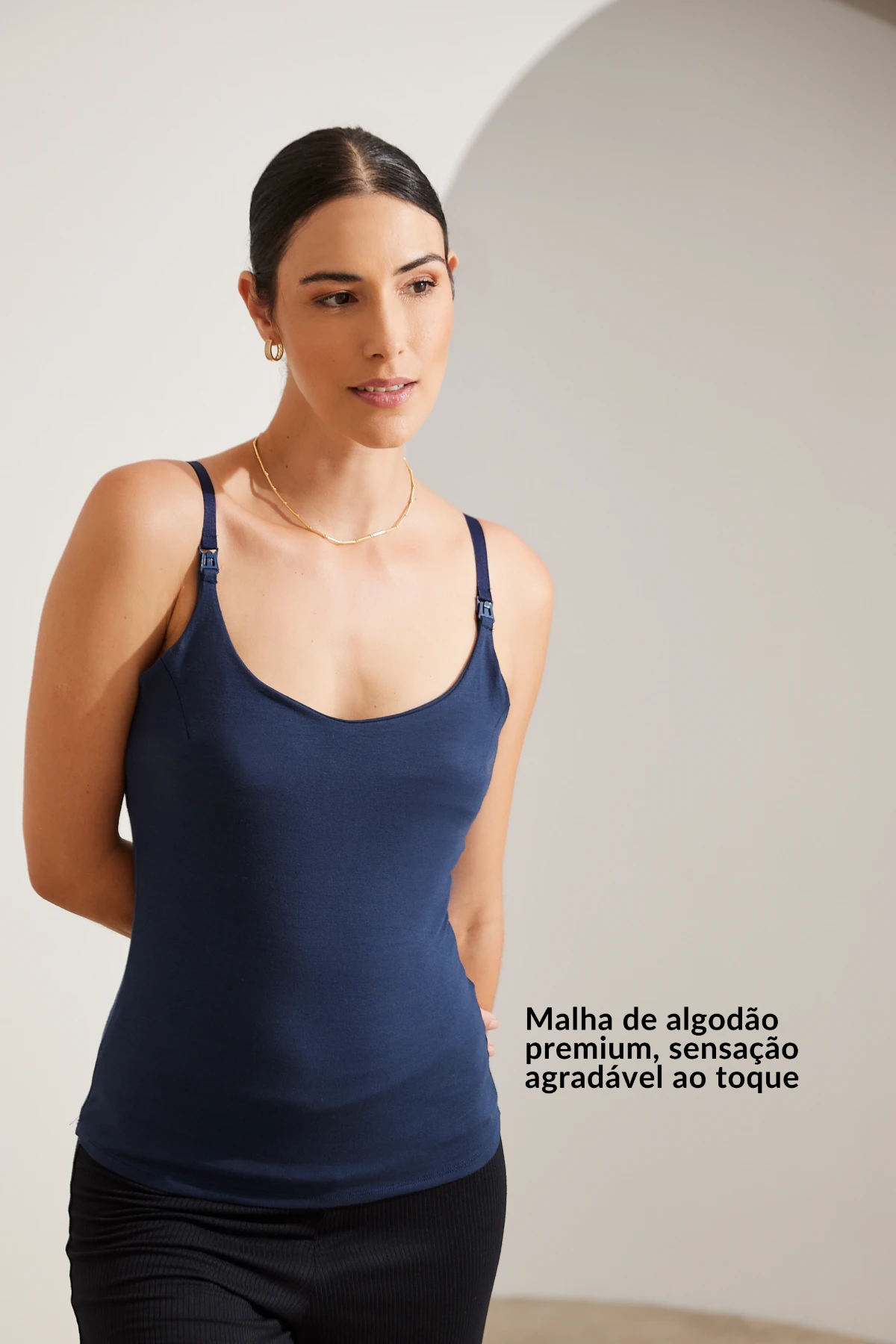 Feita em algodão premium, adapta-se ao corpo e possui alças com fecho click, busto duplo e elástico interno para amamentar com facilidade e conforto.