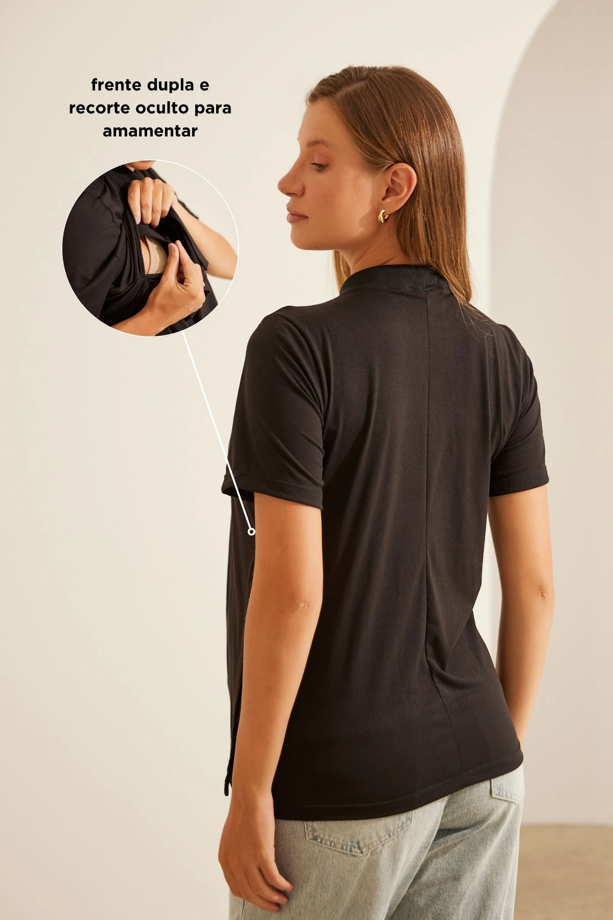 Camiseta básica feita em malha com toque extremamente macio. Não possui recortes aparentes e tem golinha em ribana. Sua modelagem possui frente dupla com abertura interna para amamentar, facilitando a amamentação de forma prática e discreta. Acompanha o crescimento da barriga durante a gestação sem apertar ou danificar a malha. Use em todas as fases da vida e em qualquer ambiente.