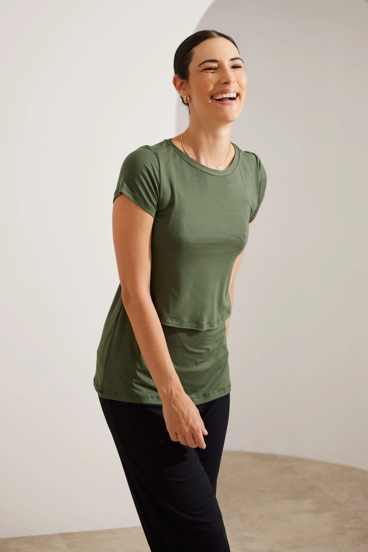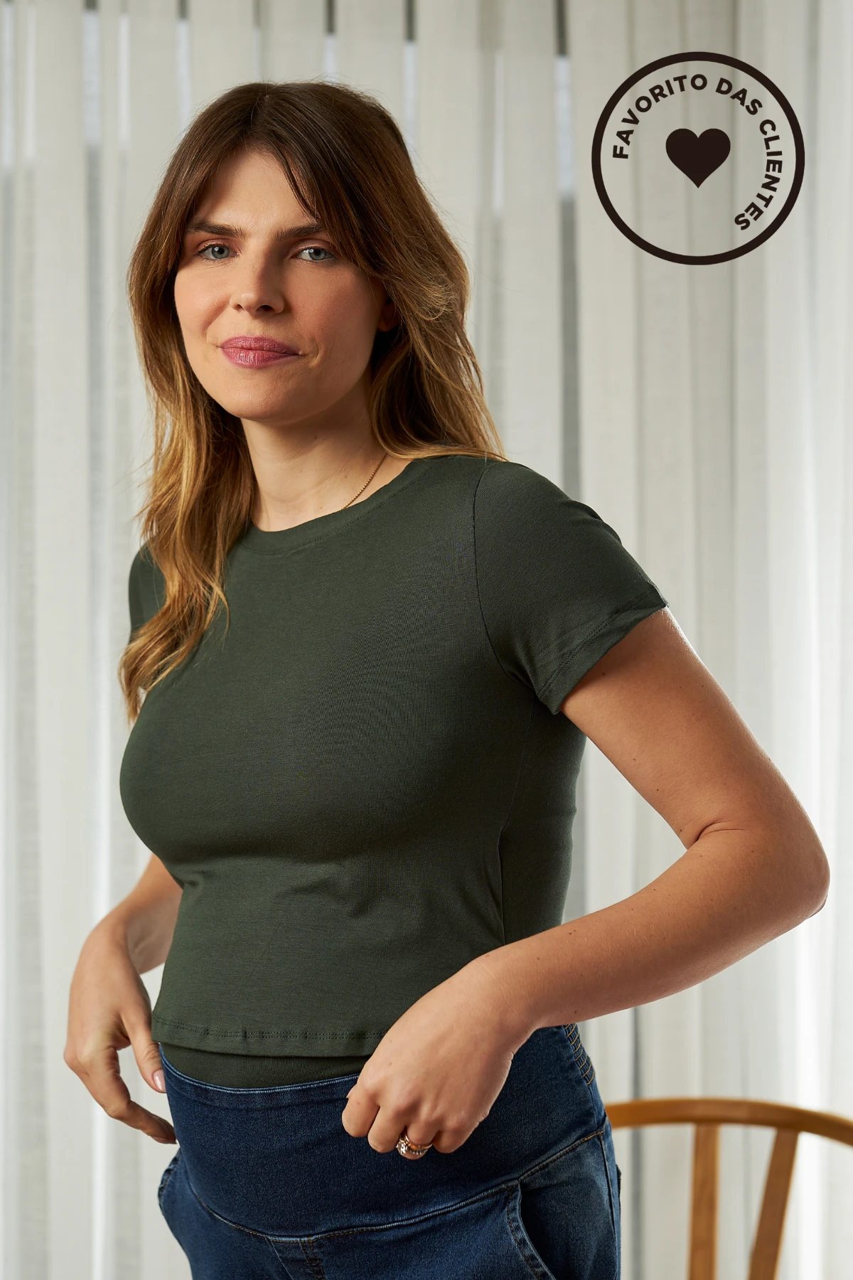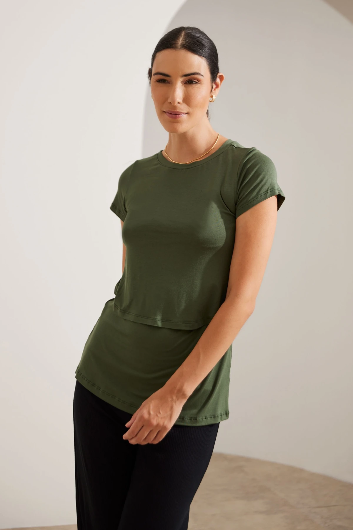 A Blusa Amamentação Prática resolve isso com duas camadas: use no comprimento normal para mais cobertura ou como cropped para um visual moderno.