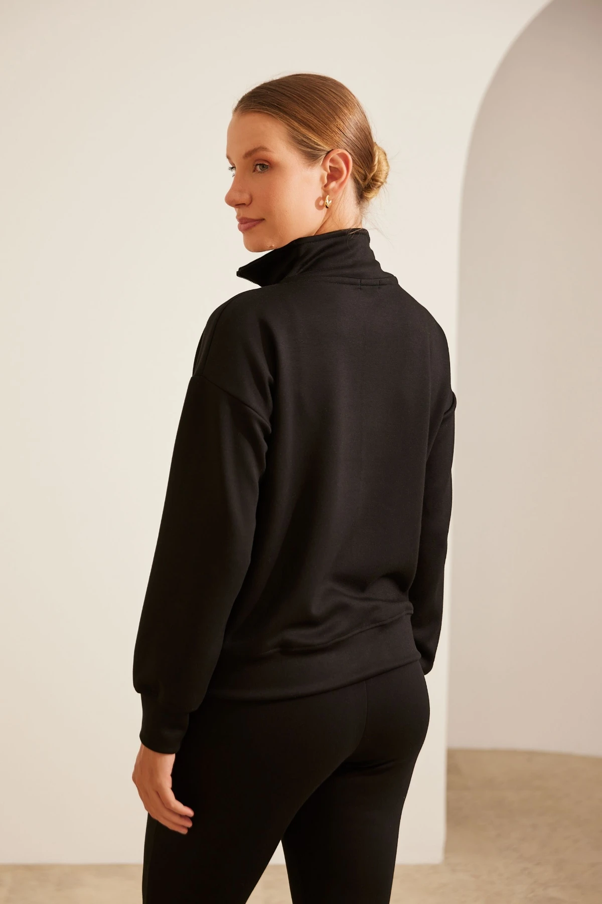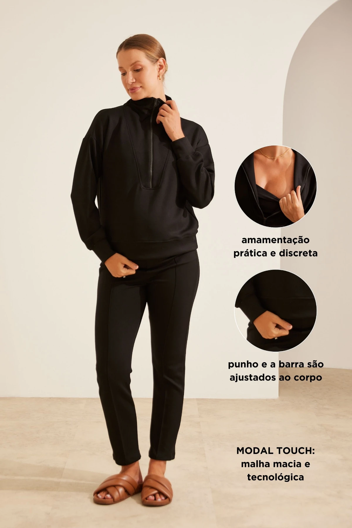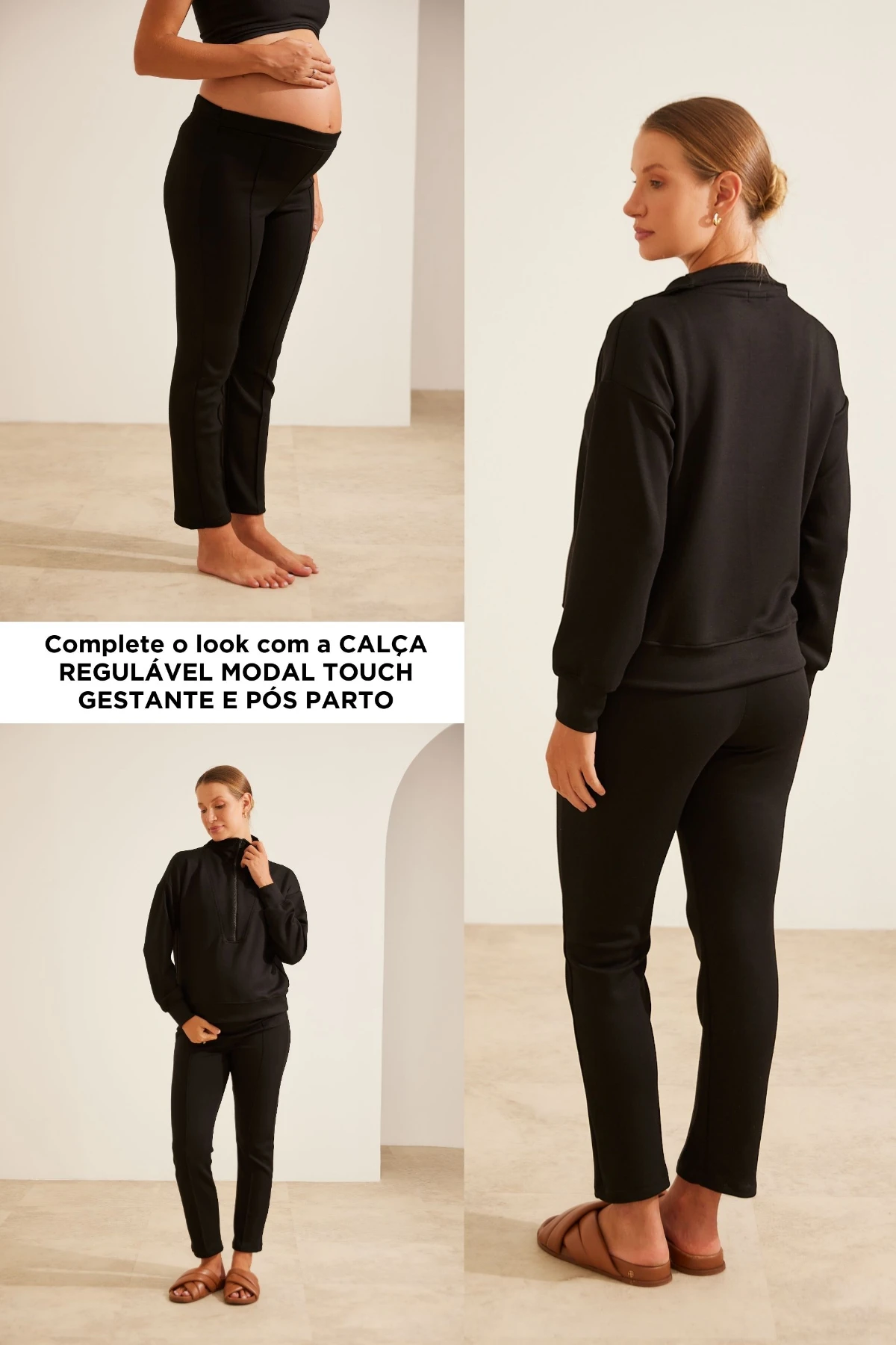 Blusa em malha que simula o toque macio do modal. O zíper na parte frontal tem a medida ideal para uma amamentação prática. A gola pode ser usada dobrada ou alta até o pescoço. A peça tem muita elasticidade e corte ideal para acompanhar toda a gestação.