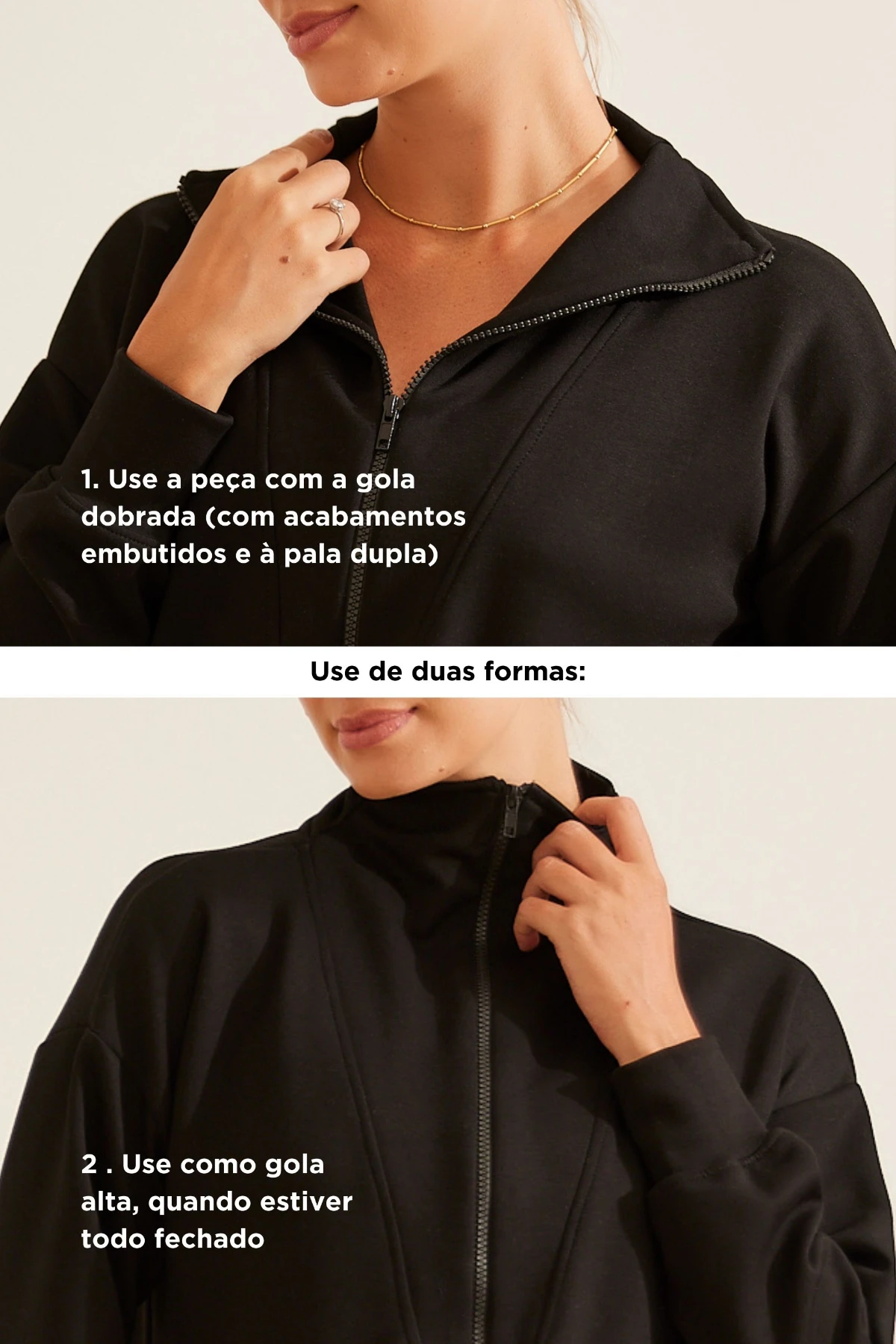 Possui zíper na frente com a medida certa para uma amamentação fácil e prática. Esse zíper permite que você use a peça com a gola dobrada ou, quando estiver todo fechado, com a gola alta, devido aos acabamentos embutidos e à pala dupla.