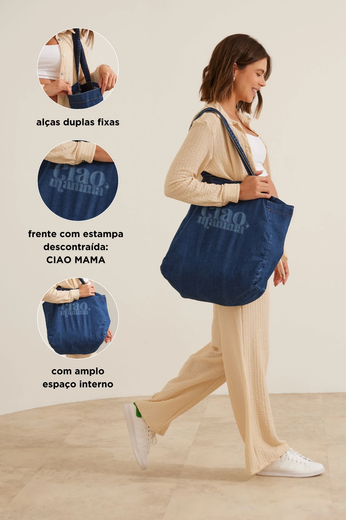 A Bolsa Tote Ciao Mamma é espaçosa, funcional e cheia de estilo. Feita em jeans de algodão, tem amplo compartimento interno, necessaire fixa com zíper e estampa exclusiva que celebra a maternidade com leveza.