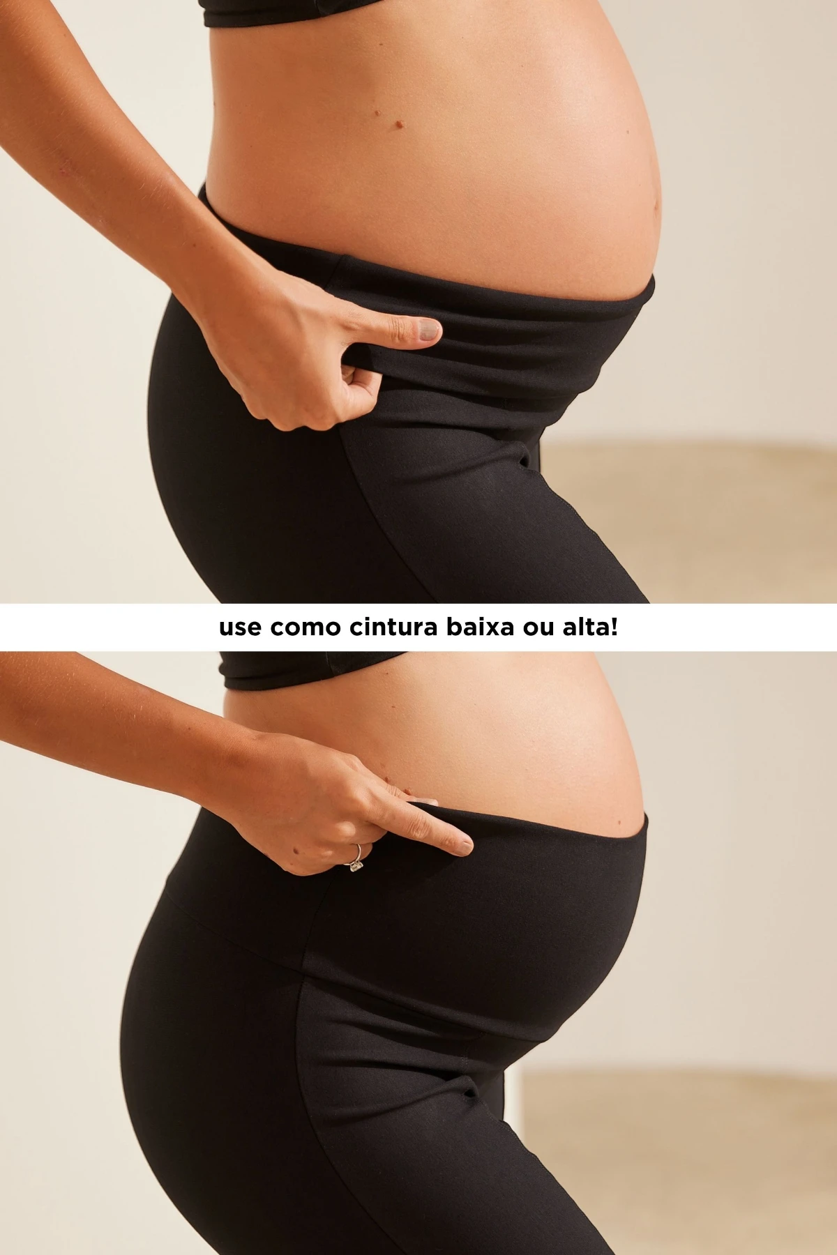Ajuste: Não enrola na cintura; encaixe confortável do 1.º ao 3.º trimestre e no pós-parto.