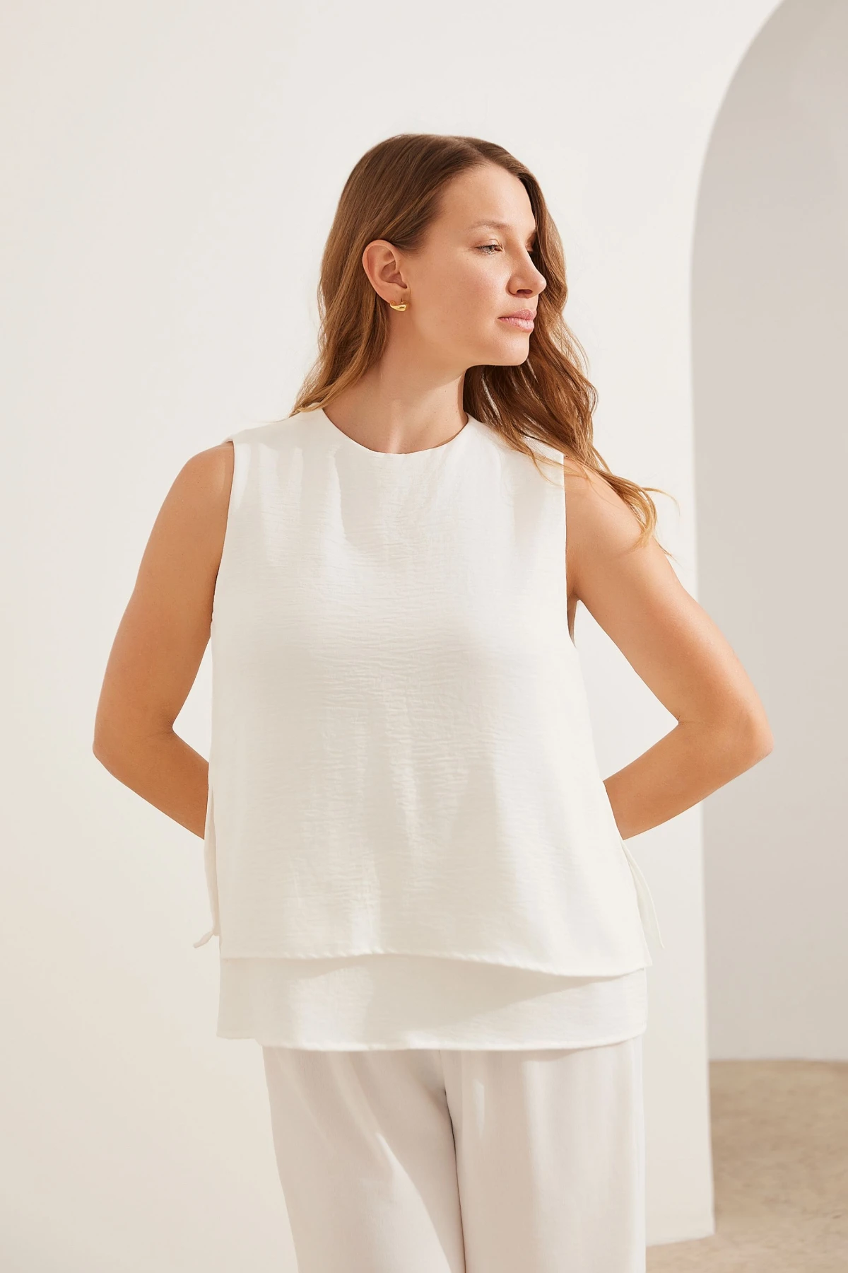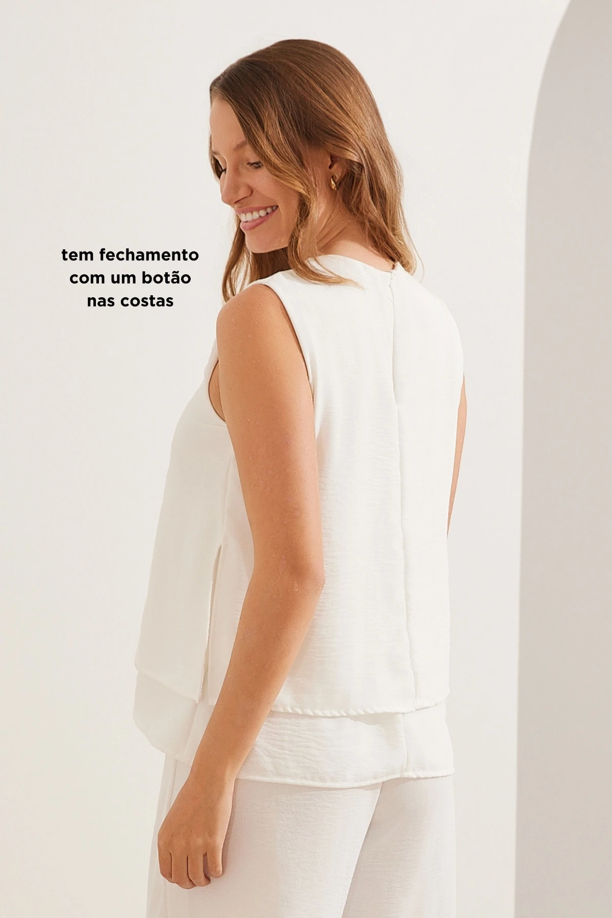 A regata conta com sobreposição moderna com fenda nas laterais e forro interno com abertura discreta, que tornam a amamentação prática, fácil e reservada. O decote redondo com fechamento em botão nas costas adiciona um toque delicado e feminino ao visual, perfeito para o dia a dia ou para compor looks mais arrumados.
