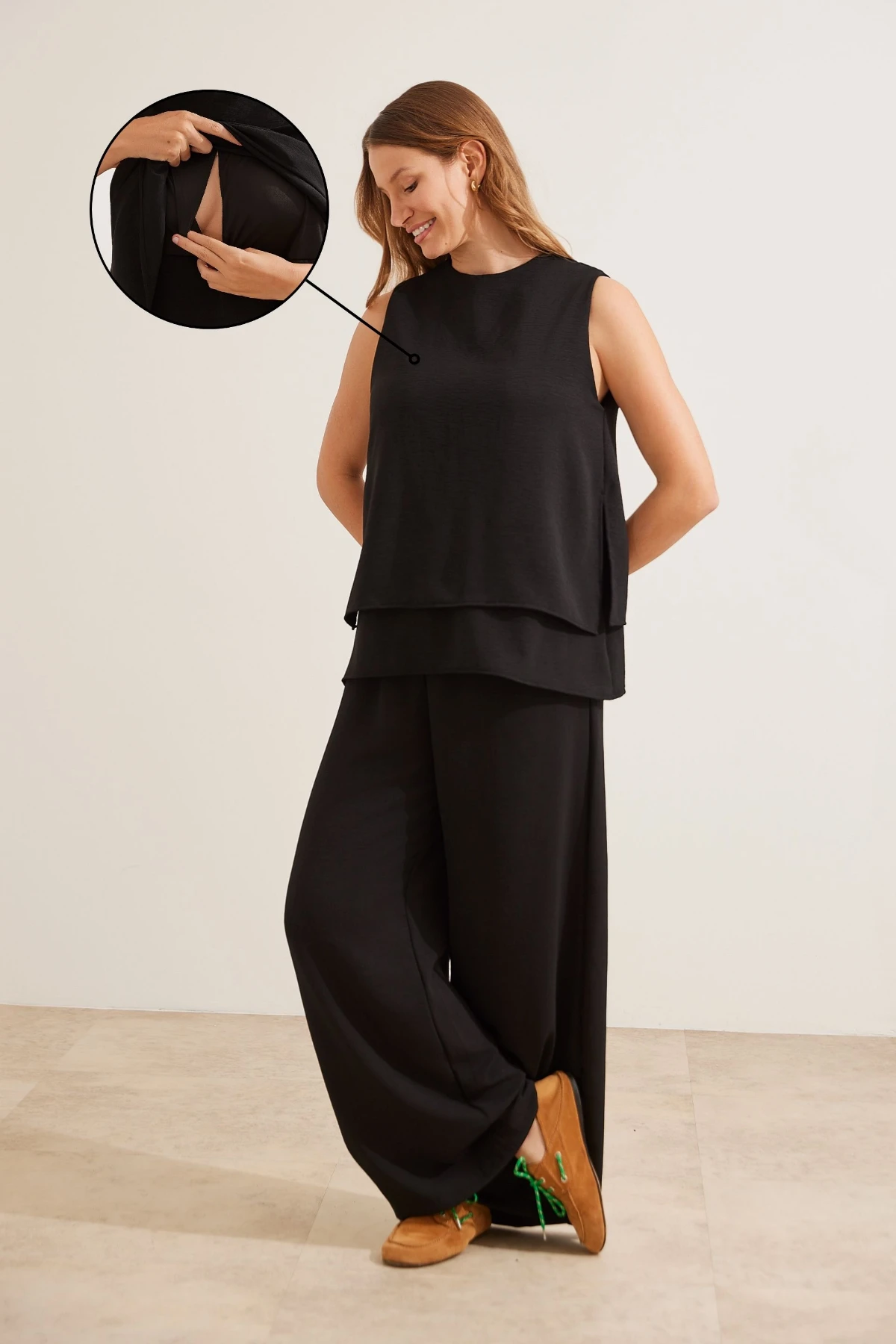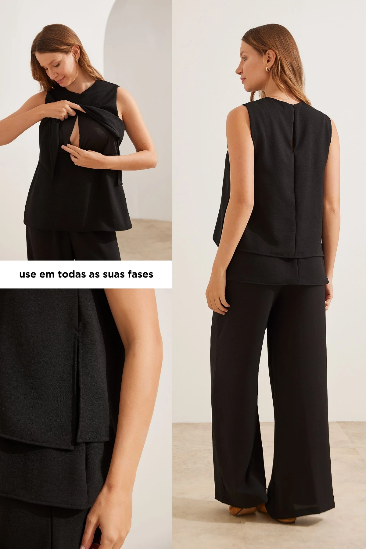 Confeccionada em tecido plano fluido, possui sobreposição com abertura lateral e forro interno que garante uma amamentação fácil e discreta — ideal para todas as fases da maternidade.