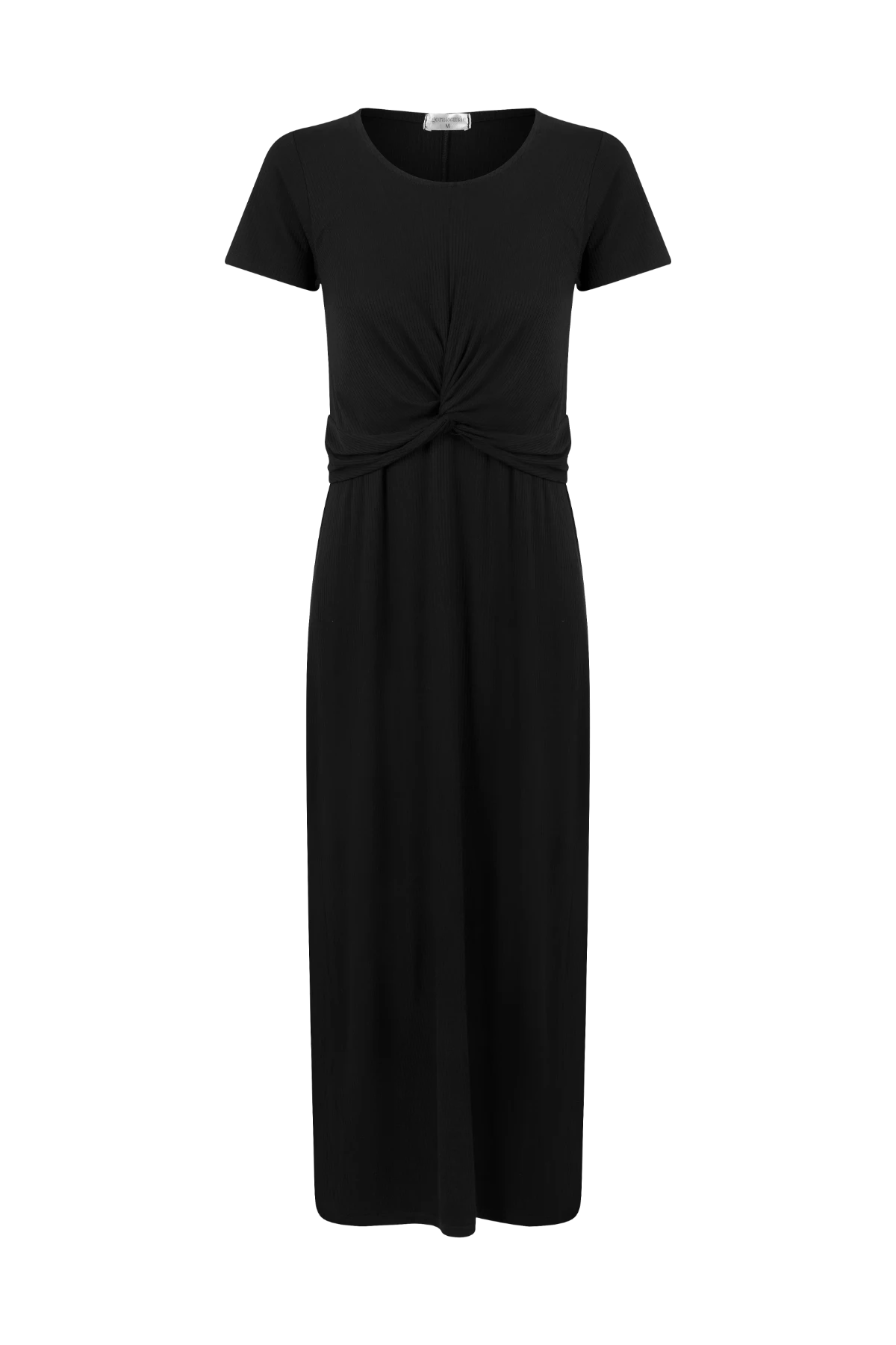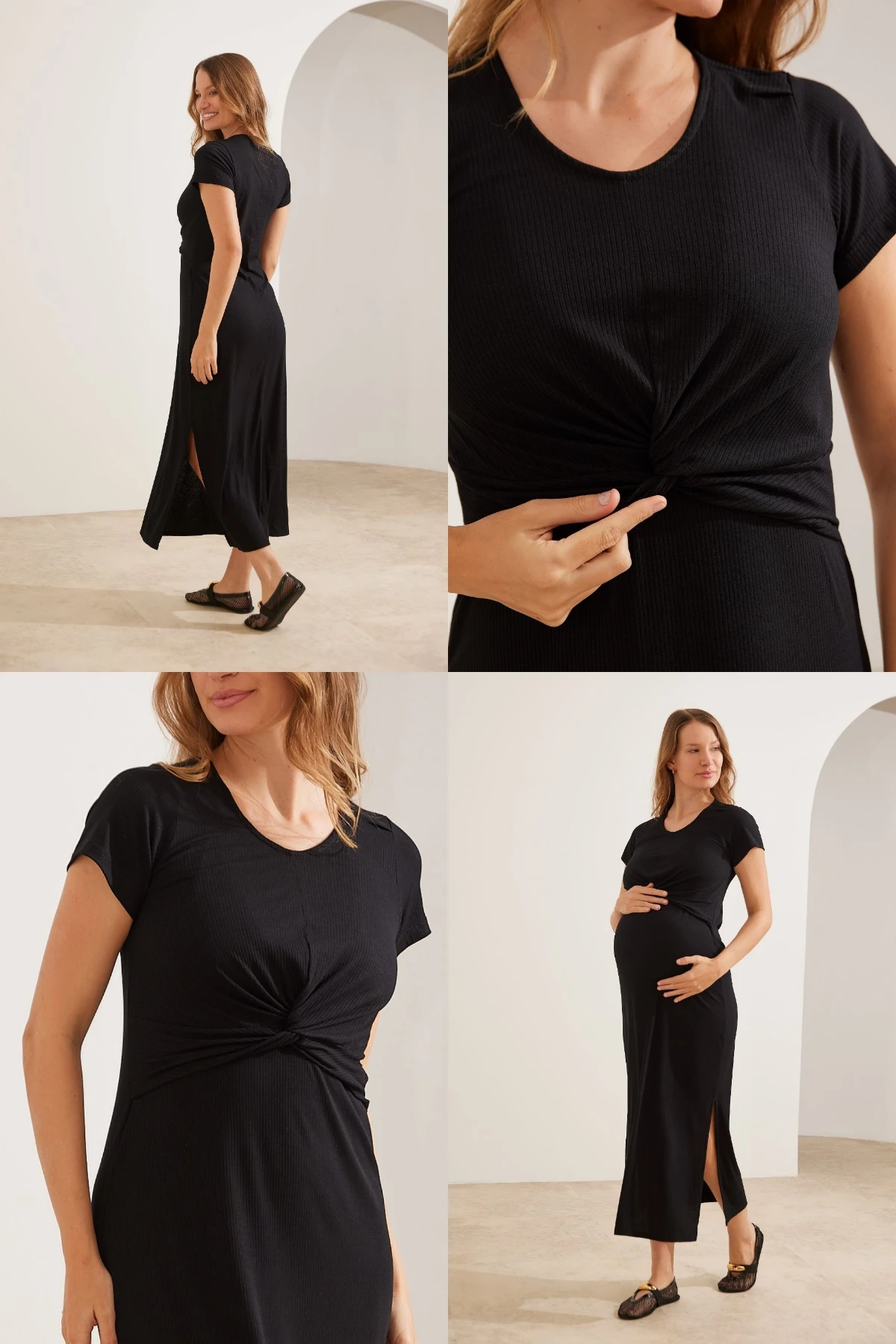 Vestido longo com fendas laterais, produzido em malha canelada de viscose com elastano. Desenvolvido em modelagem perfeita para acompanhar o crescimento da barriga, pois seu tecido se ajusta ao corpo. Possui mangas curtas, e decote redondo fechado, com sobreposição no busto, tem detalhe em nó, e recorte transpassado interno que auxilia na sustentação dos seios, e facilidade para amamentar. Super confortável, e prático para usar sempre.