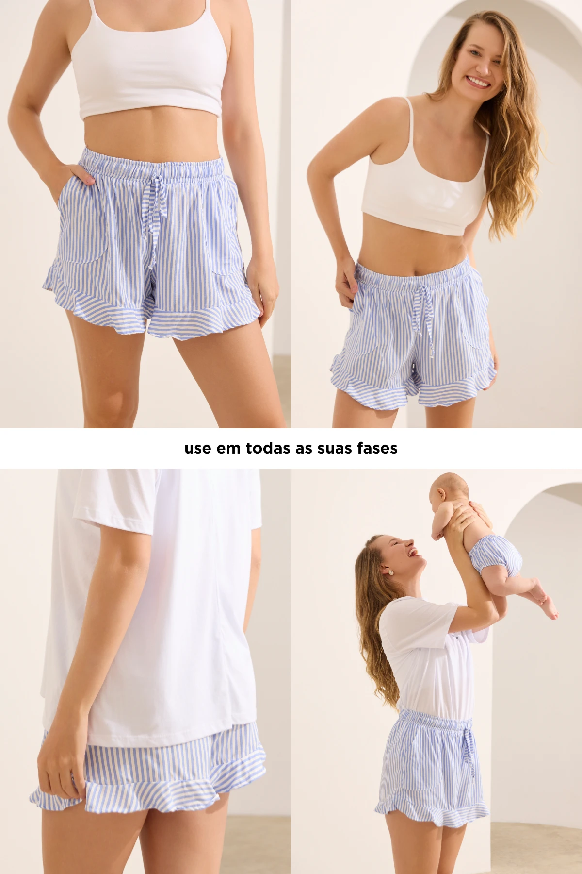 Short leve e fresquinho feito com tecido plano 100% viscose. Com modelagem soltinha e babados na barra. Possui elástico embutido no cós que se ajusta ao crescimento da barriga, enquanto o cordão feito do mesmo tecido permite uma regulagem personalizada. Possui bolsos funcionais na frente, garantindo praticidade em todos os momentos.