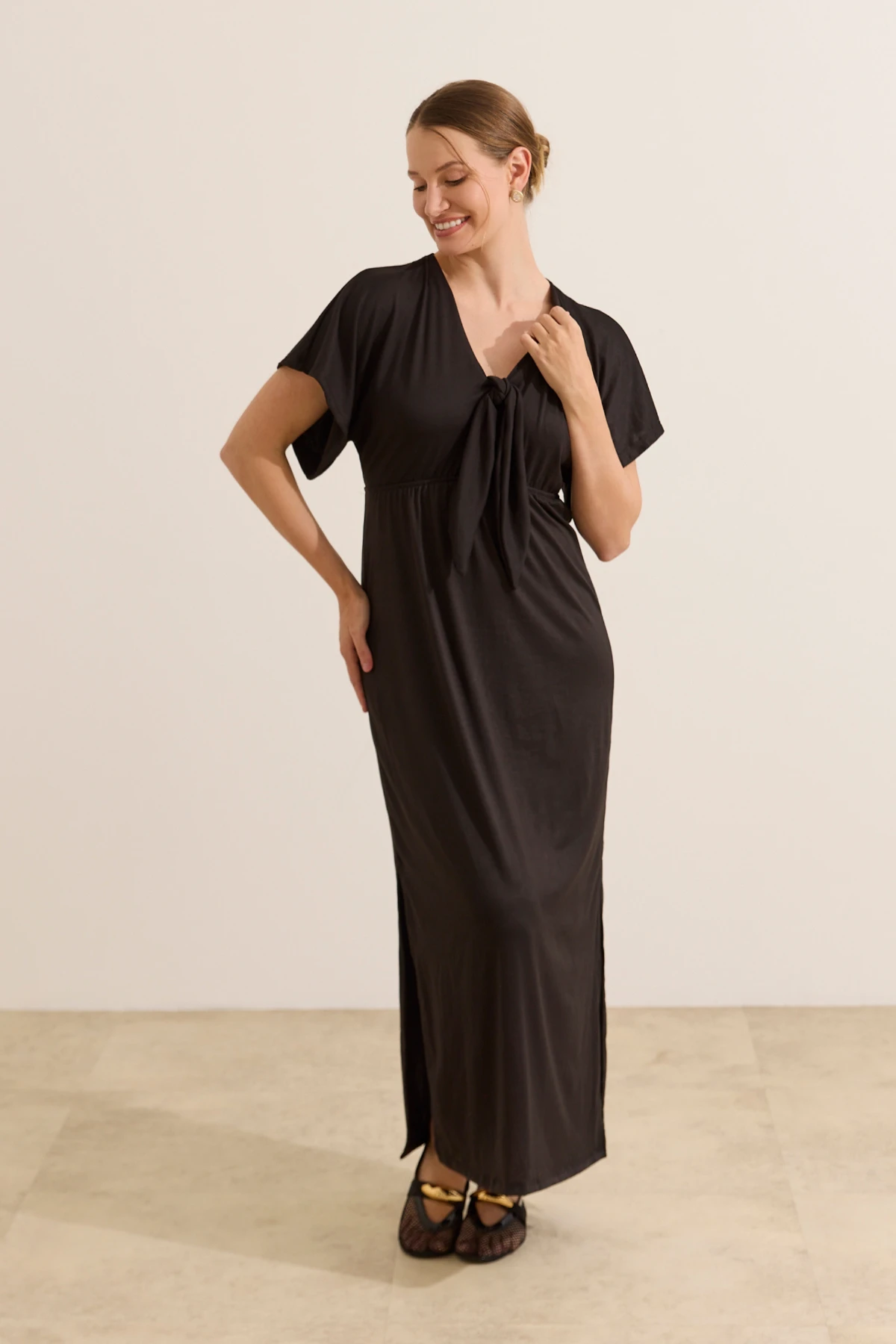 Vestido longo, feito em malha com toque macio. Tecido com elasticidade perfeita para acompanhar o crescimento da barriga durante toda a gestação. Modelagem com caimento leve e soltinha. Possui amarração no busto para um ajuste confortável e prático para amamentar, além de elástico embutido na circunferência abaixo do busto garantindo mais segurança e sustentação. Com fendas nas laterais da barra que oferece mais liberdade de movimento e conforto o dia todo e em todas as fases da maternidade.