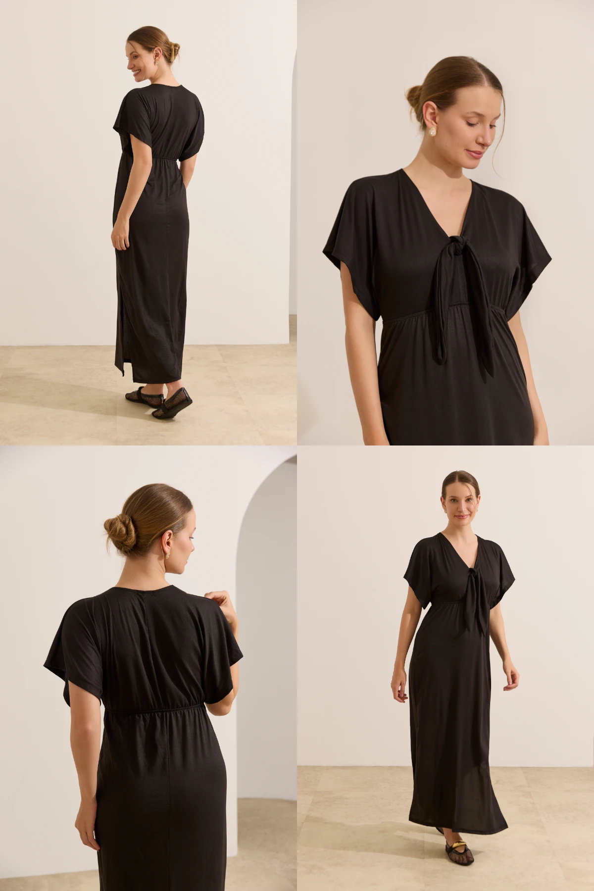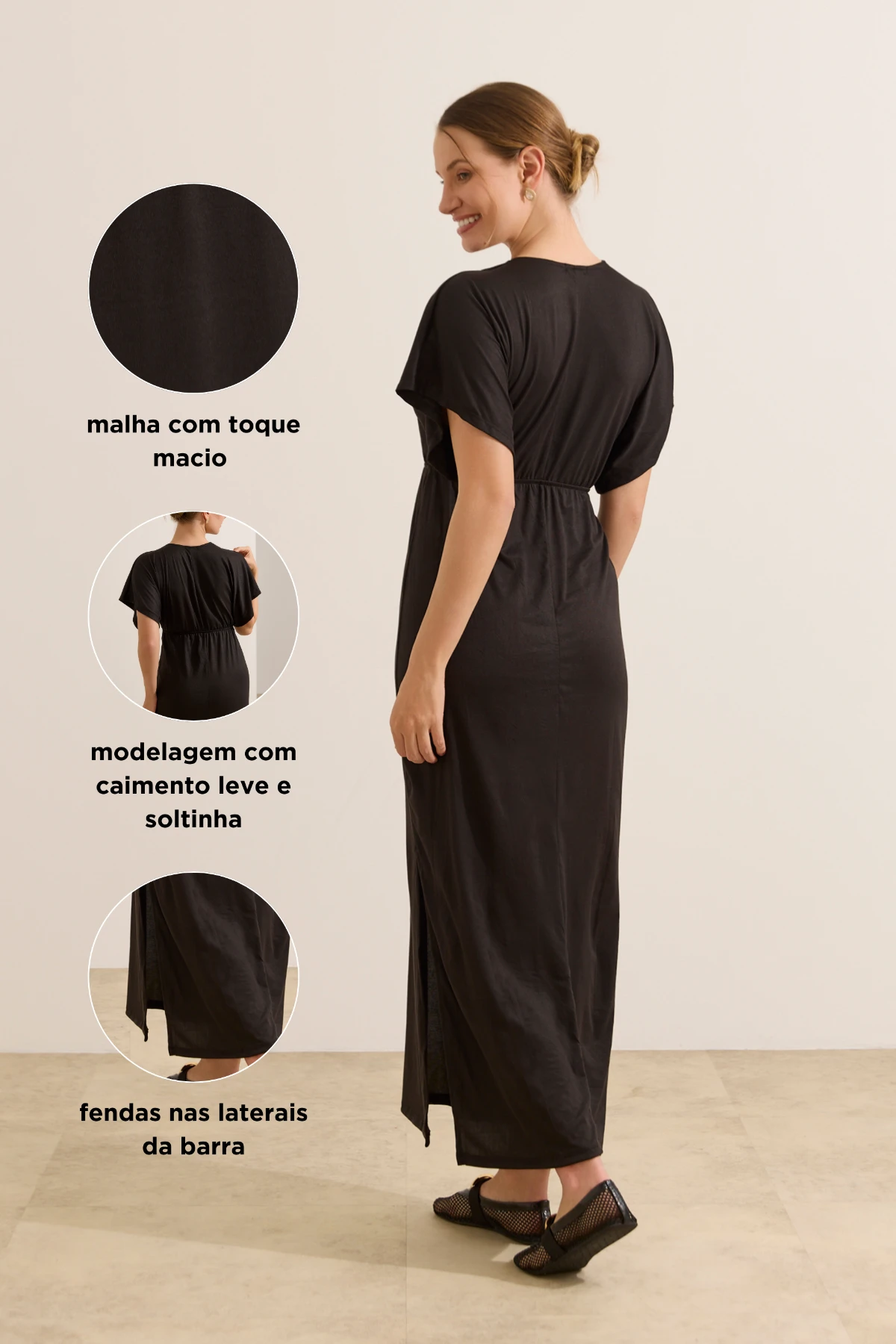 Vestido longo de malha macia e suave. Modelagem com caimento leve e soltinha, possui amarração prática para amamentar. Com elástico embutido abaixo do busto e fendas nas laterais da barra. Perfeito para acompanhar todas as fases da maternidade, pois o tecido tem elasticidade que acompanha o crescimento da barriga durante a gestação, não marca e nem deforma a peças, com conforto, praticidade e liberdade de movimento.